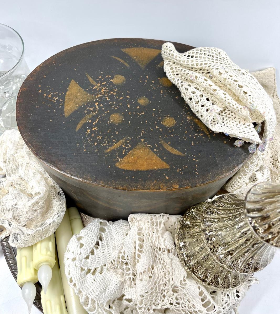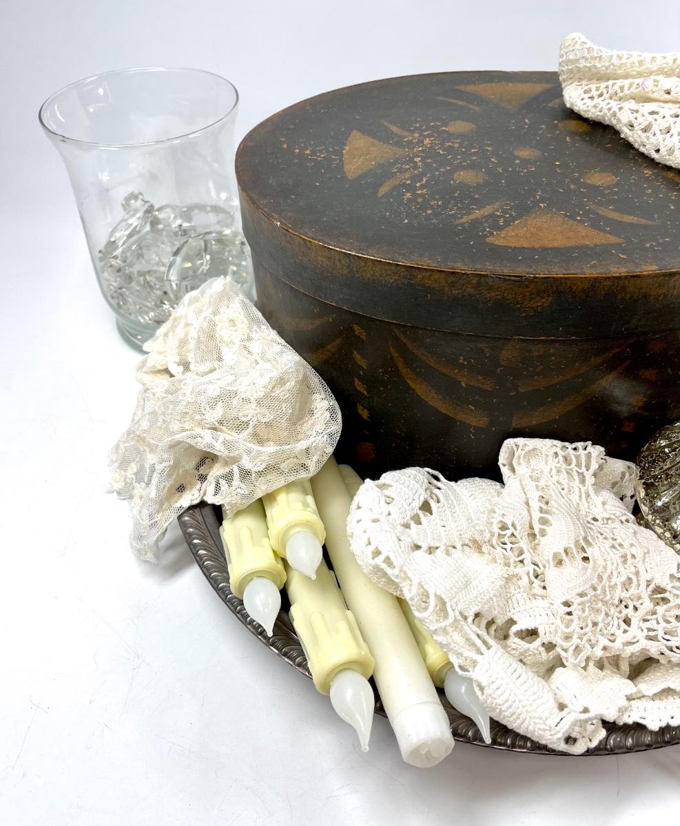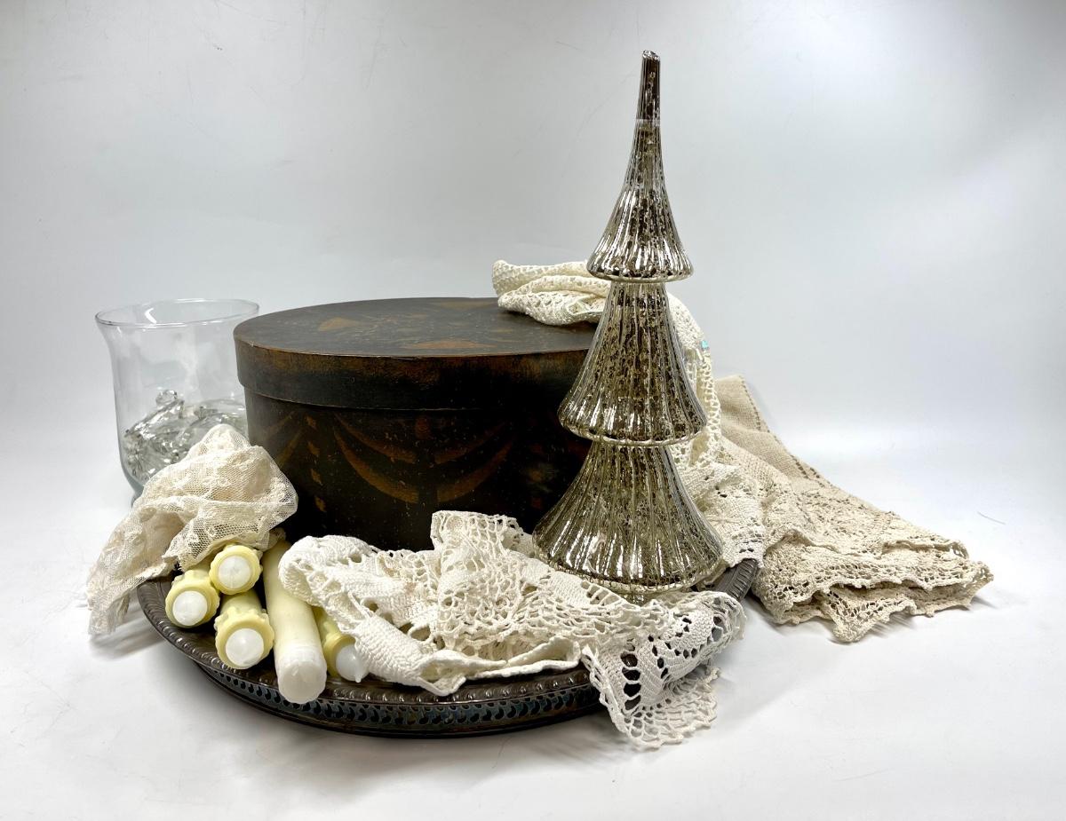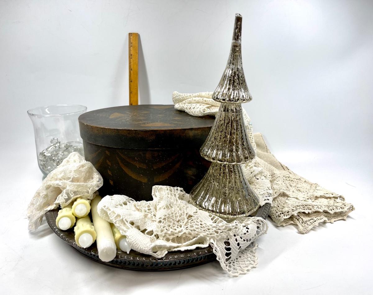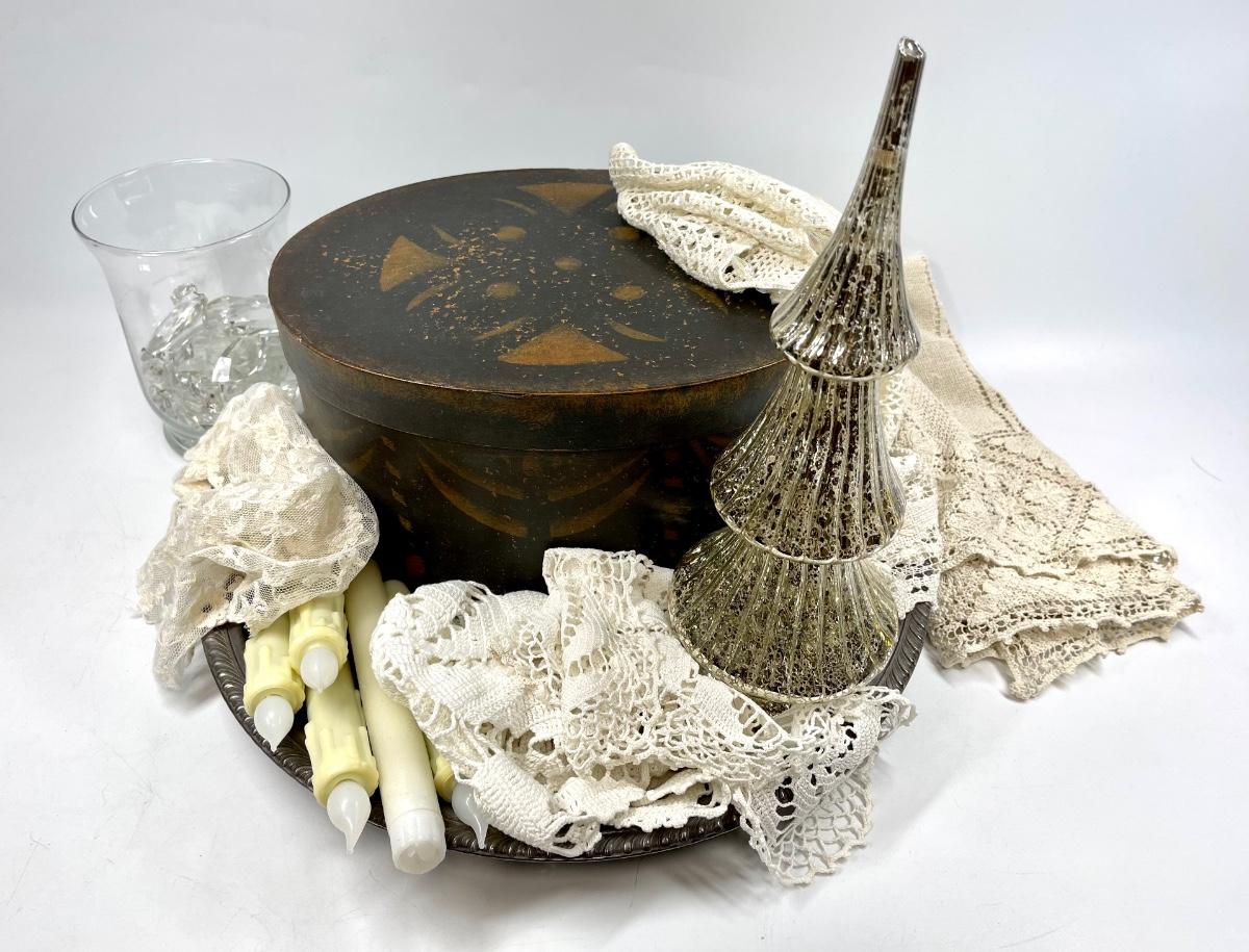 Lot of hat box, doily linen, glass Christmas tree decor and more