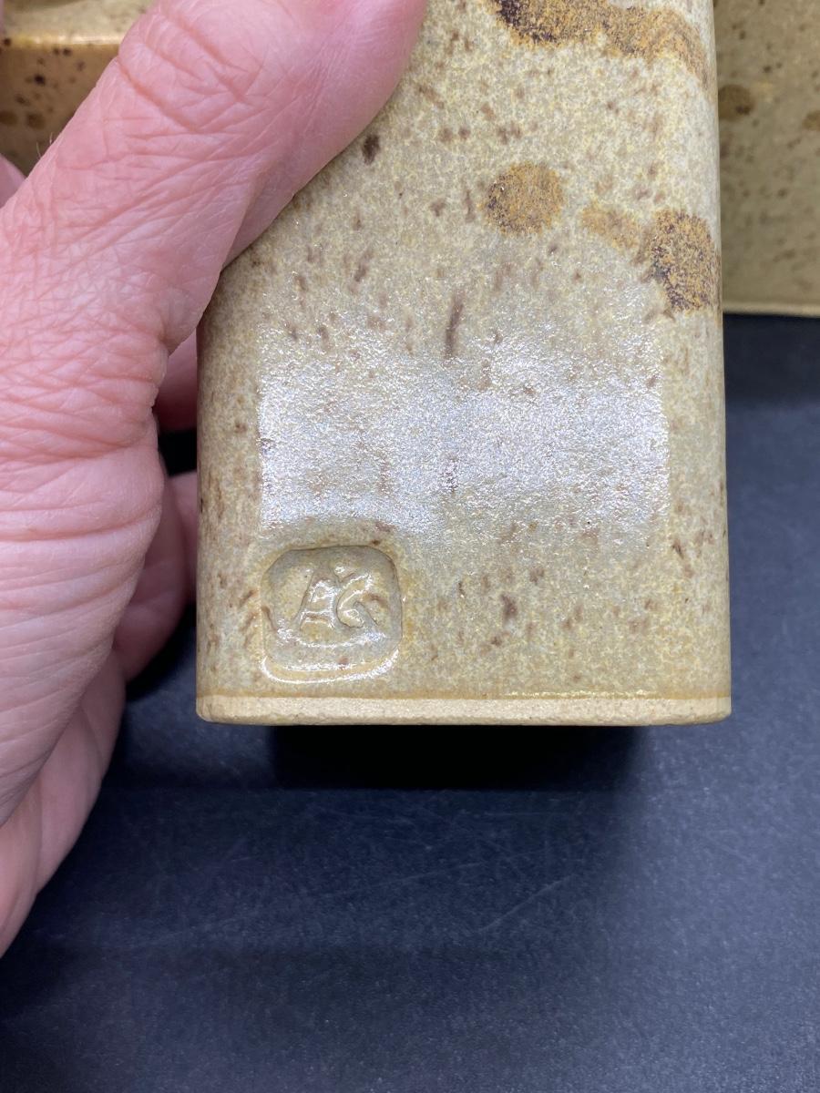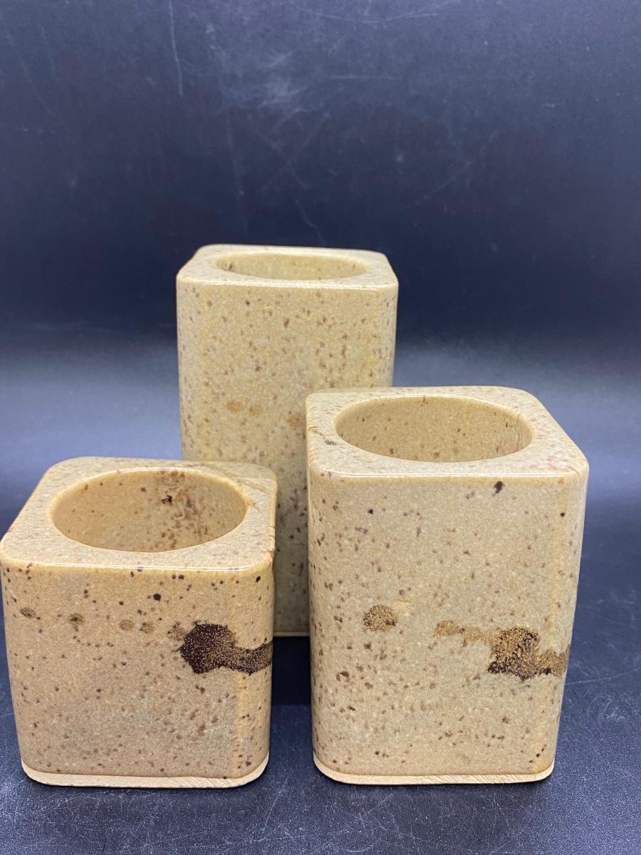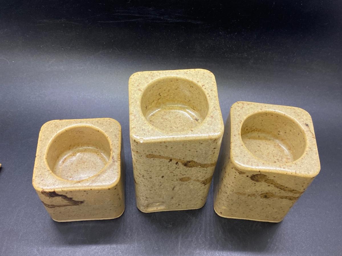 Lot of Heavy Ceramic Candle Holders, there is no significant damage to the candle holders and is in good displayable condition. There is an artist stamp on the side at the bottom of one. Check pictures for more details and for sizing.