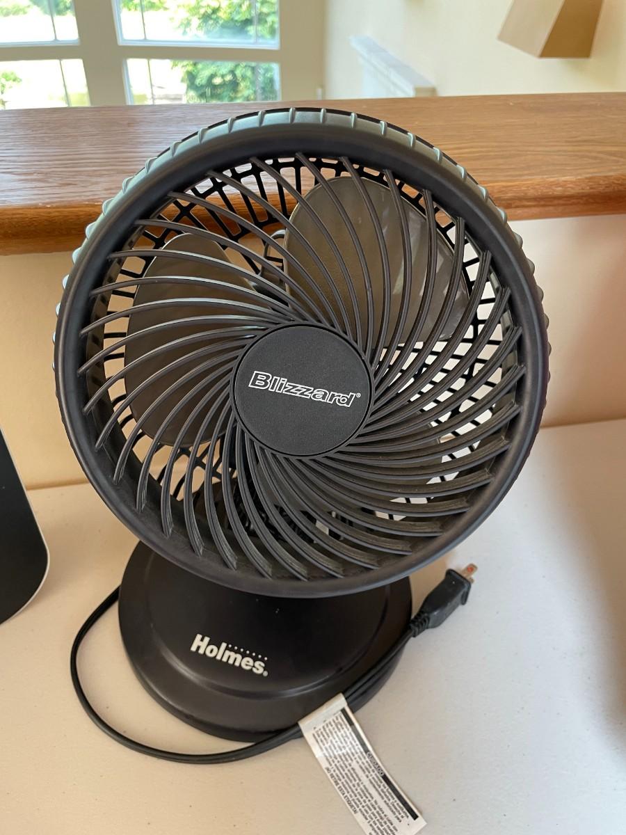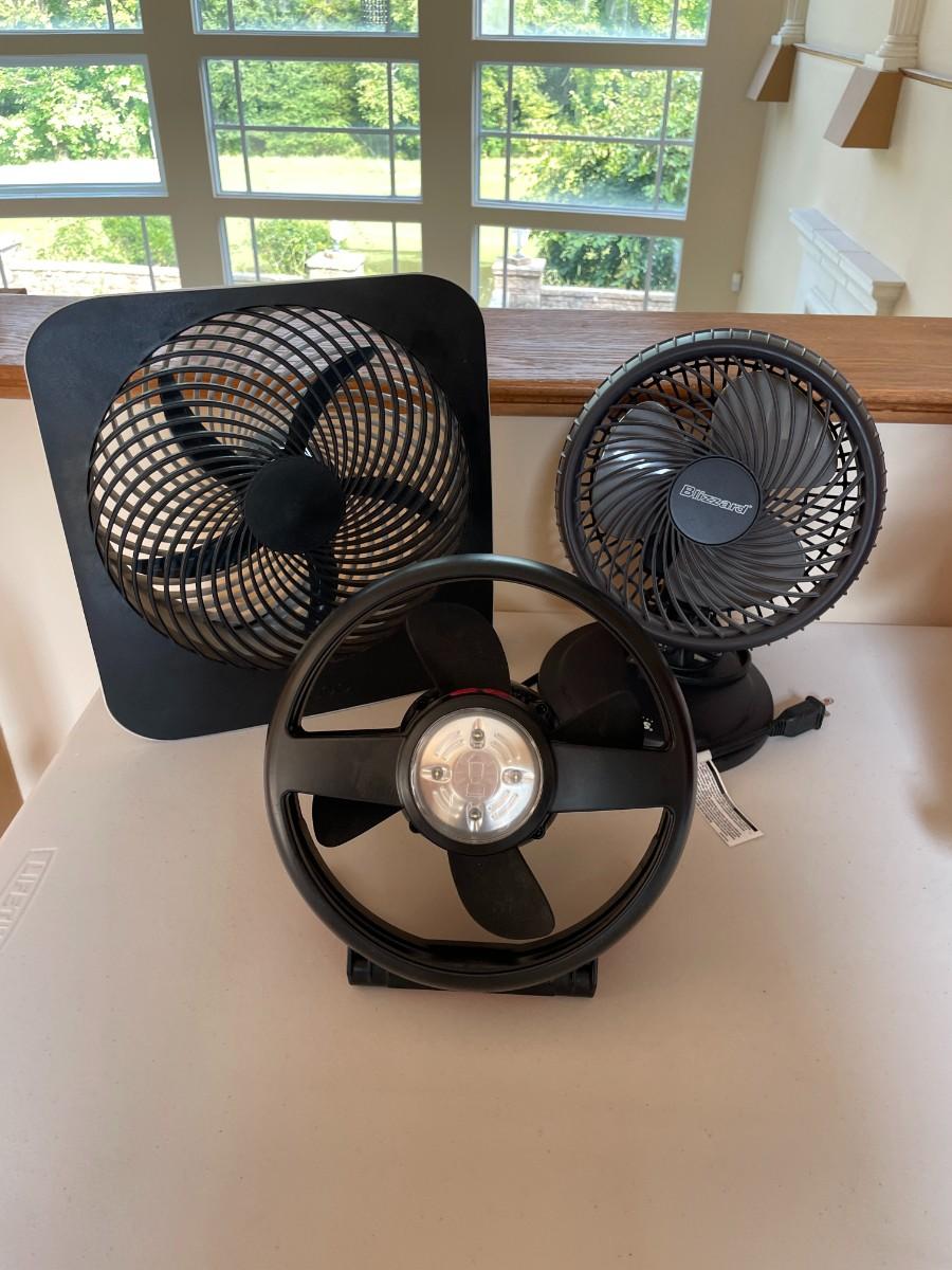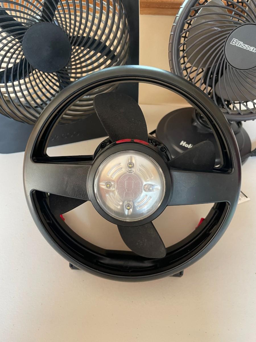 Coleman CPX 6 Lighted Tent Fan, HOLMES BLIZZARD 7" Table Fan, 10" Batt/Elec Port Fan. All in working condition over 100USD bundle.