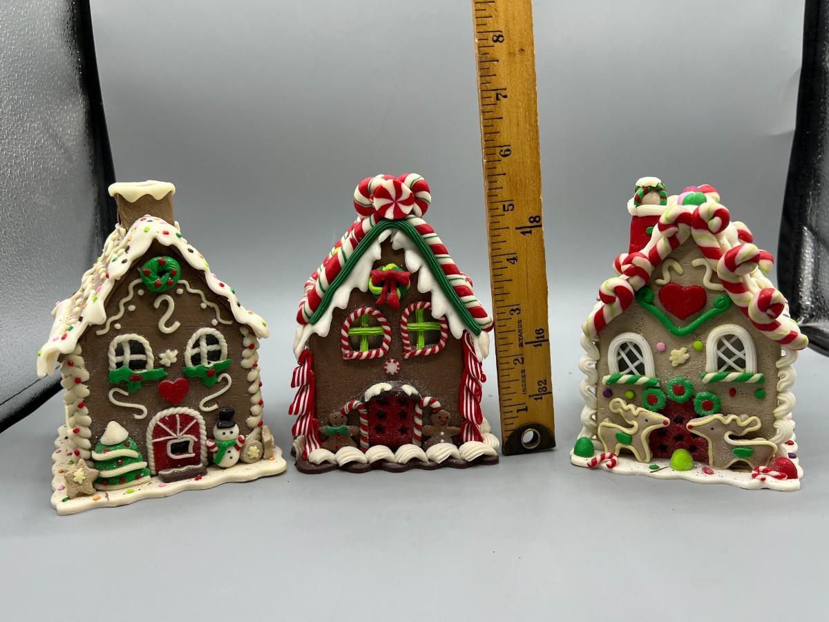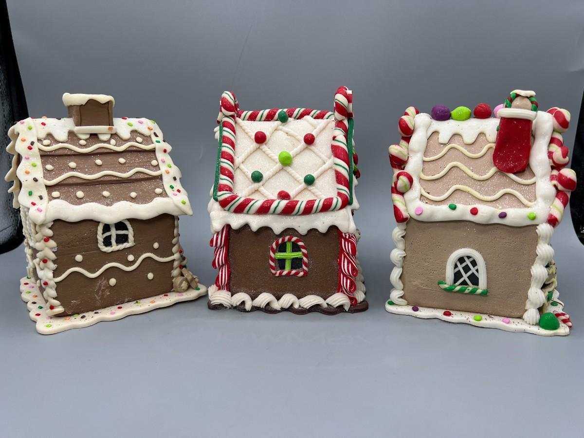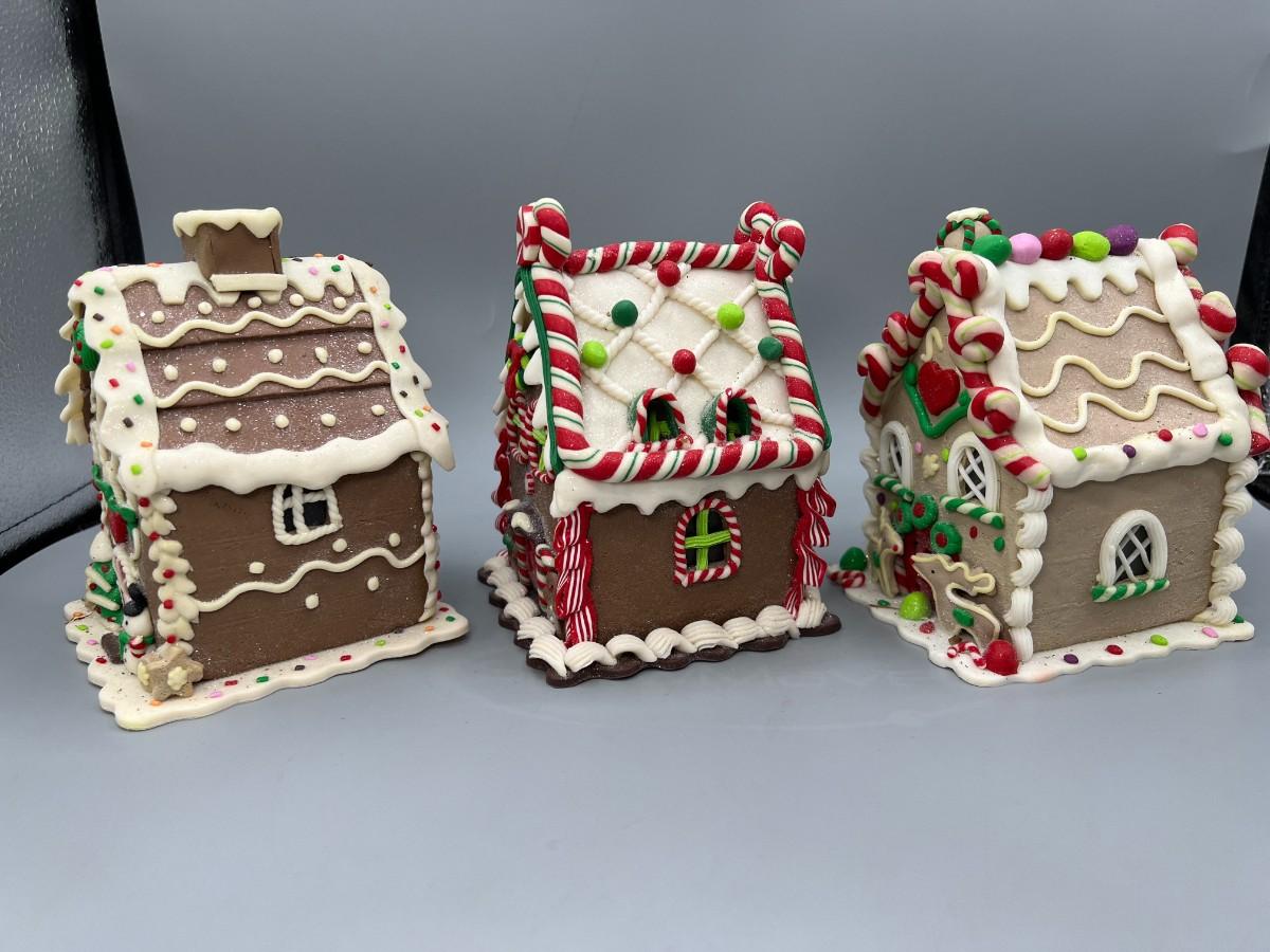 Lot of Holiday Christmas Decor Colorful Decorated Gingerbread Houses, there is some light wear, but there is no significant damage and is in good displayable condition. Check pictures for more details and for sizing.