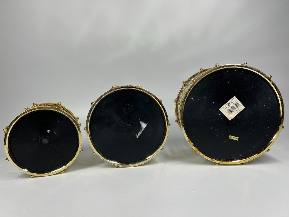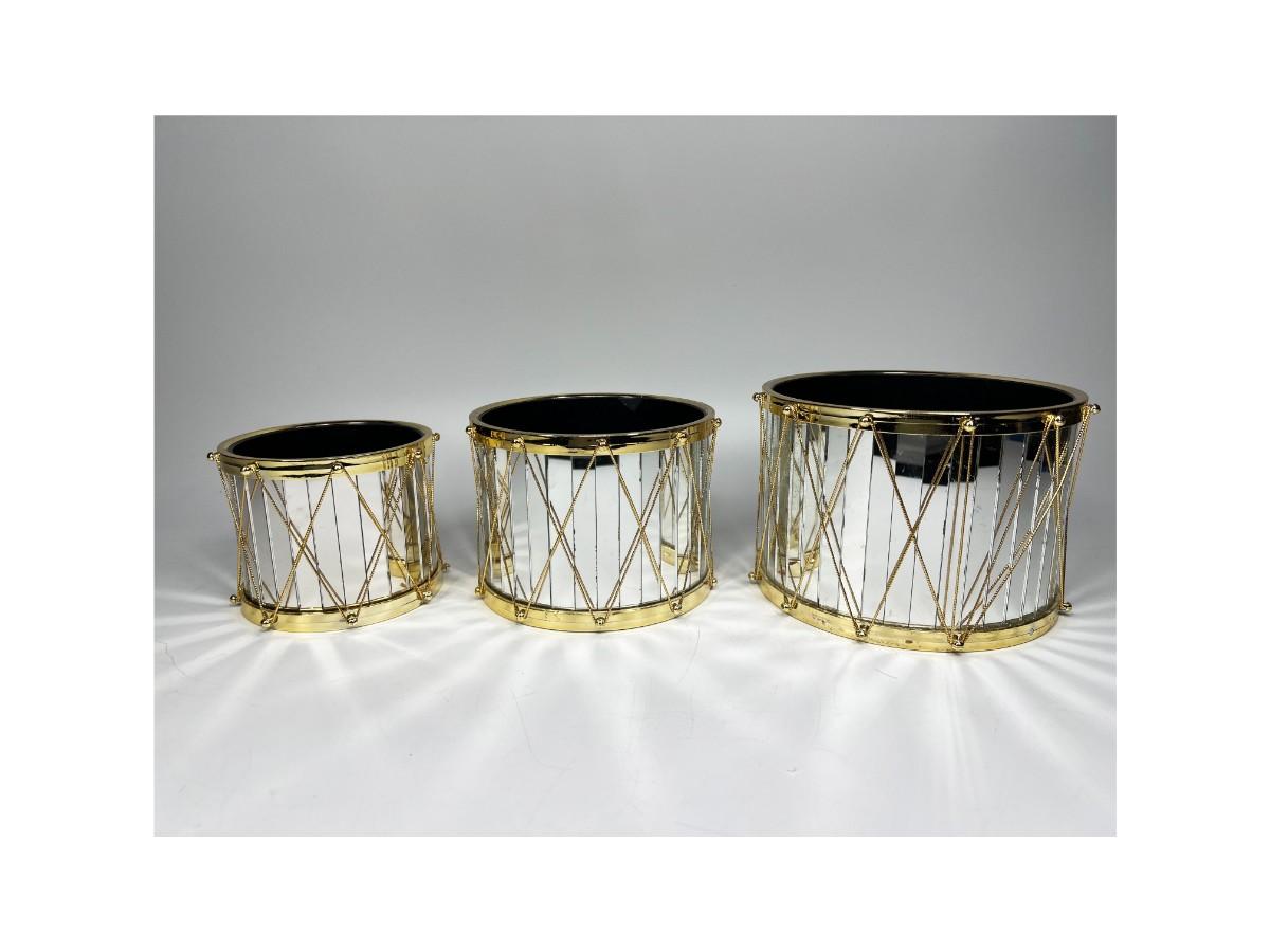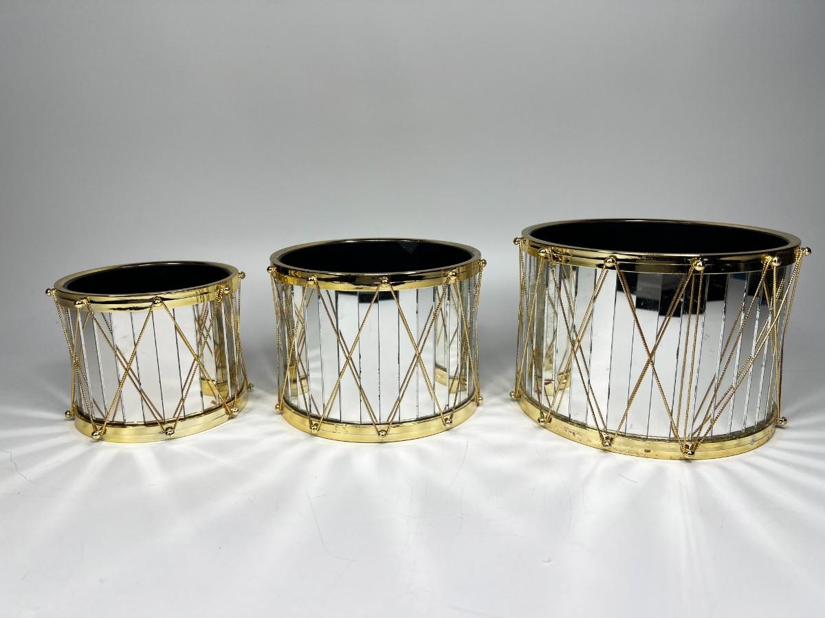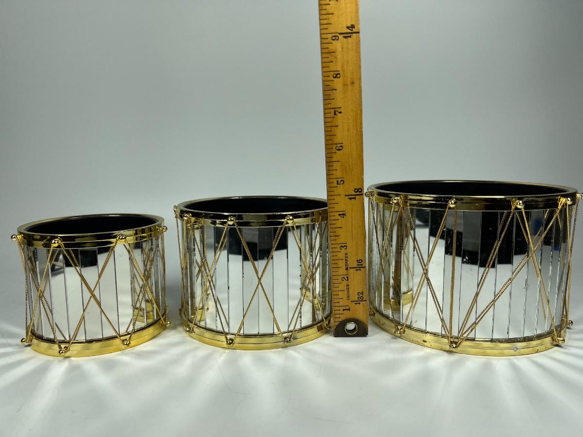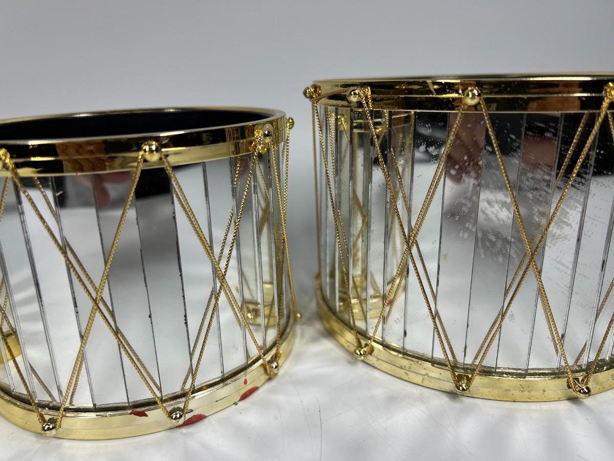 Lot of Holiday Christmas Home Decor Mirrored Potted Drums, there is some light wear, but there is no signficnat damage to the drums and is in good displayable condition. Check pictures for more details and for sizing.