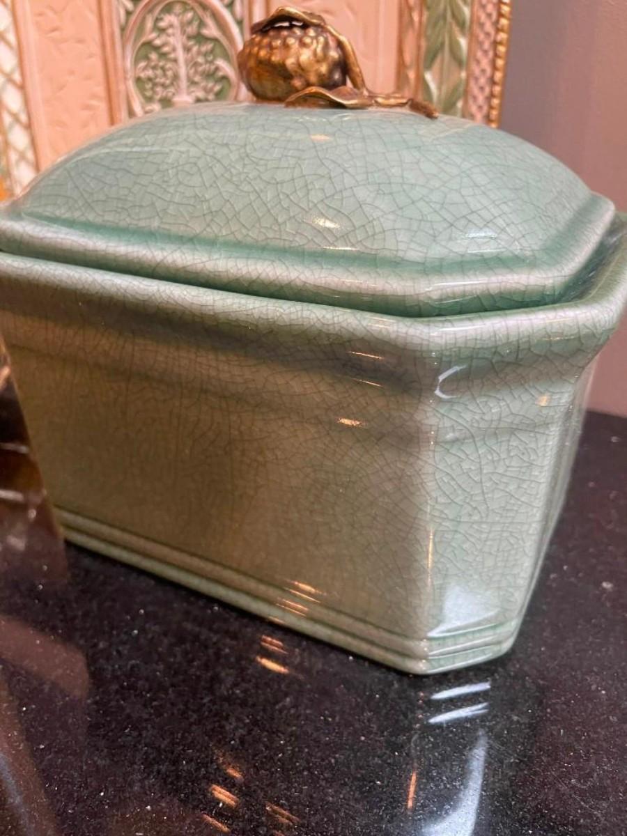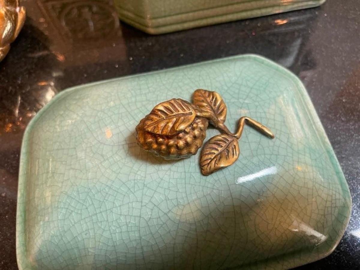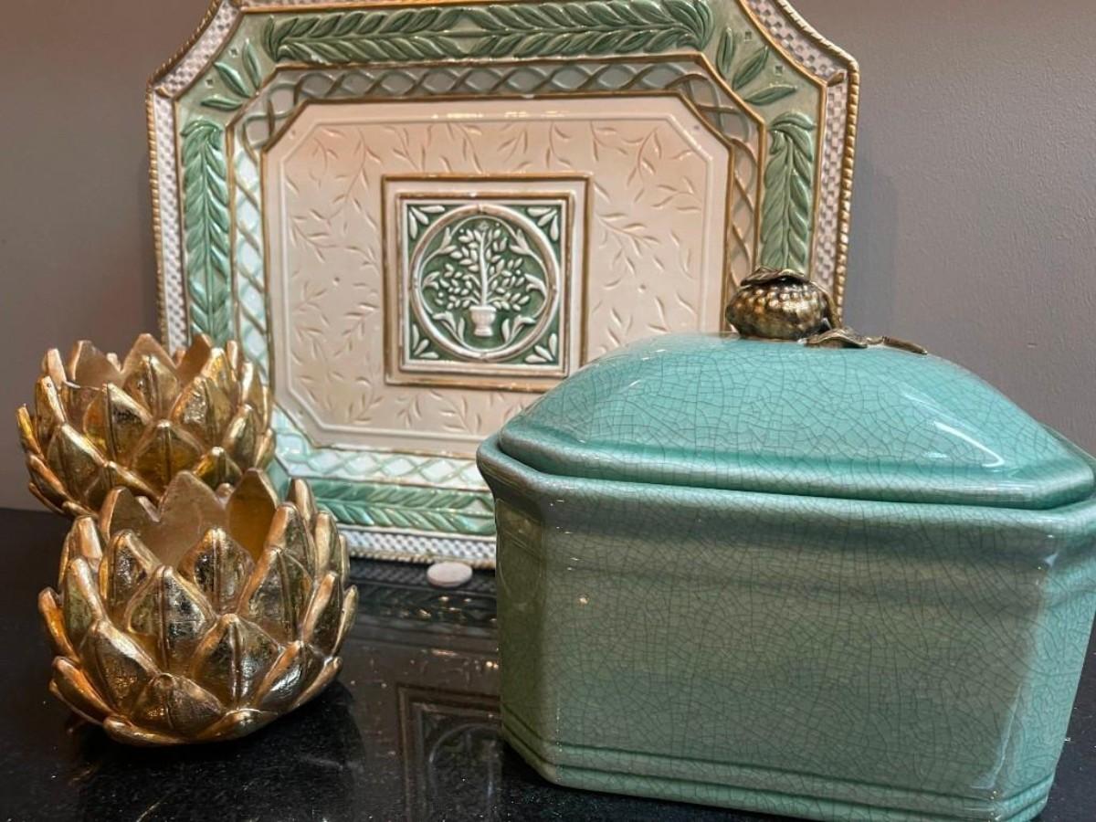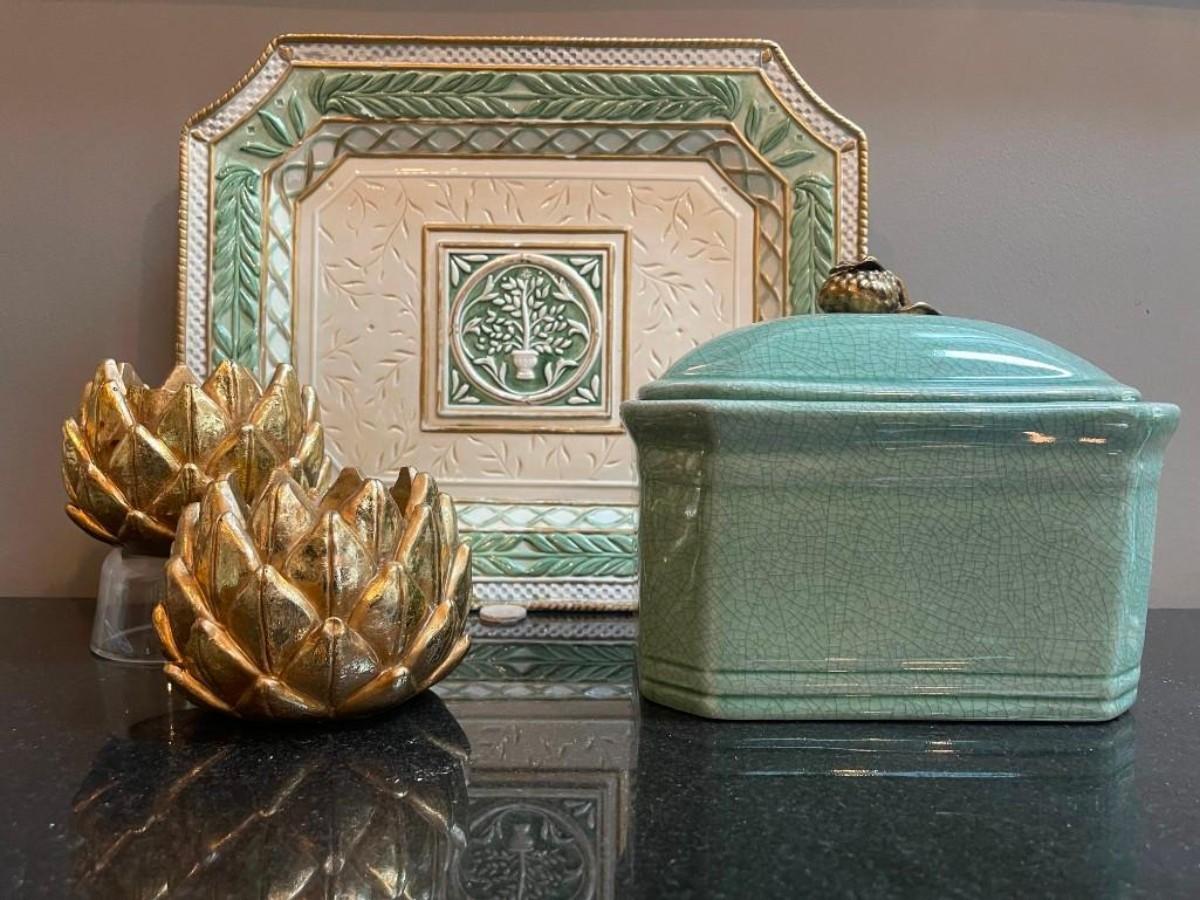 Lot of home accents includes covered rectangular ceramic box, a pair of gilt candle holders and one Fitz & Floyd platter (shows some wear).