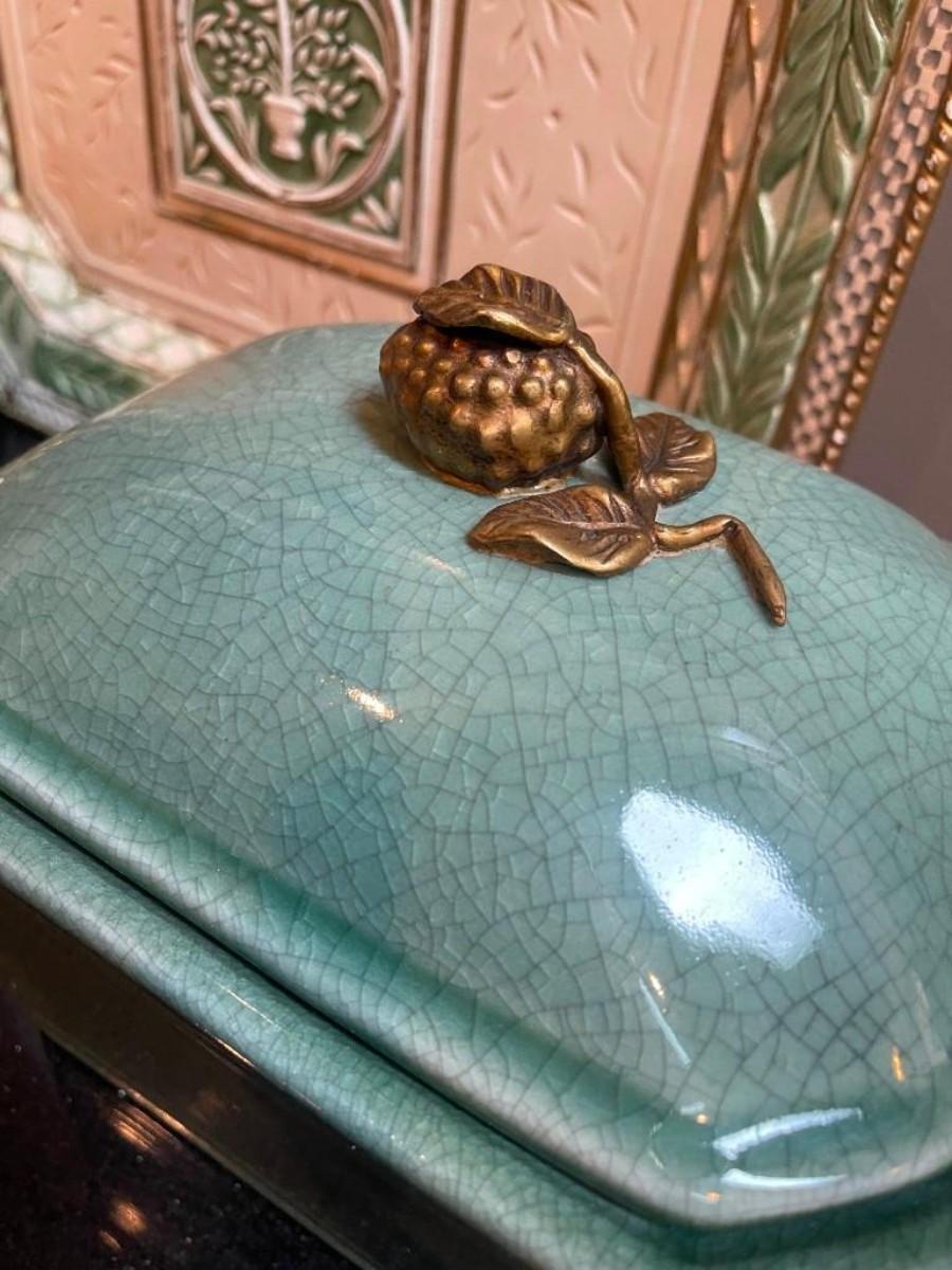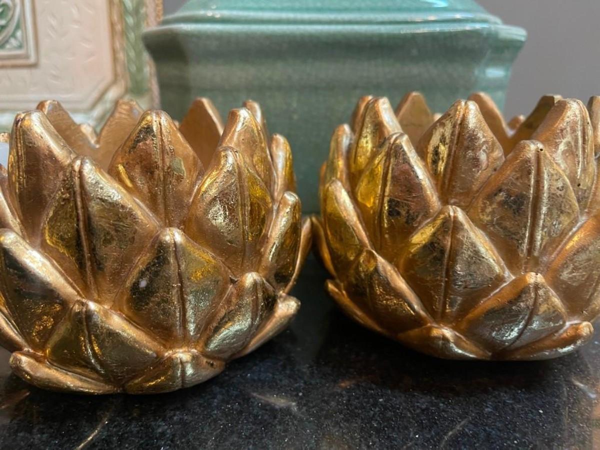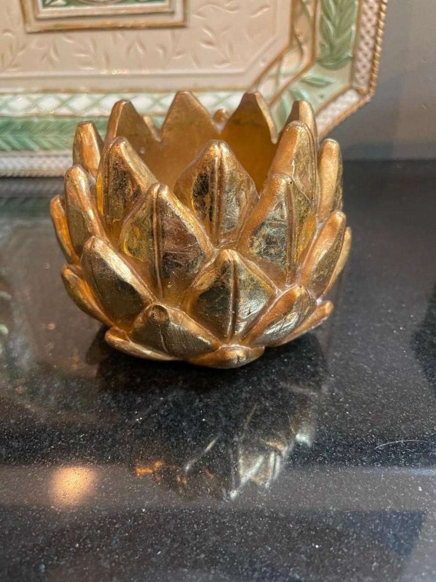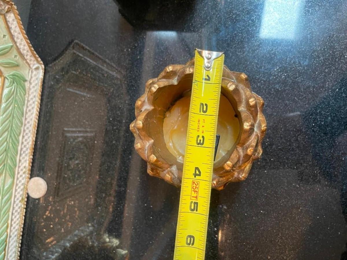 Lot of home accents includes covered rectangular ceramic box, a pair of gilt candle holders and one Fitz & Floyd platter (shows some wear).