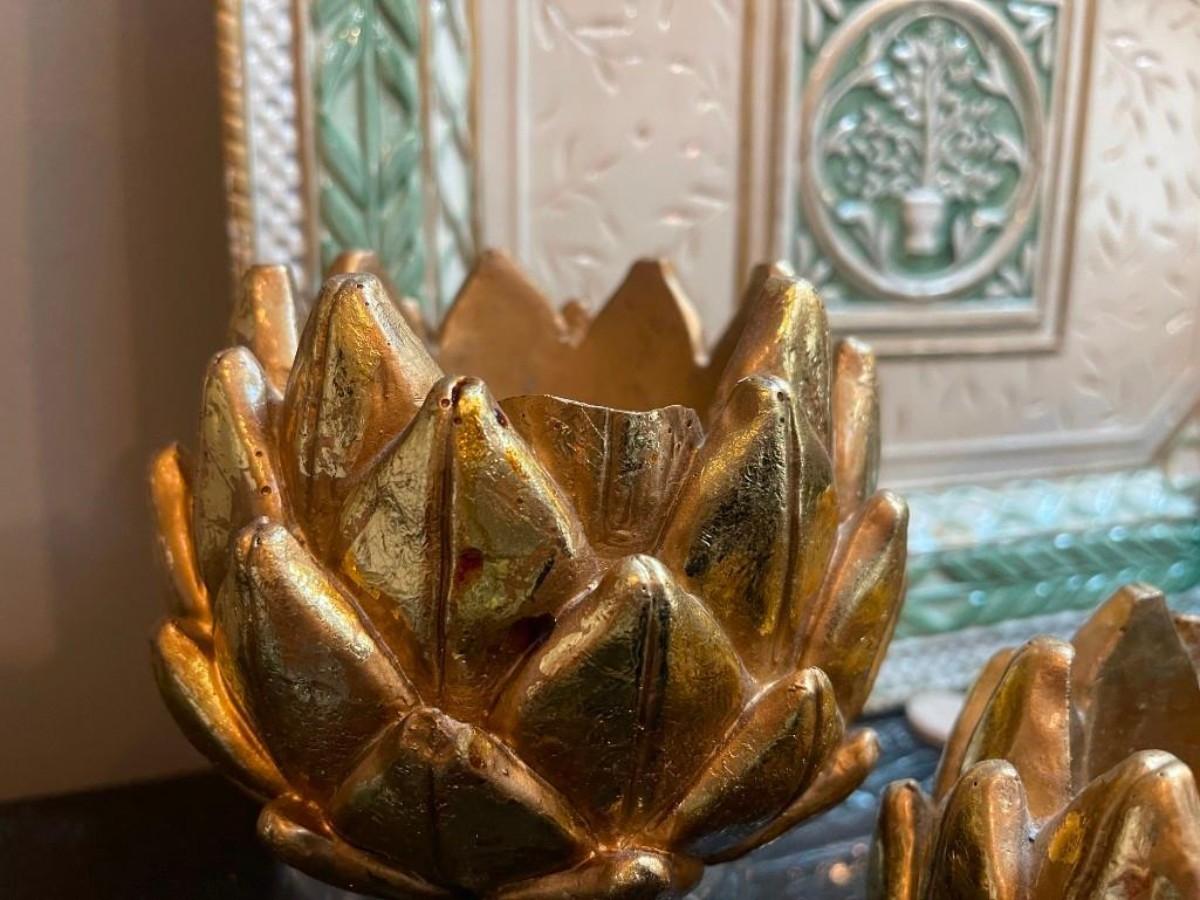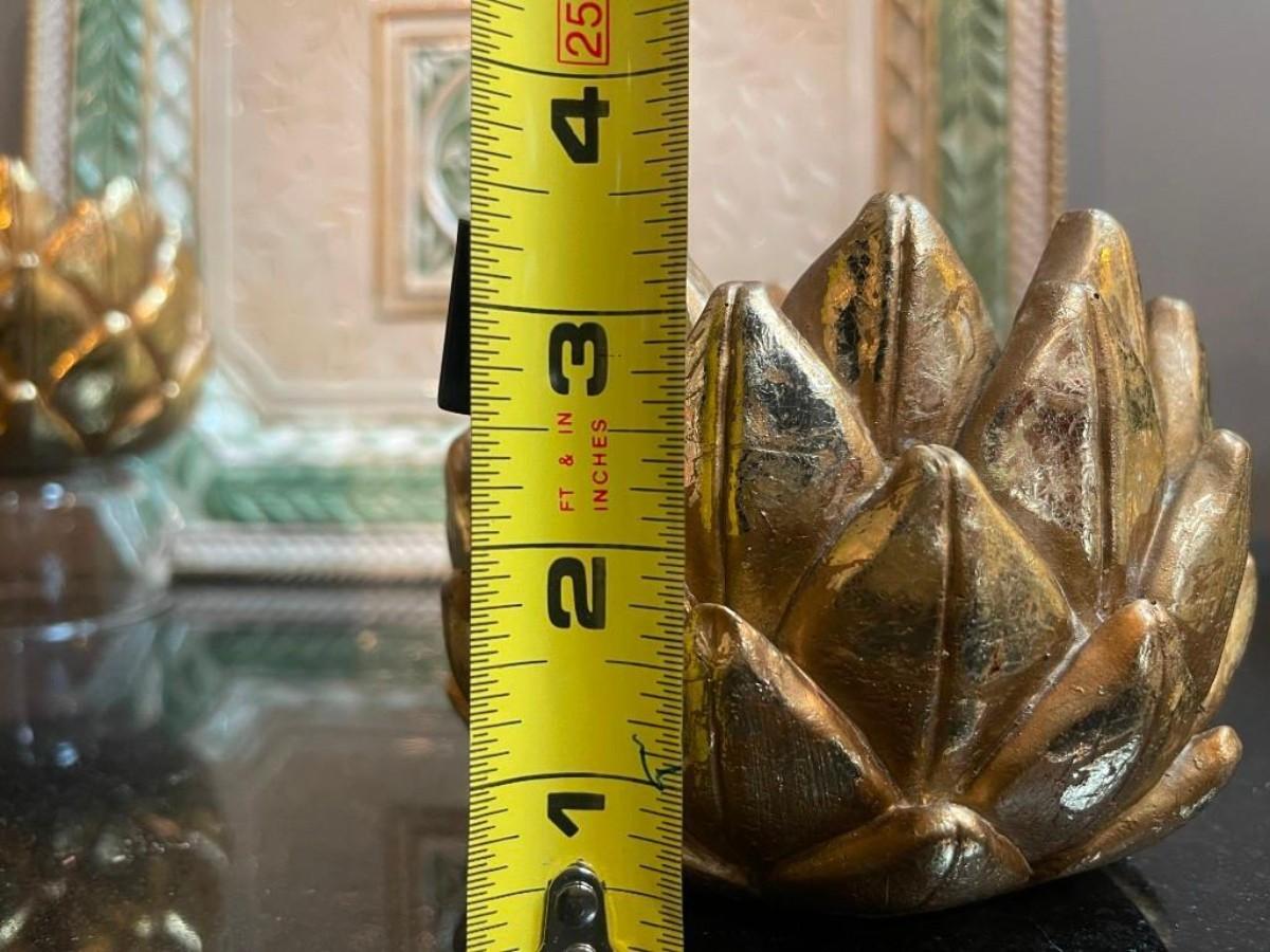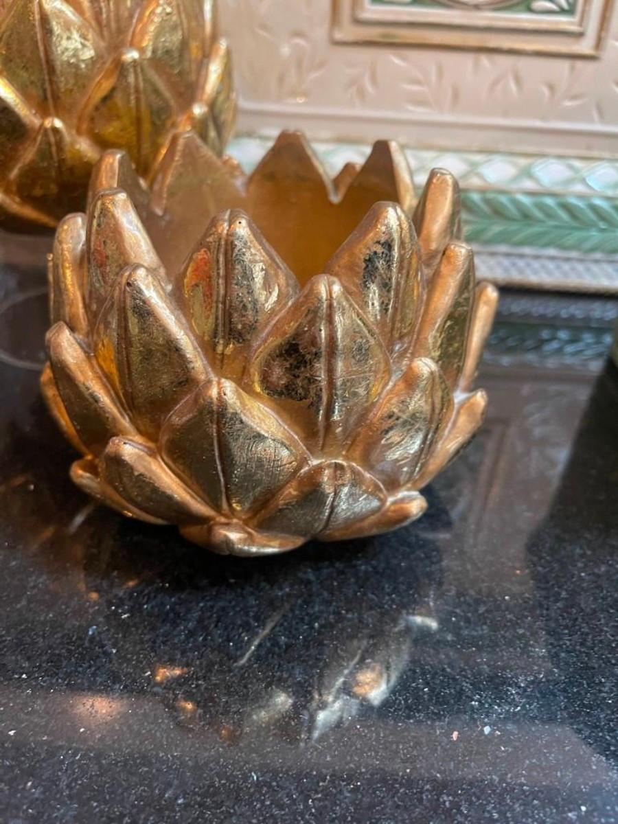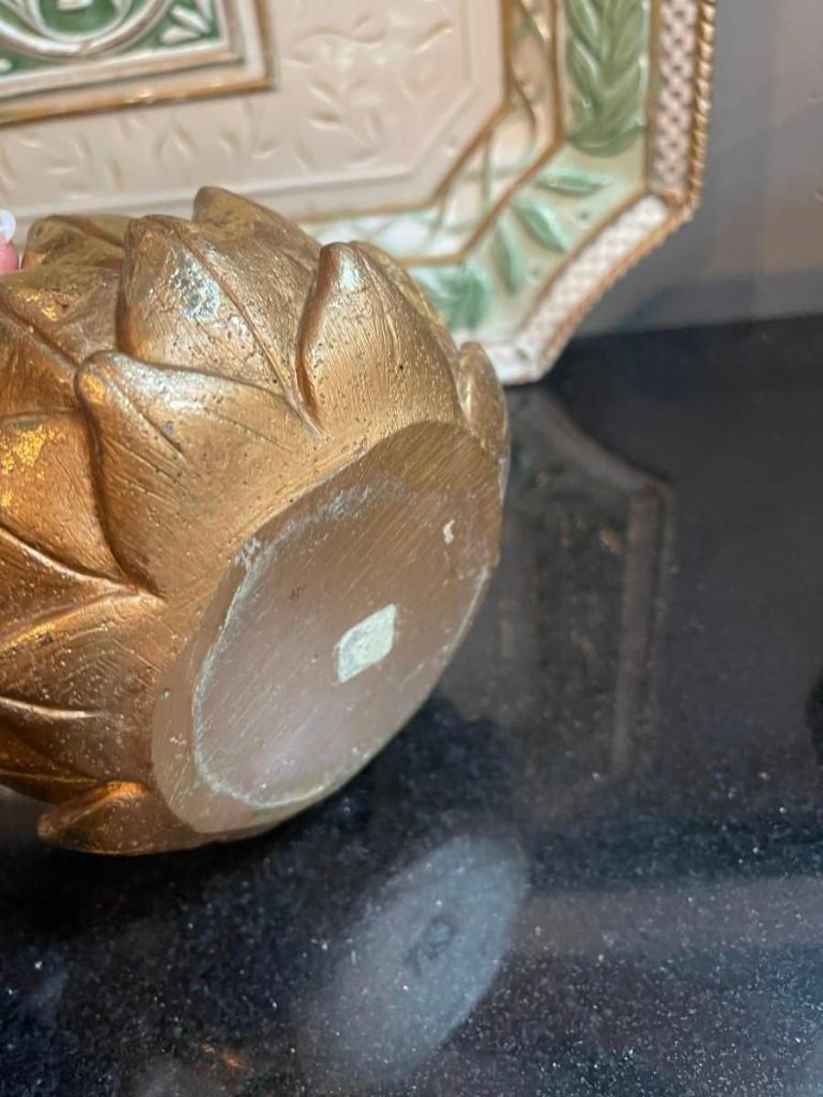 Lot of home accents includes covered rectangular ceramic box, a pair of gilt candle holders and one Fitz & Floyd platter (shows some wear).