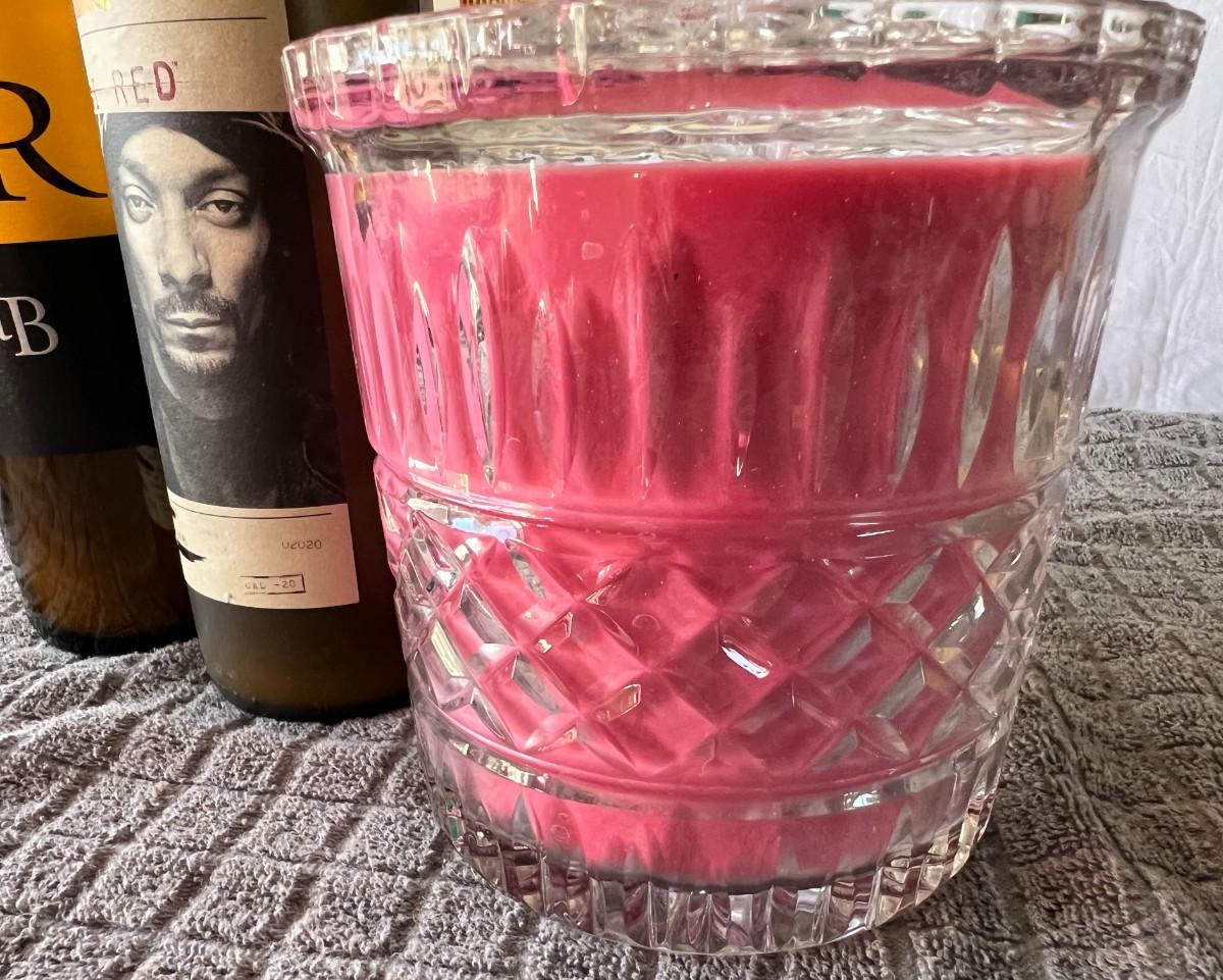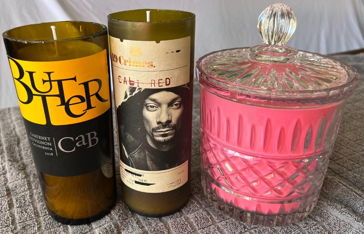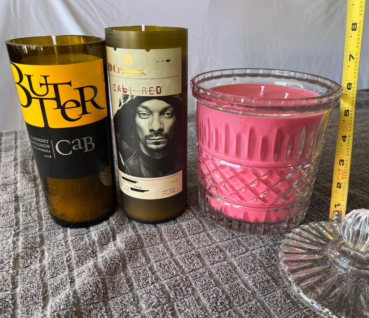 Lot of Homemade Candles 3 Wick Cut Glass Jar and 2 One Wick Repurposed Wine Bottles Snoop Dogg and Butter