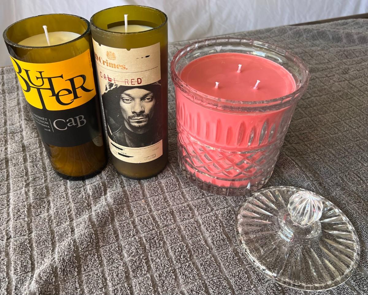 Lot of Homemade Candles 3 Wick Cut Glass Jar and 2 One Wick Repurposed Wine Bottles Snoop Dogg and Butter.