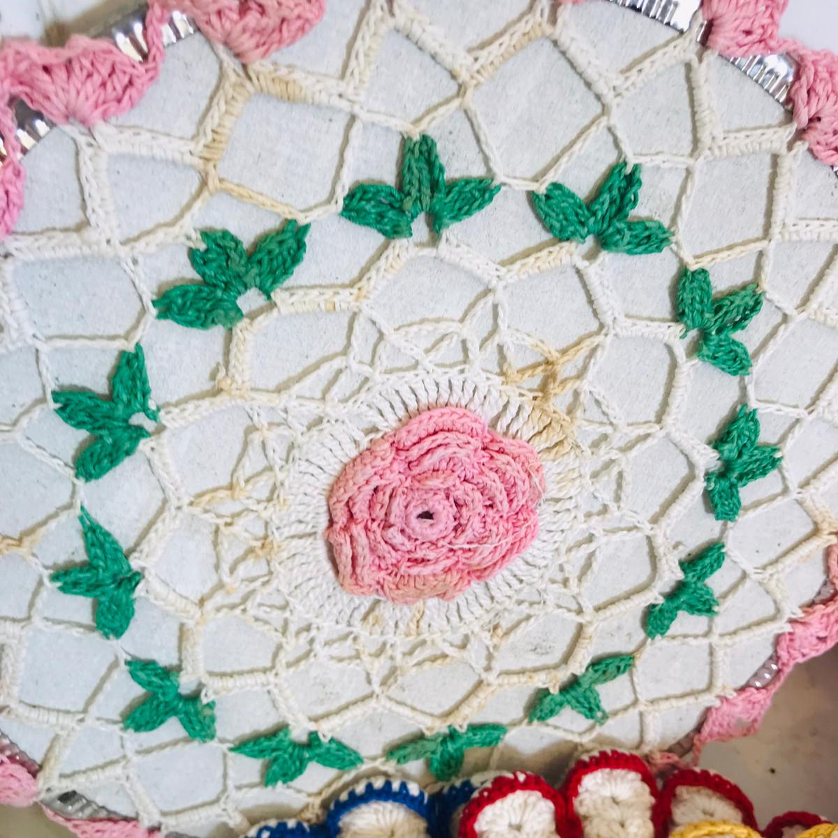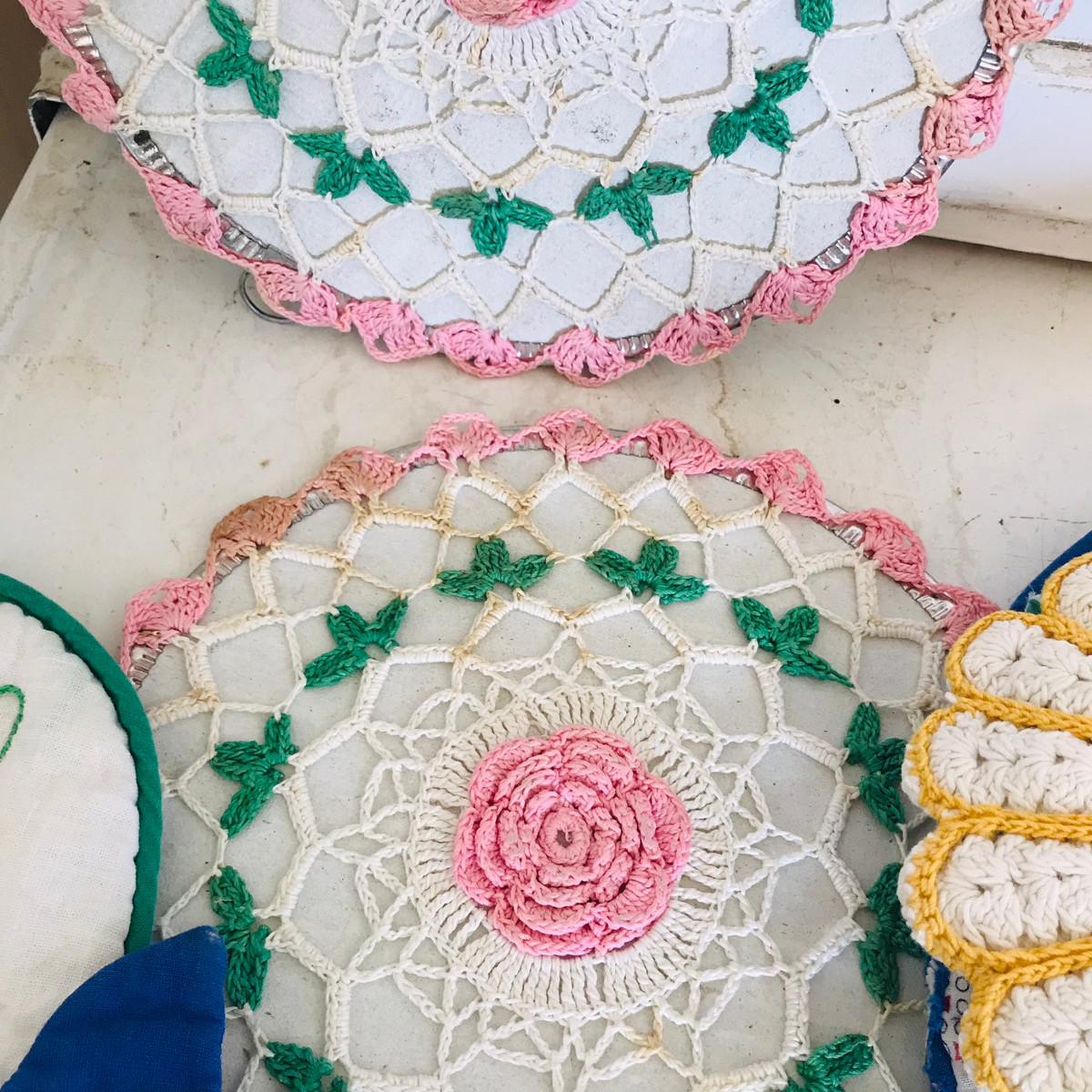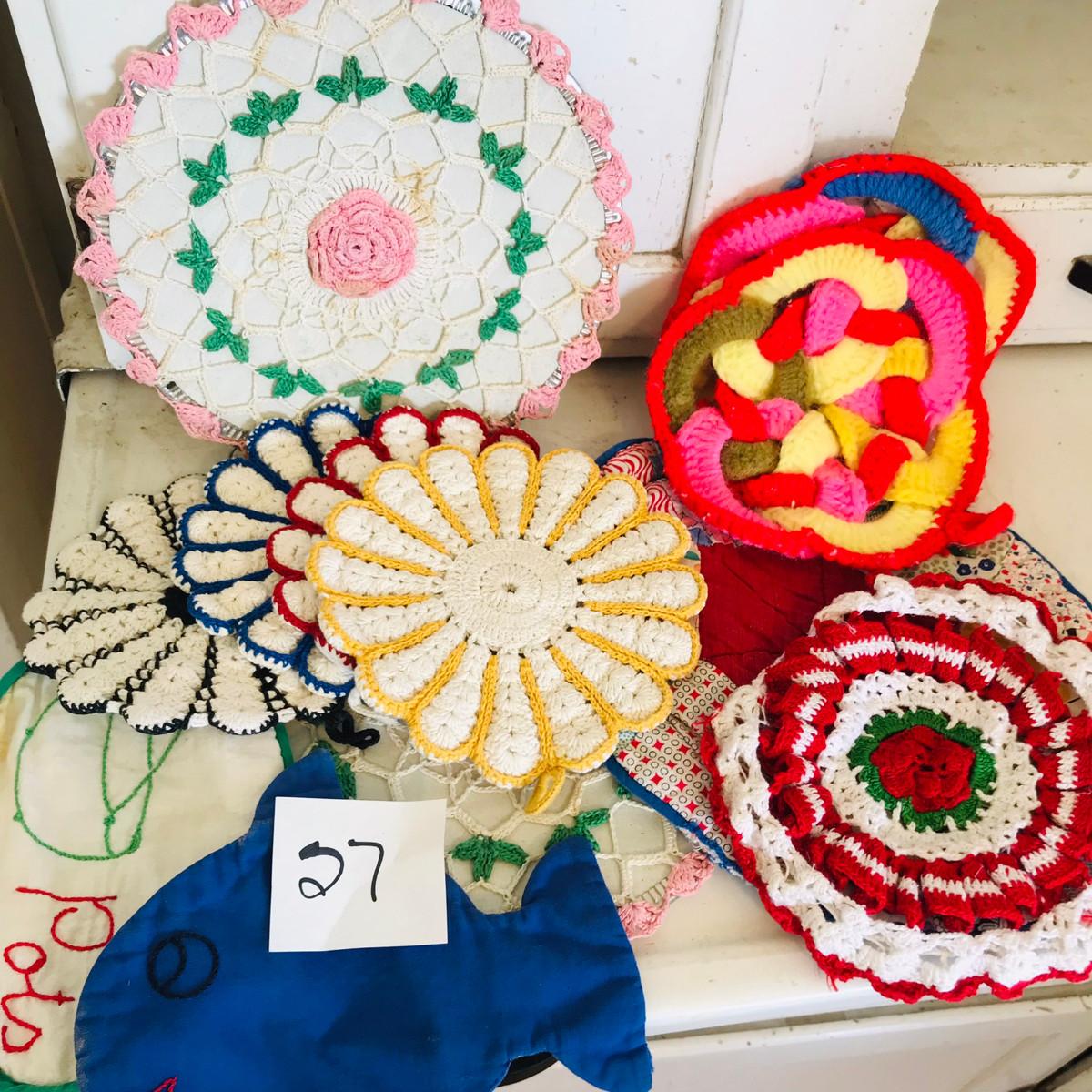 Nice grouping of misc. hot pads. The flower circle ones have no stains. The pink/green ones on cards do.
