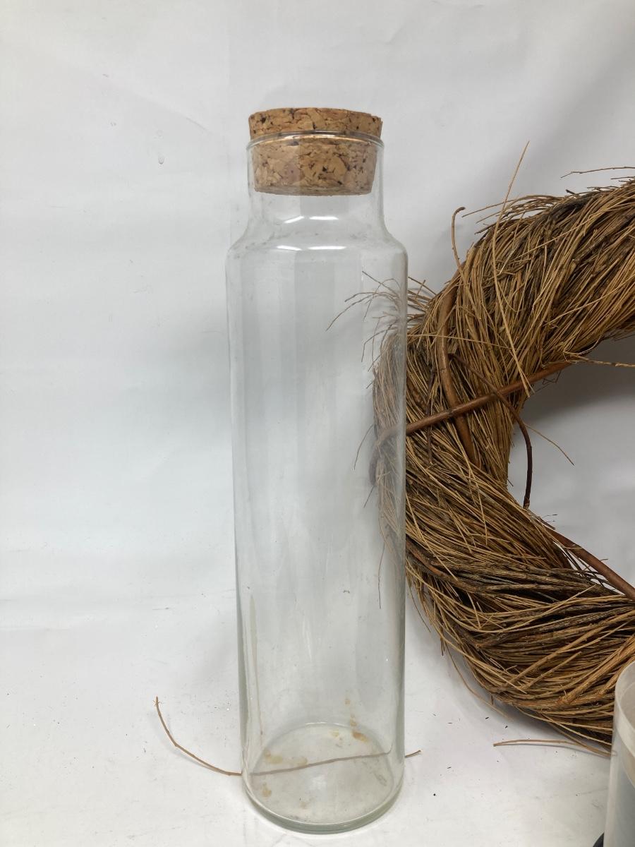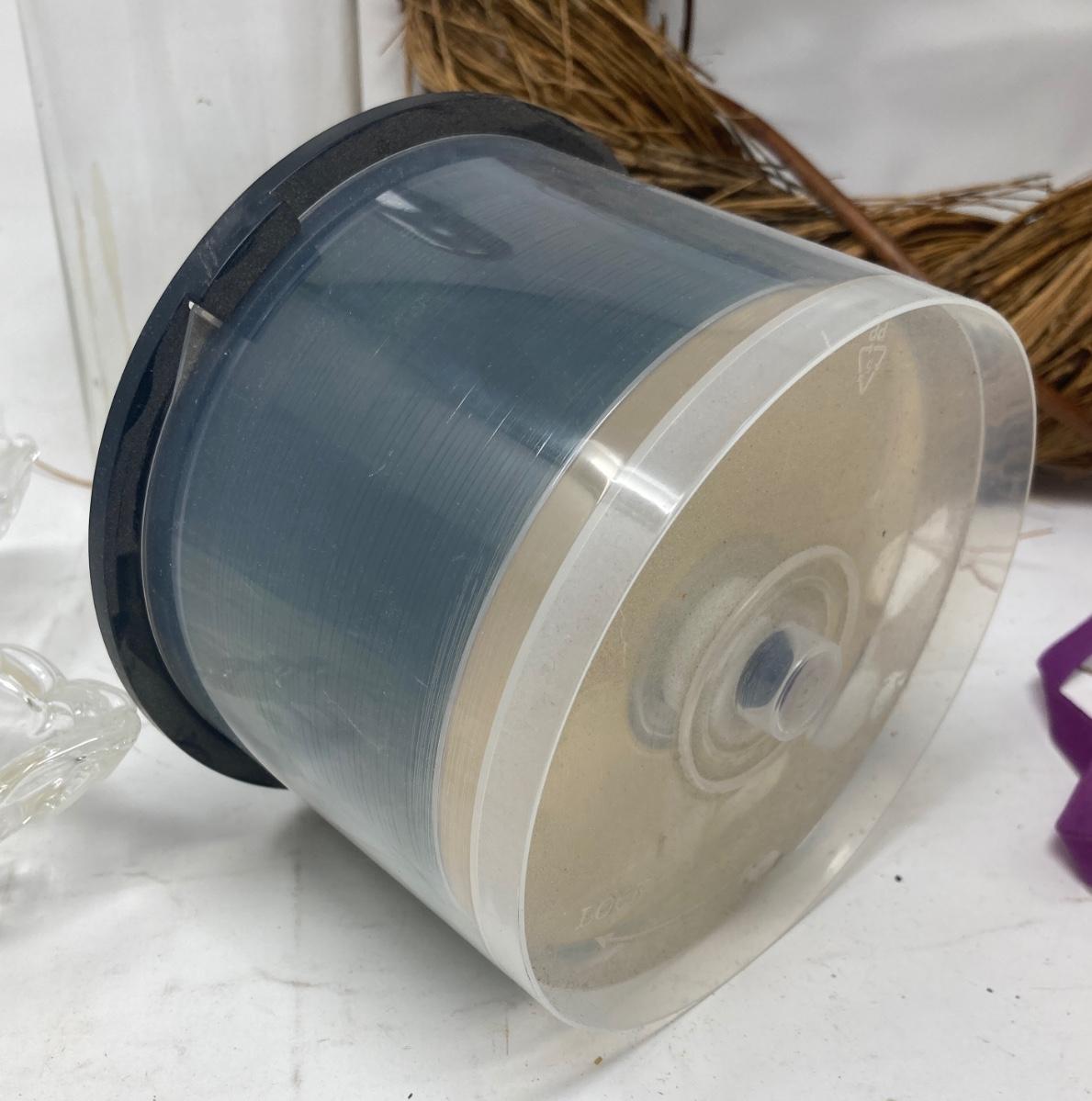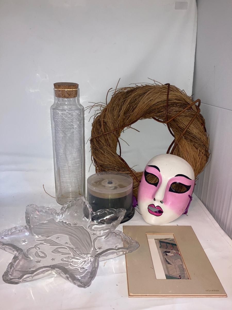 Lot includes various items including a spool of recordable cd’s a plain door wreath, glass holiday dish, Peking Opera mask and a Japanese Geisha print, tall glass container with a cork stop lid