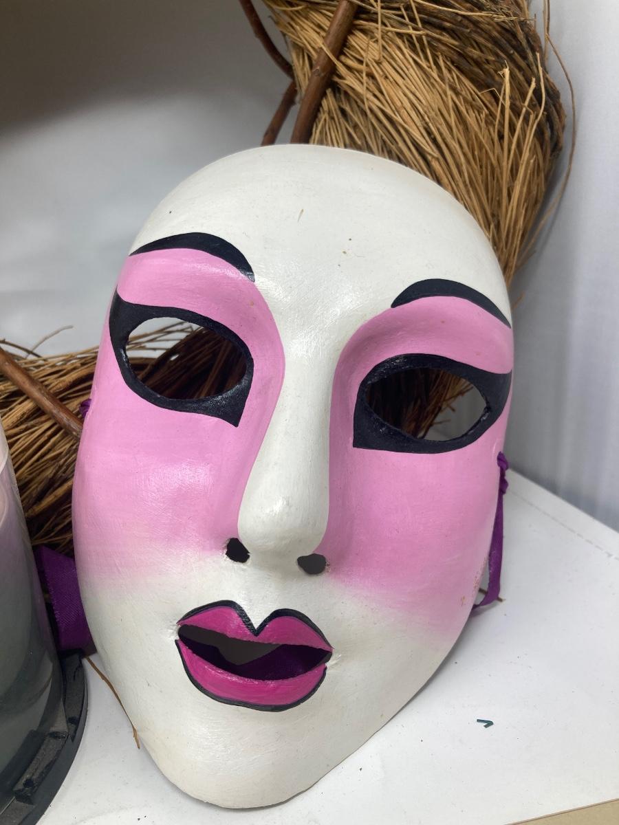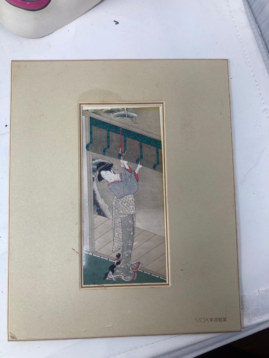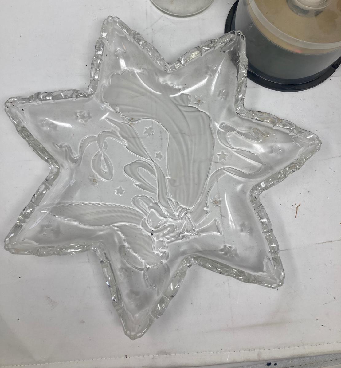 Lot includes various items including a spool of recordable cd’s a plain door wreath, glass holiday dish, Peking Opera mask and a Japanese Geisha print, tall glass container with a cork stop lid
