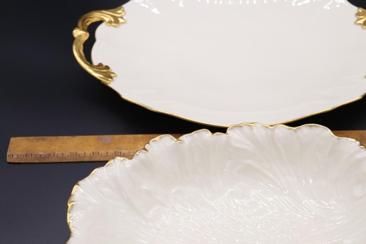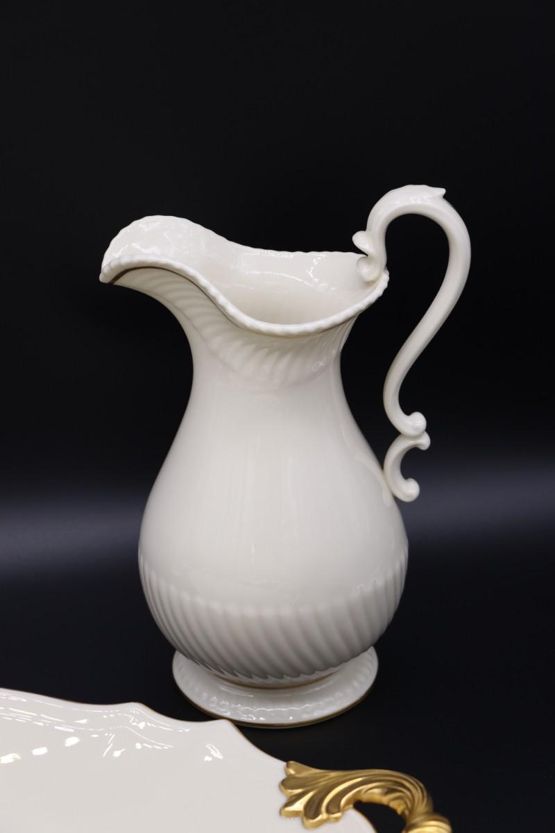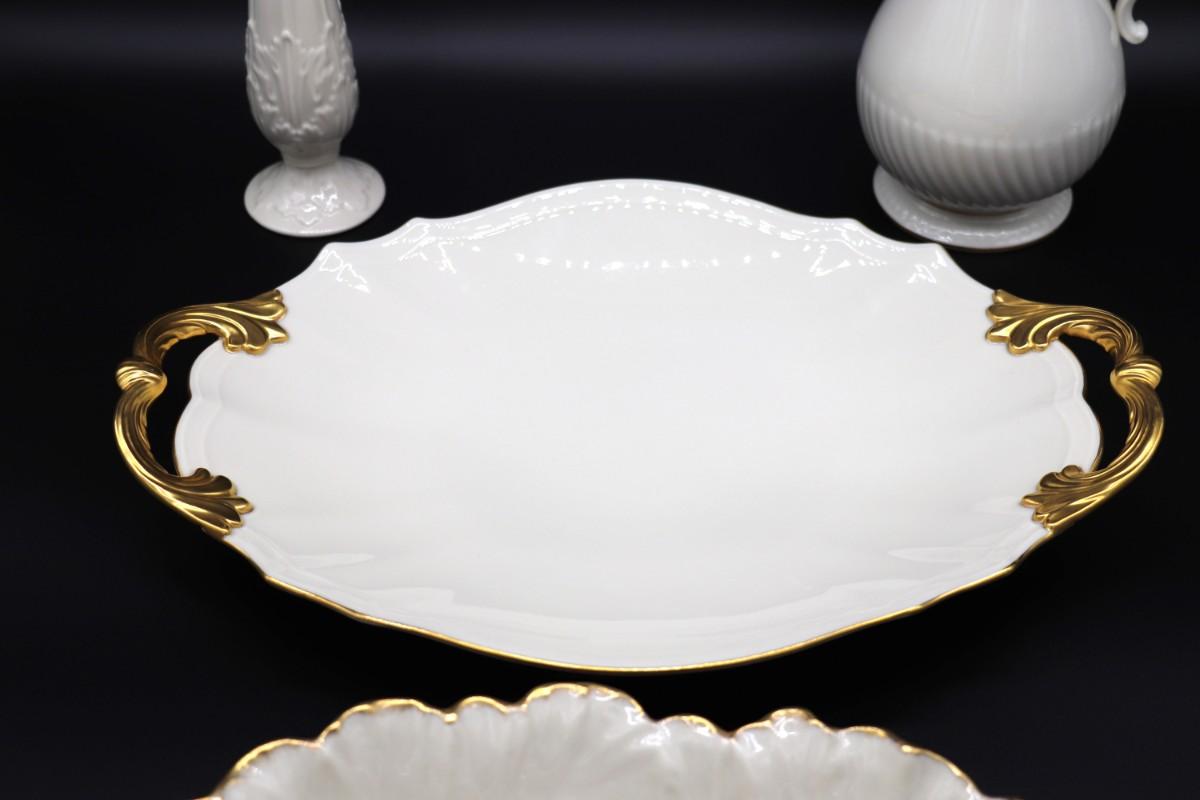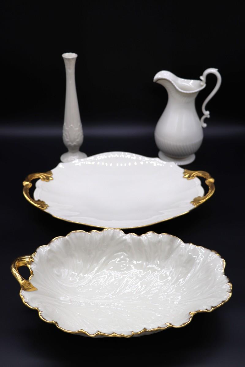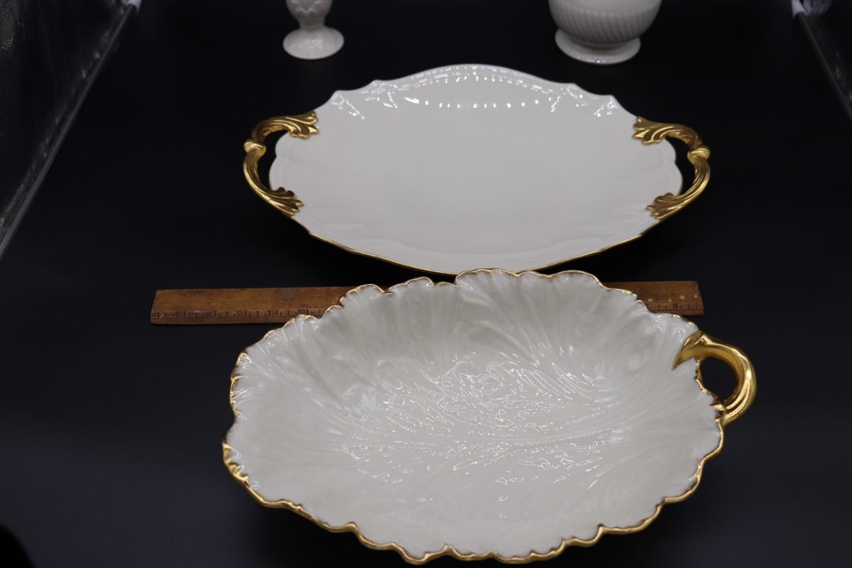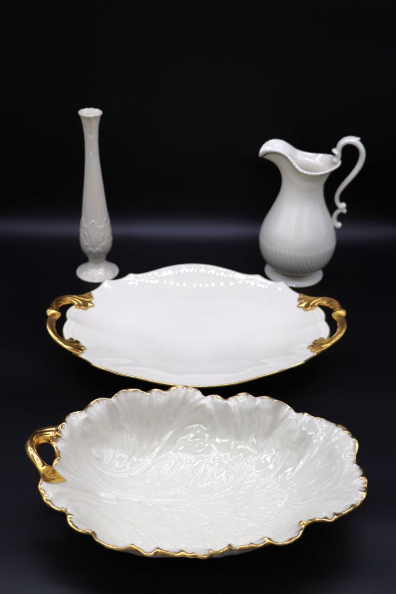 Lot of Cream White and Gold Lenox Serving Platters, Pitcher, and Vase. Good condition, as shown.