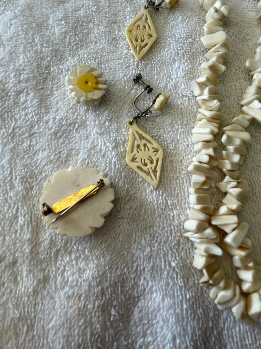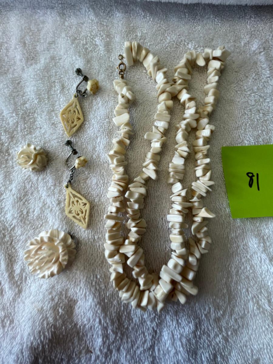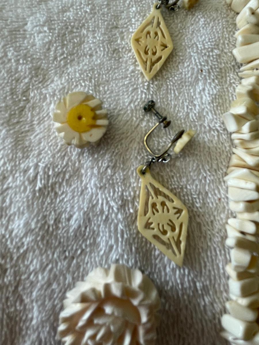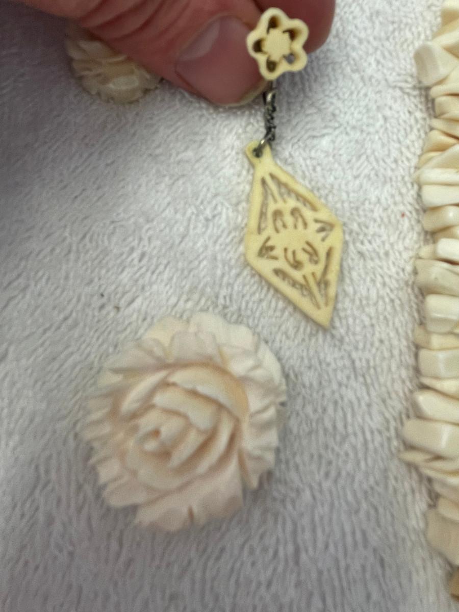The rosettes are ivory, the earrings are also ivory. The necklace may be bone, but
