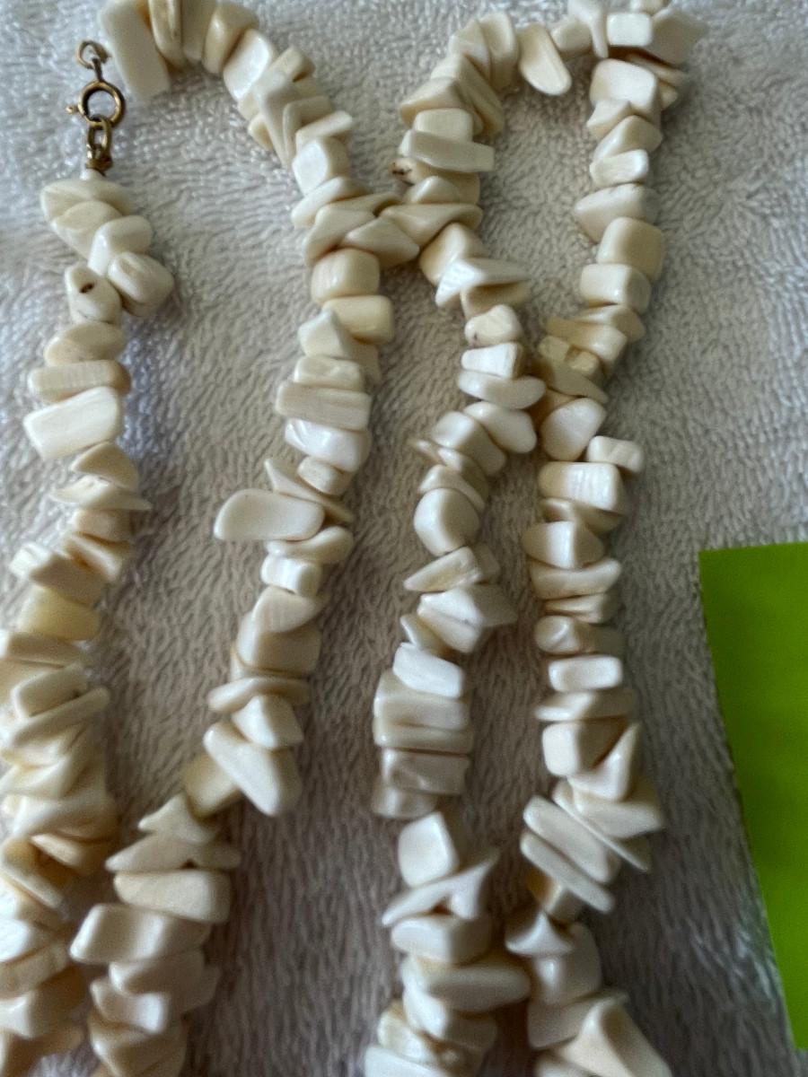 look to be ivory. Necklace is about 24" long .69 grams total weight.