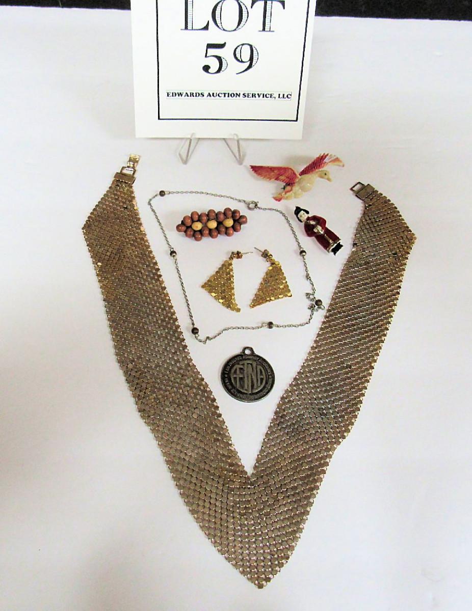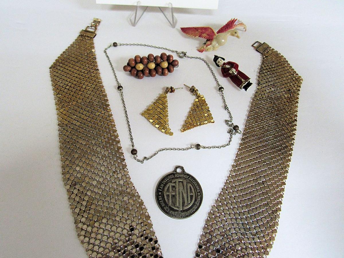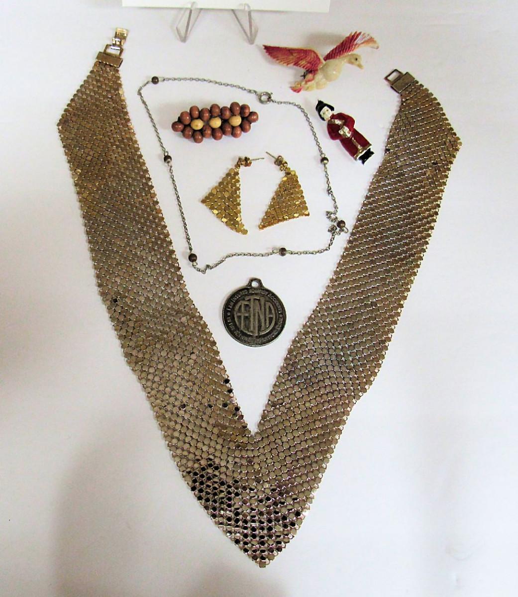 The mesh necklace has lost some of the gold finish. The mesh earrings don't match the necklace. Paintwear on the plastic bird pin. Some jewelry needs a very good cleaning. We did not check stones for chips or looseness. Shipping is available at shipping cost plus $5.00 handling fee on one box, $10.00 handling fee on two boxes, $15.00 handling fee on 3 boxes. Helps cover shipping materials and labor cost.