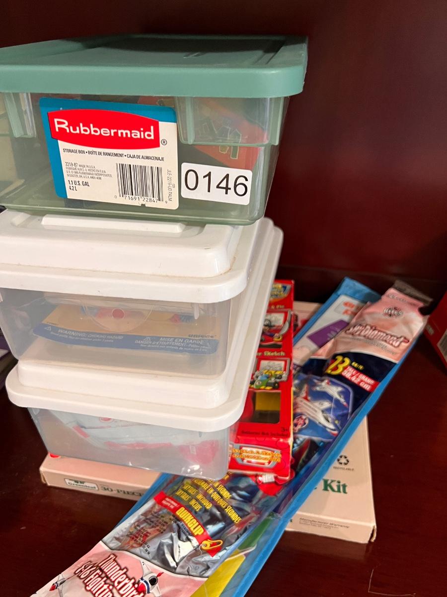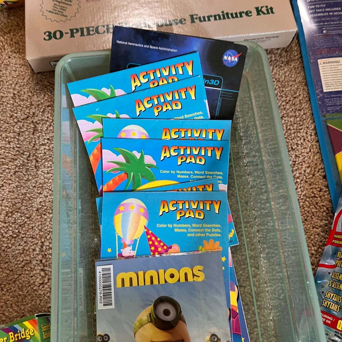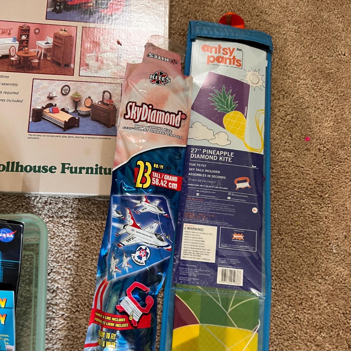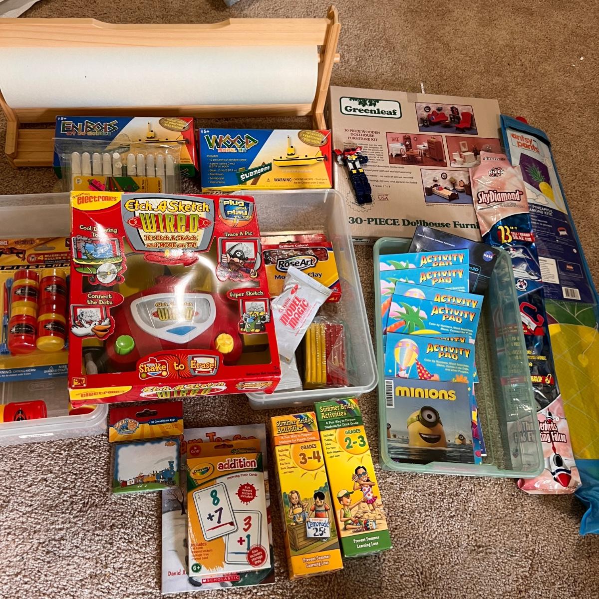 2 kites, bubbles, doll house kit, boat kits, paper team holder, clay, etc.