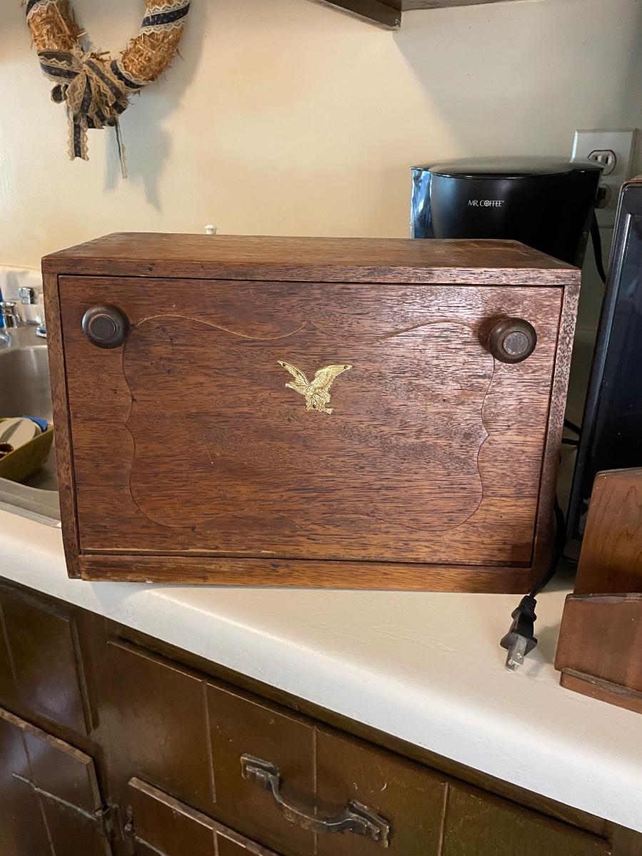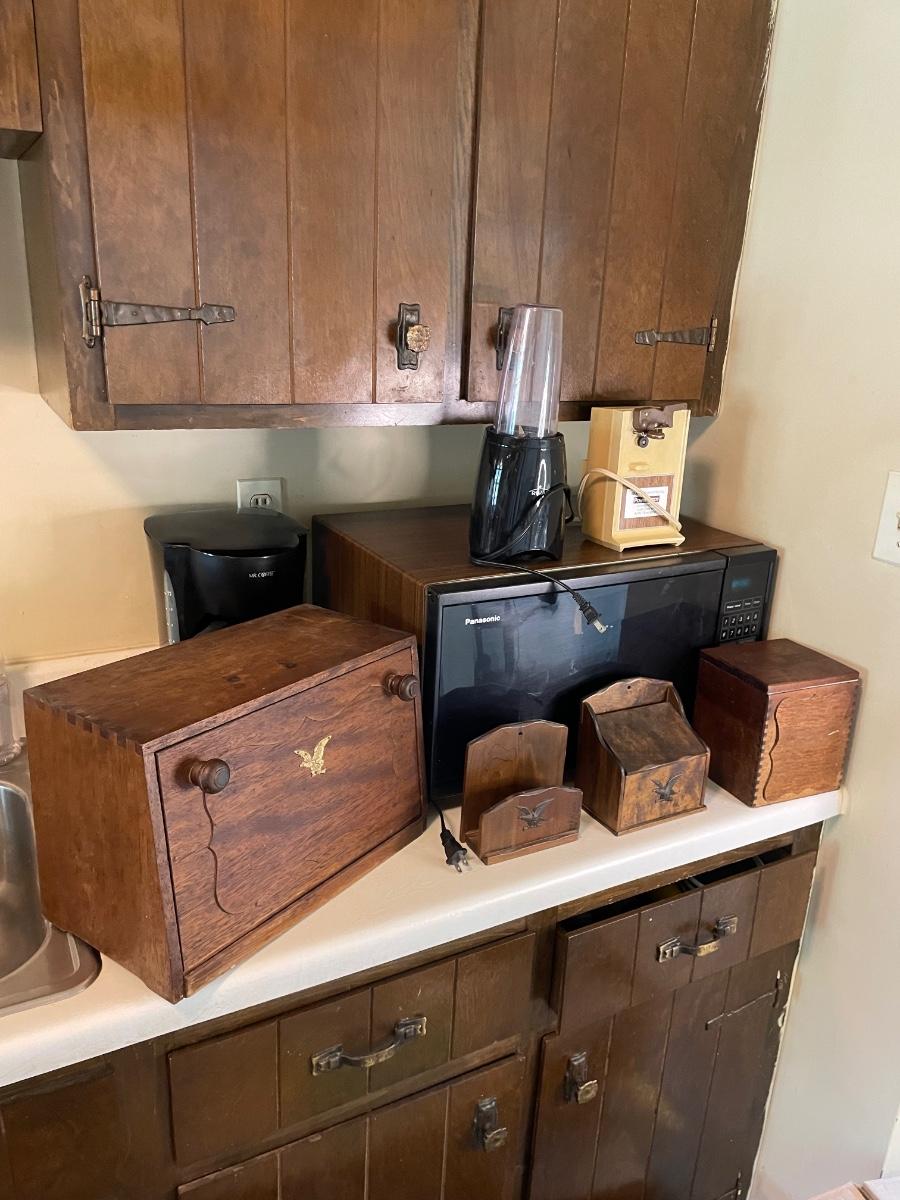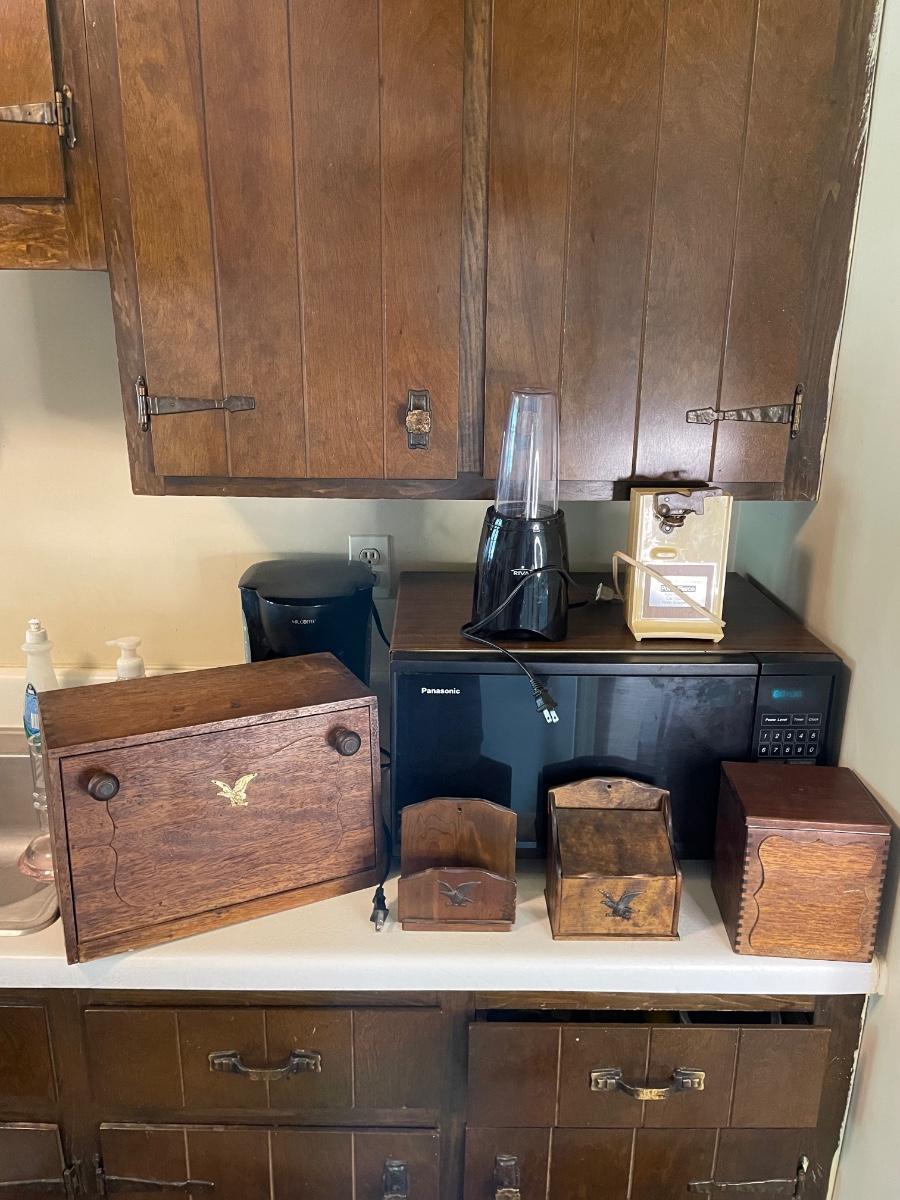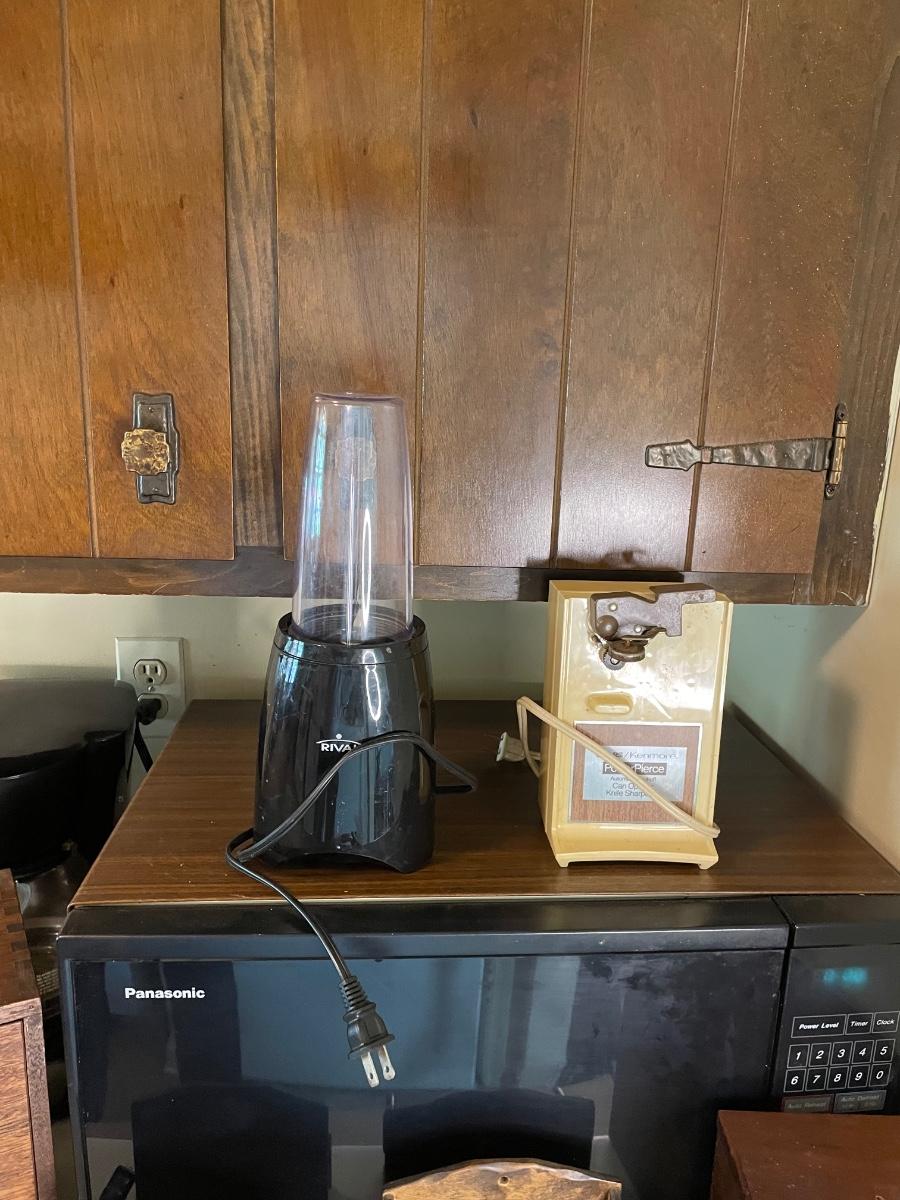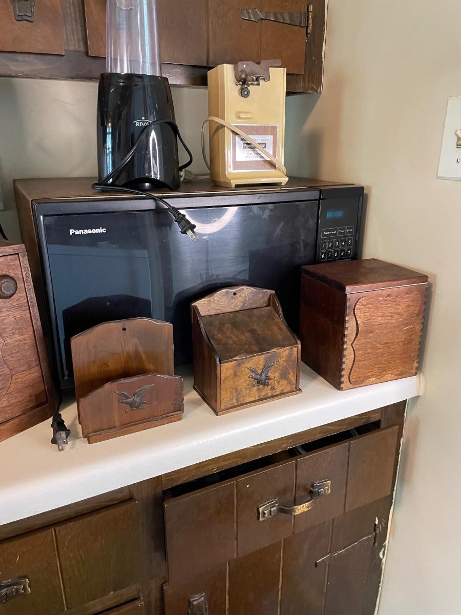 Miscellaneous items including microwave, vintage can opener, coffee maker, coffee grinder, bread box, etc.