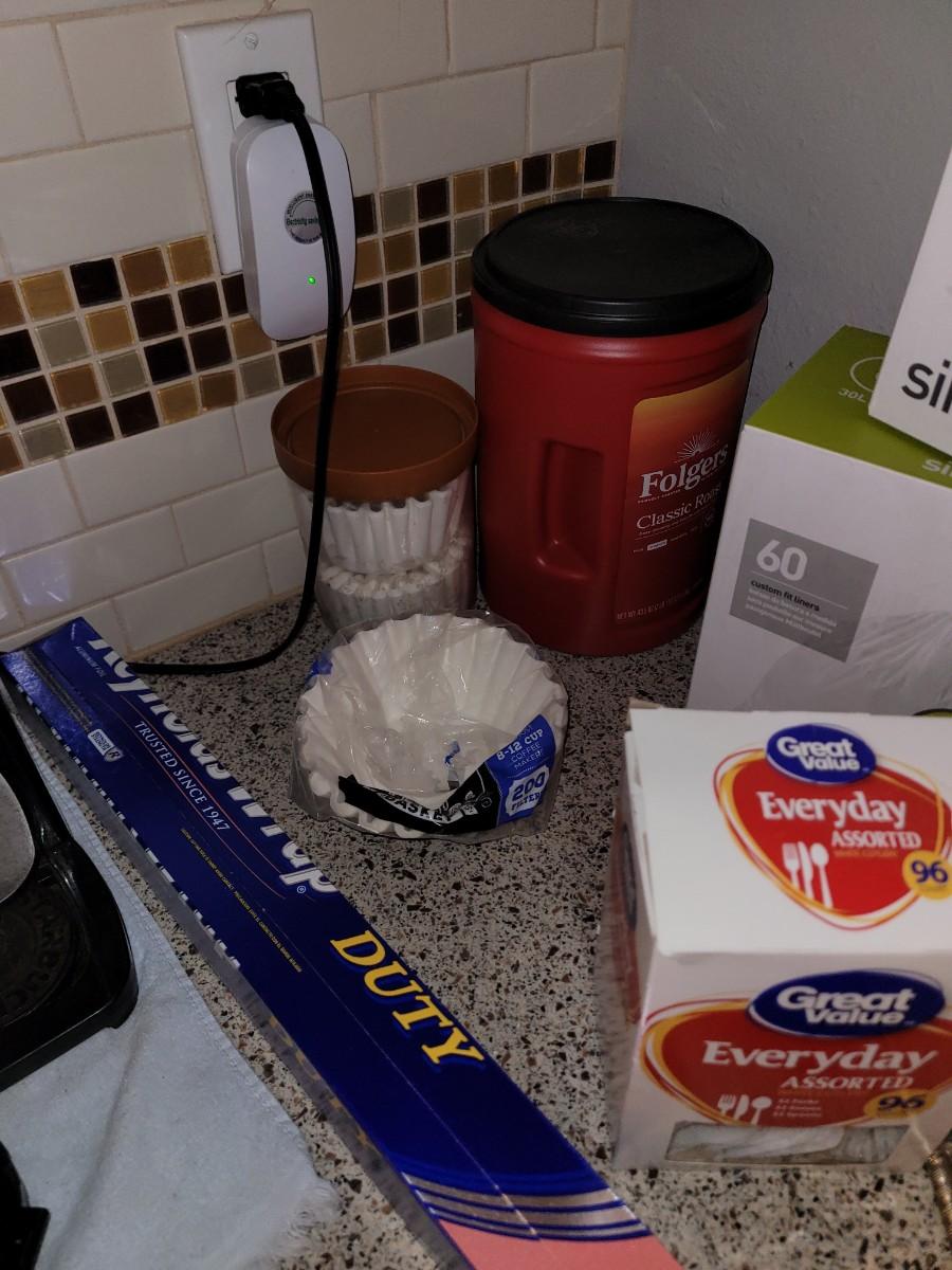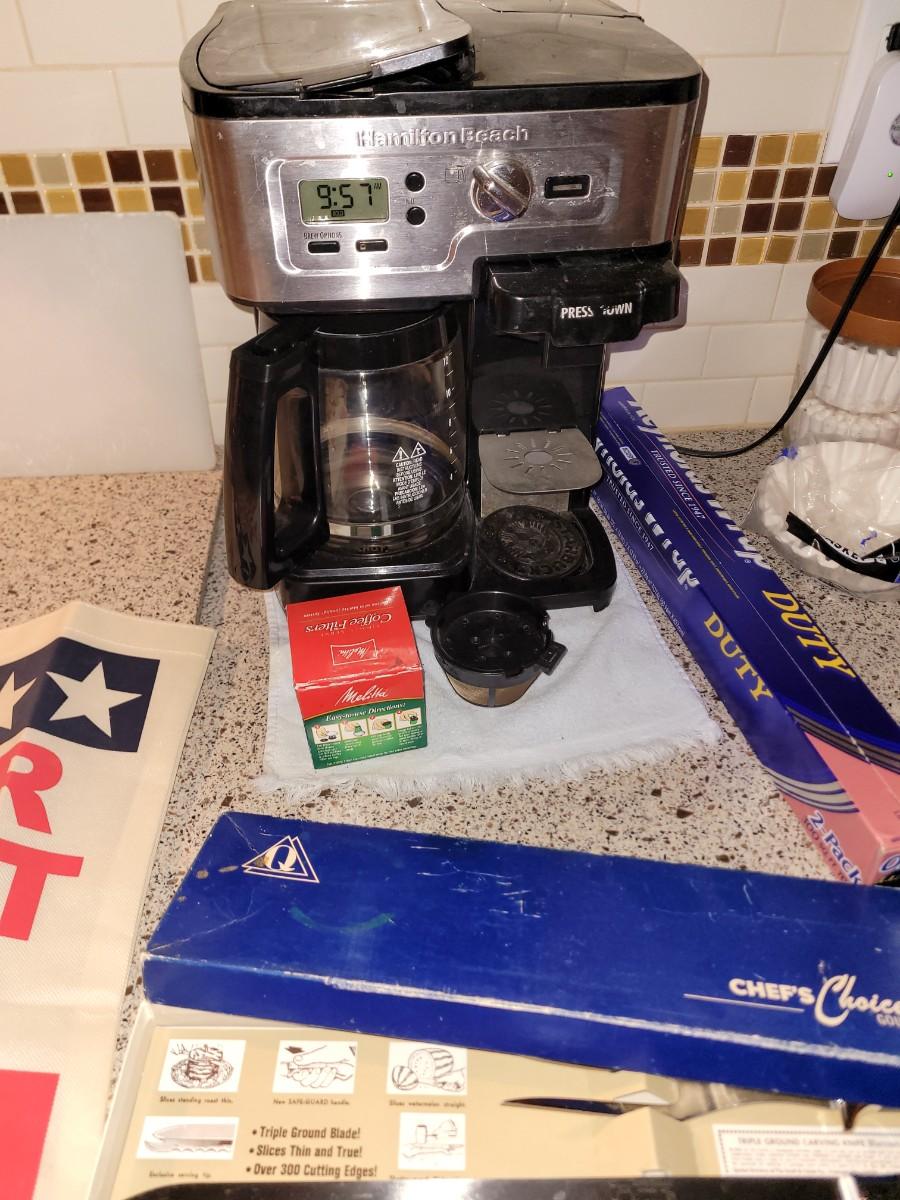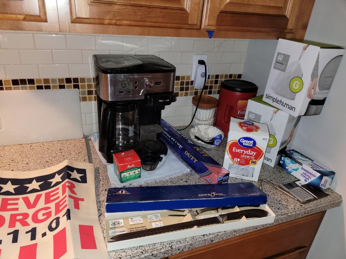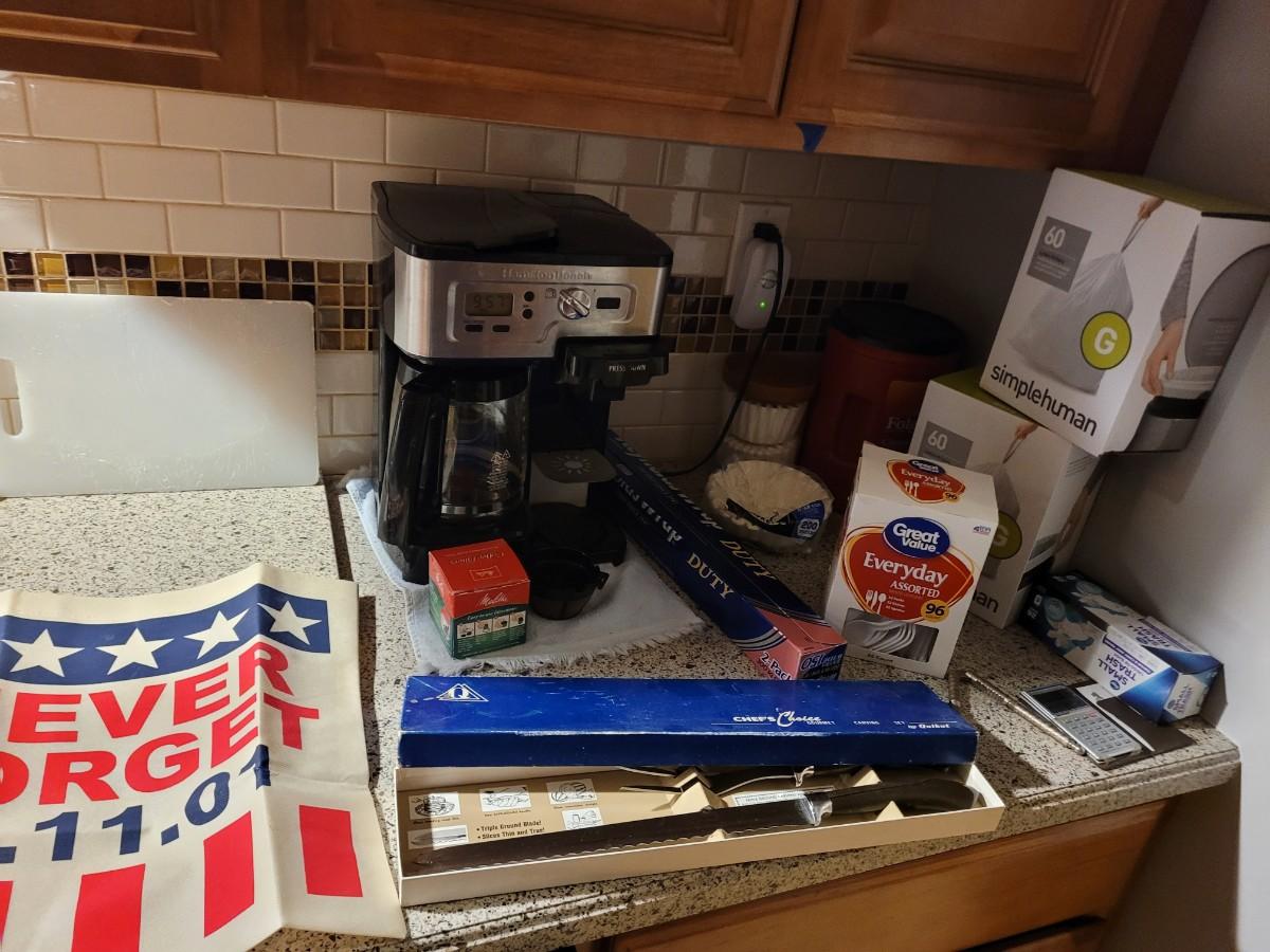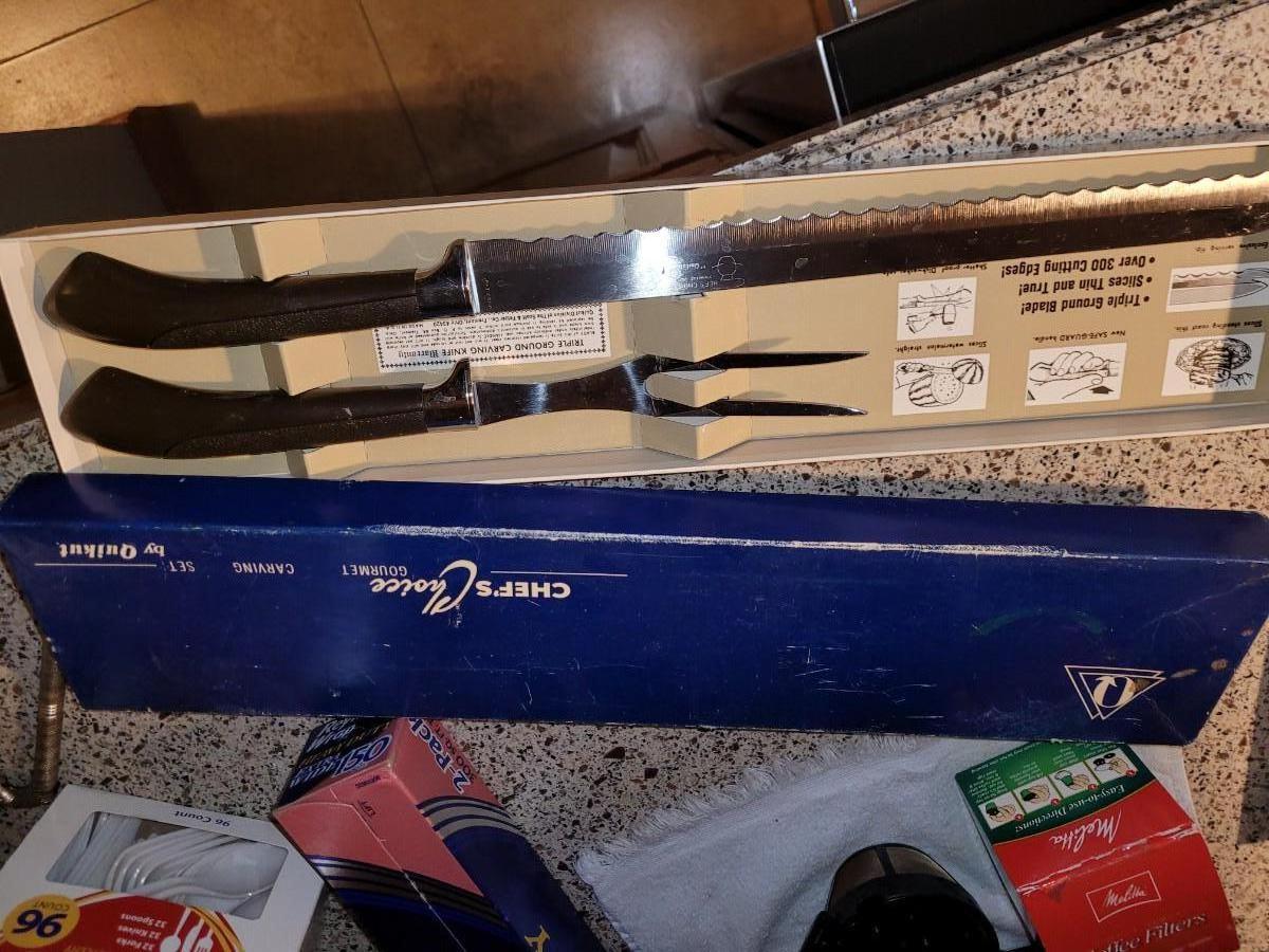 Brass nutcracker, carving set, coffee maker w espresso , 2 unopened boxes of kitchen bags, 9-11 bag and more