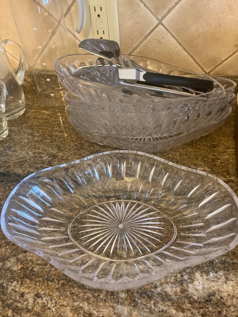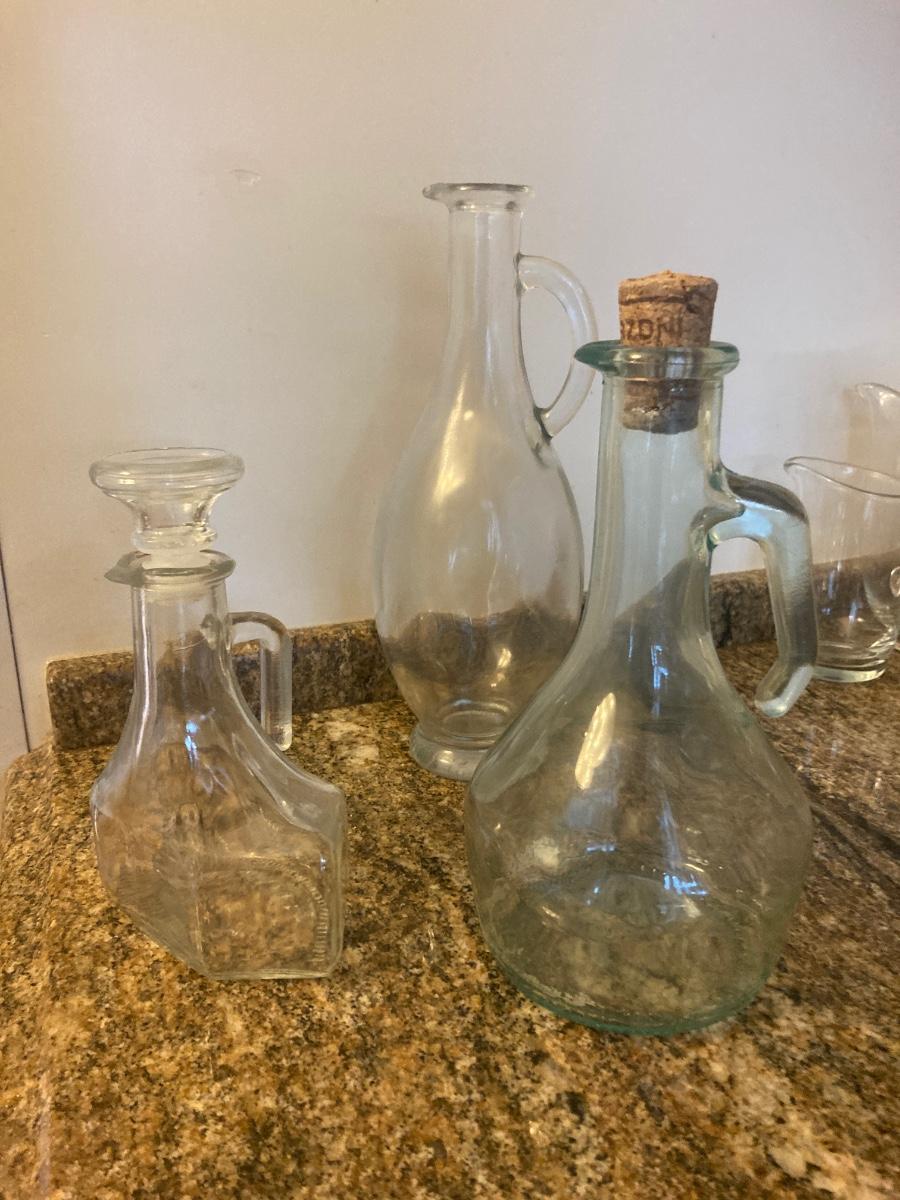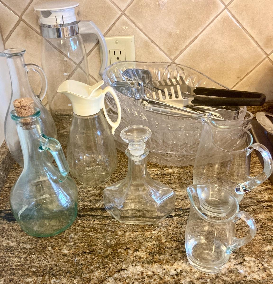 Lot consists of 7 glass pitcher/oil / syrup decanters , 4 pair of stainless steels tongs and 5 plastic fluted serving bowls. (1 1/2 x 4 1/2)
