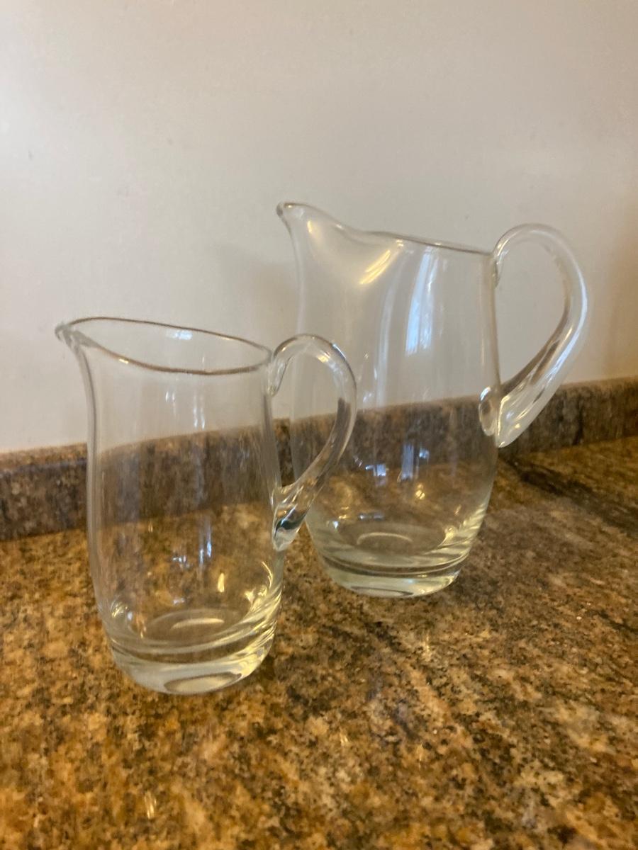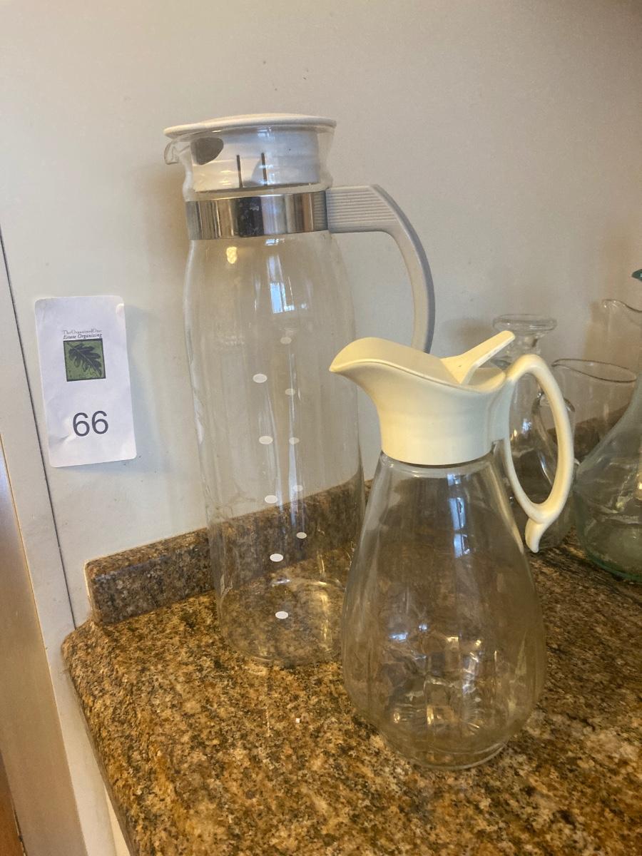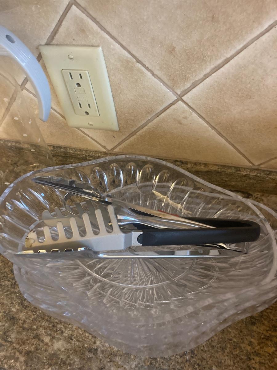 Lot consists of 7 glass pitcher/oil / syrup decanters , 4 pair of stainless steels tongs and 5 plastic fluted serving bowls. (1 1/2 x 4 1/2)