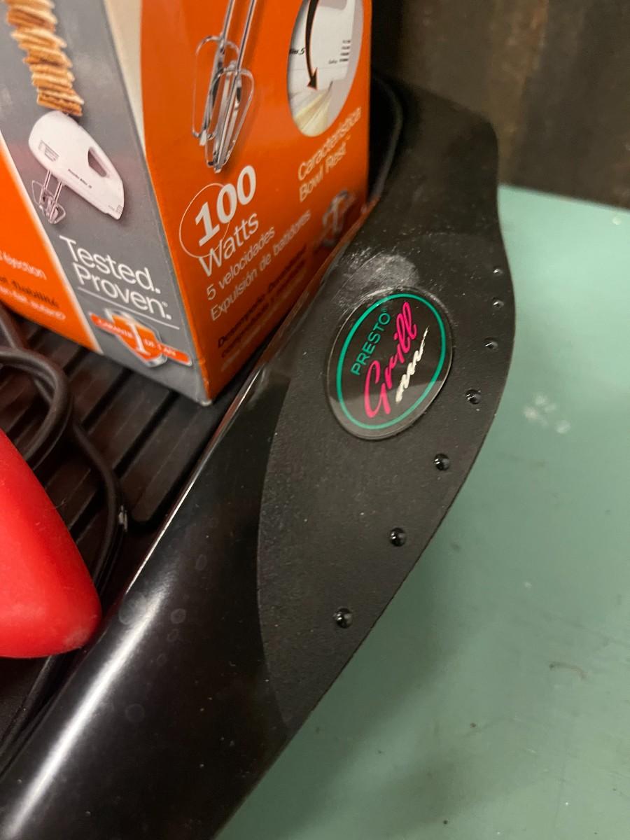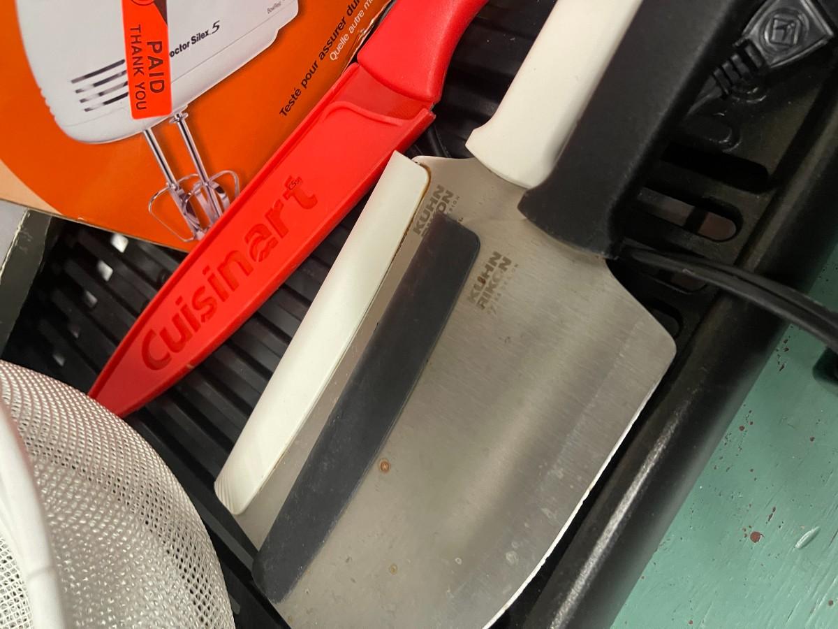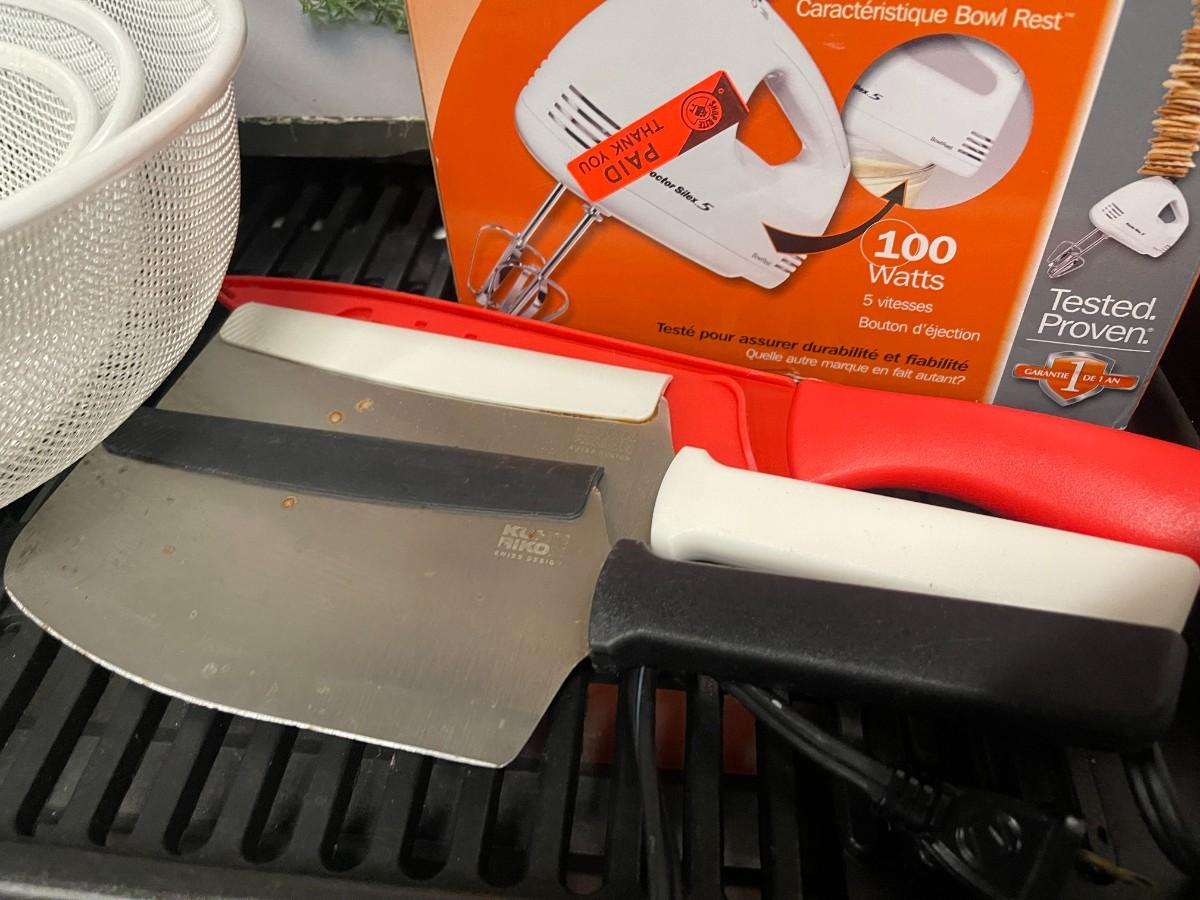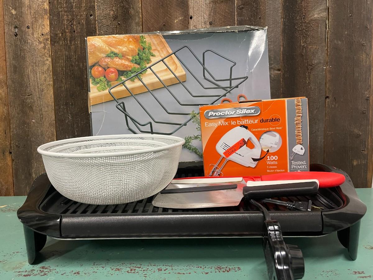 Includes: Proctor Silex hand mixer (new, in box), Kuhn Rikon & Cuisinart Knives, set of white mesh nesting bowls, Amco roast rack and Presto electric grill.
