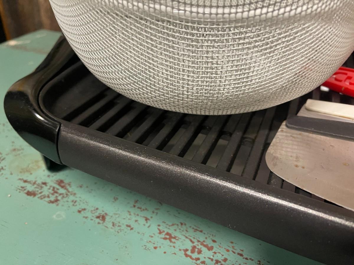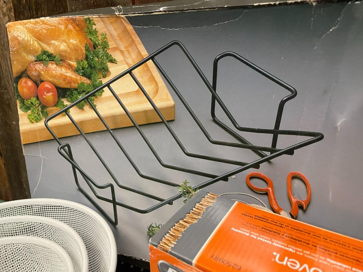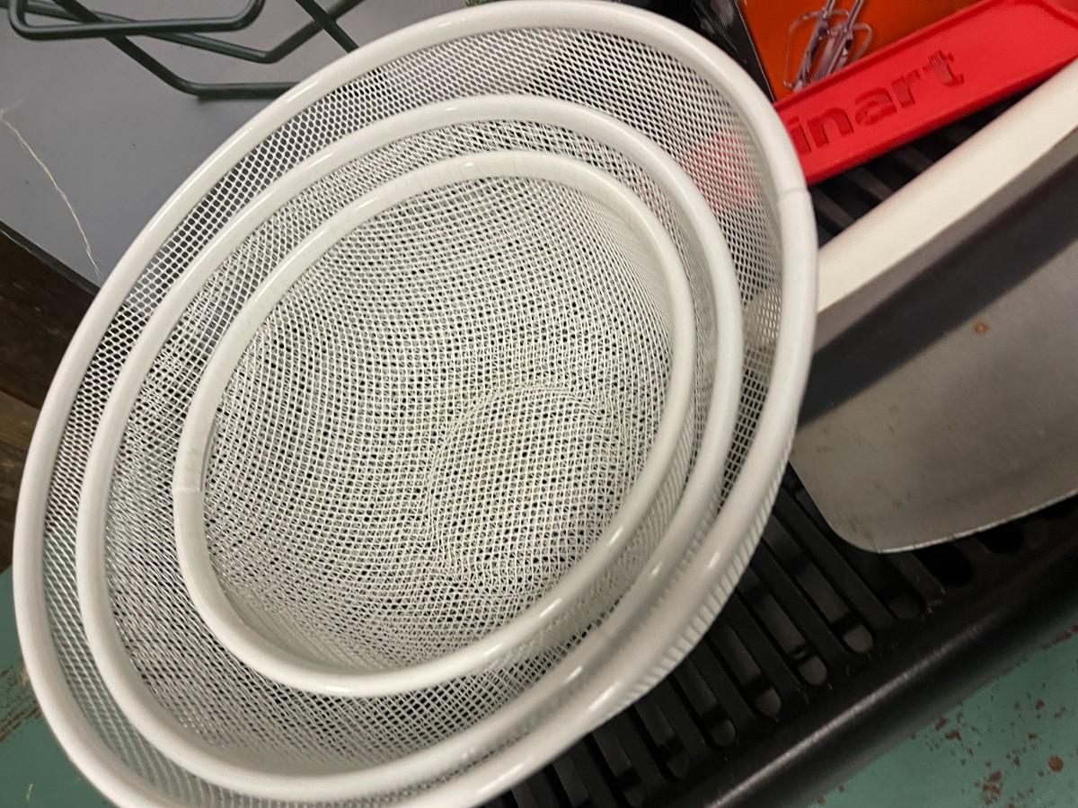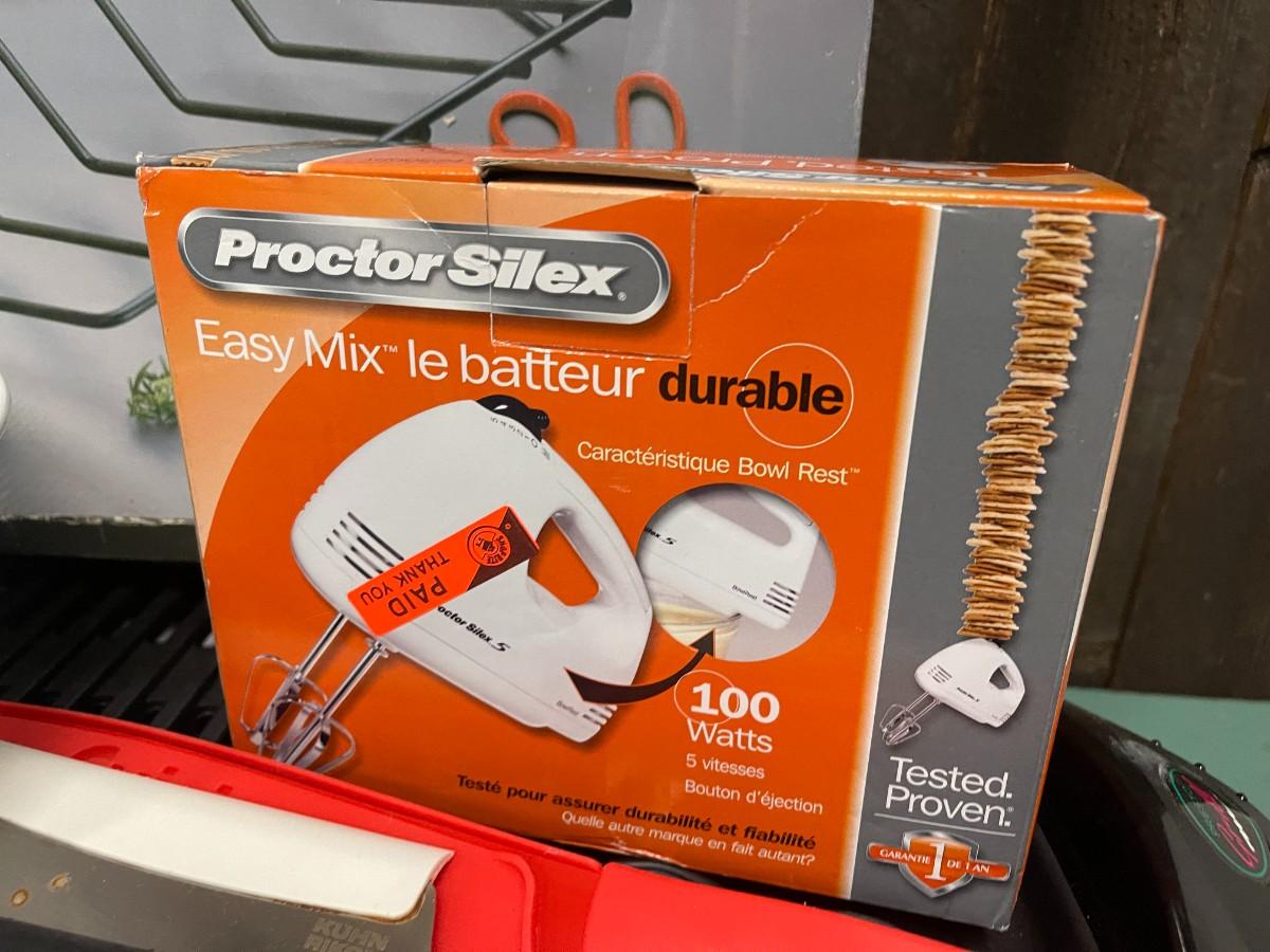 Includes: Proctor Silex hand mixer (new, in box), Kuhn Rikon & Cuisinart Knives, set of white mesh nesting bowls, Amco roast rack and Presto electric grill.
