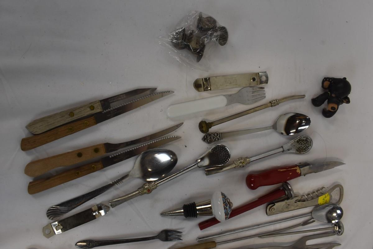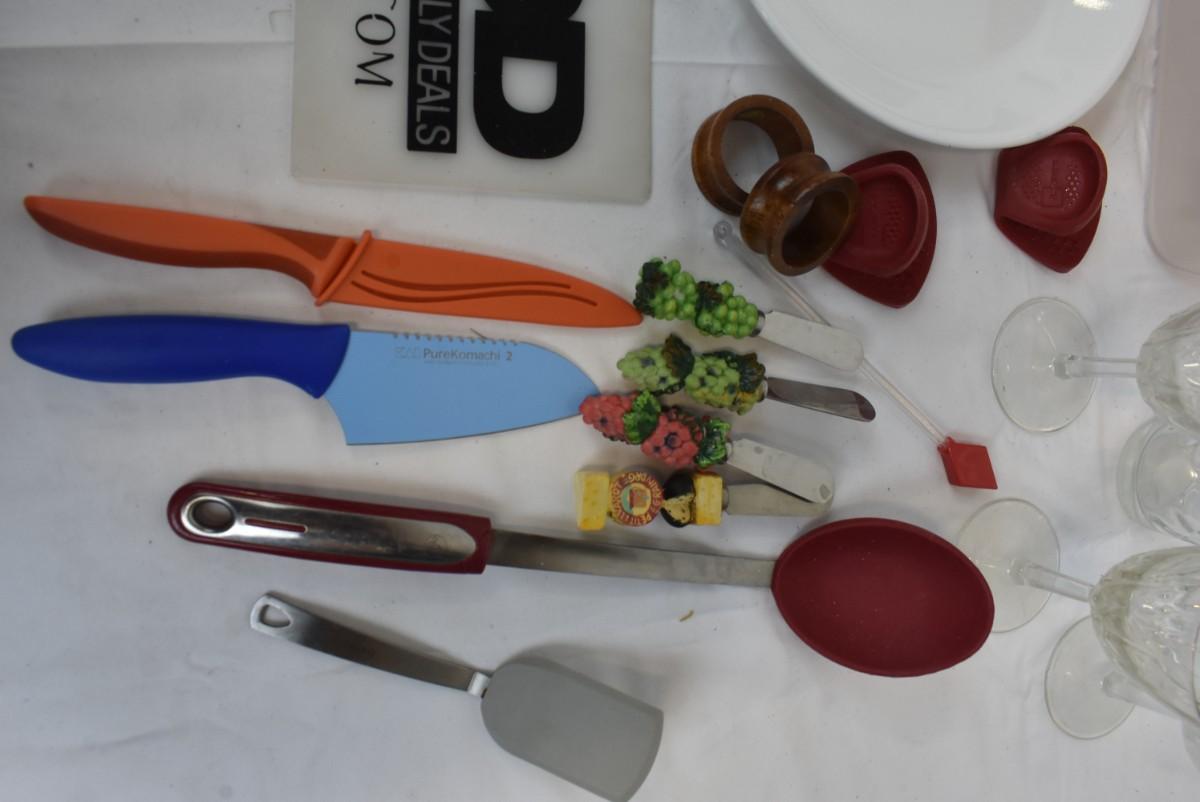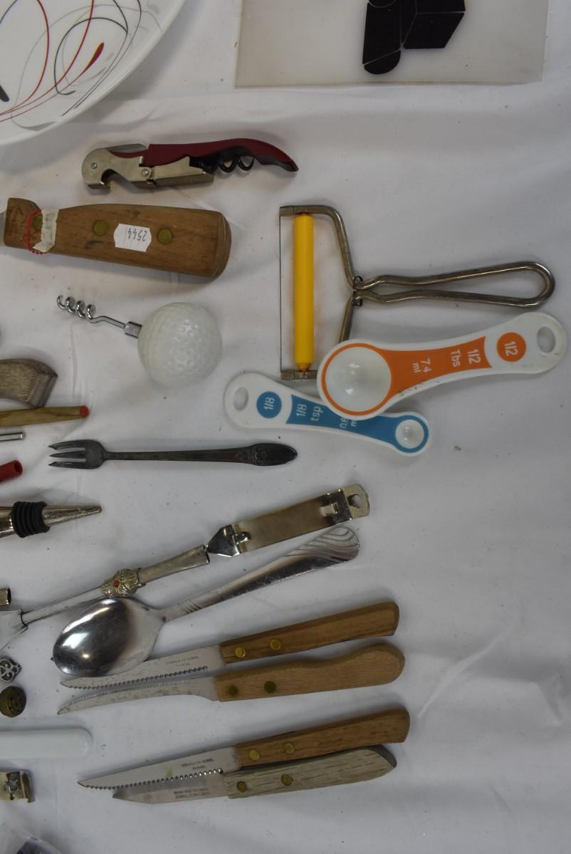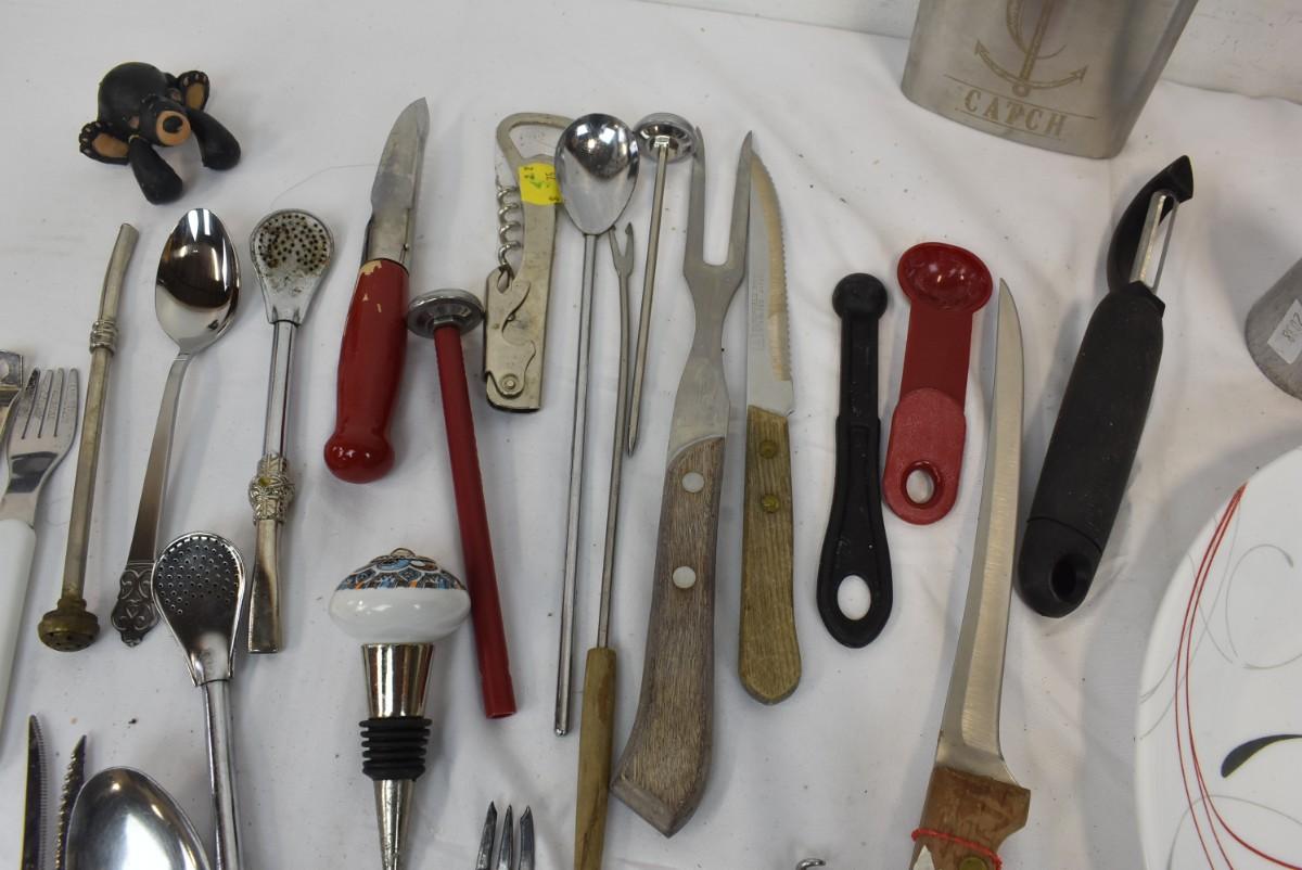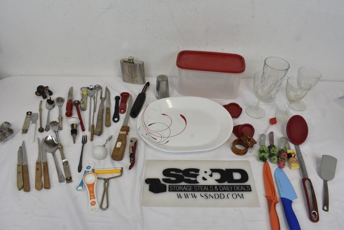Lot of Kitchen Items, Knifes, Cheese Spreaders, Utensils, Corelle Plate