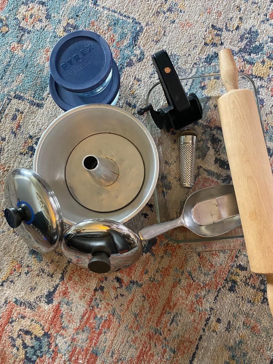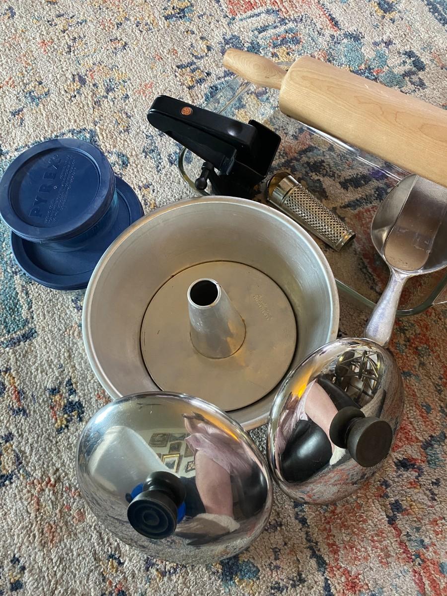 9 x 13 pyrex, Parmesan cheese grater, nutmeg grinder, angle food cake pan, 2 Revere ware lids, heavy wood rolling pin, and 2 Pyrex glass food containers.