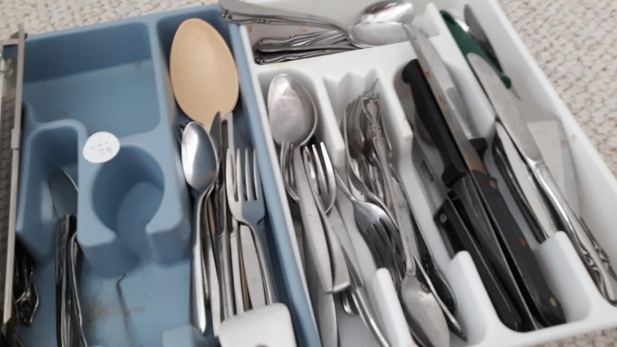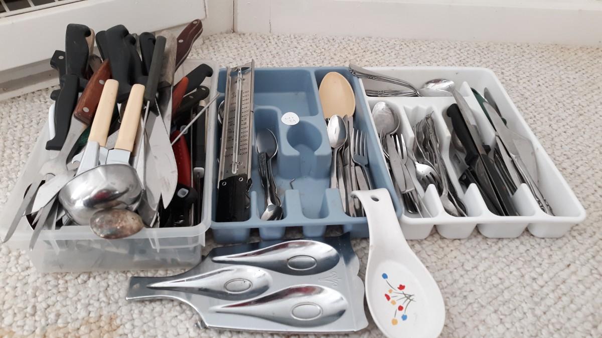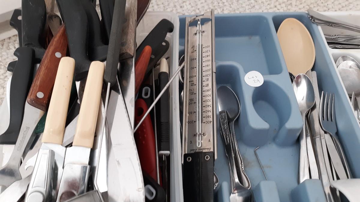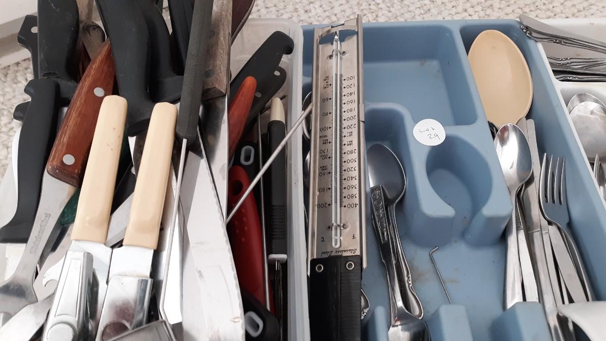 Lot of Kitchen Utensils and spoon rests (white one has a chip). Lots of treasures to go through and look at in this. Lots of vintage utensils.