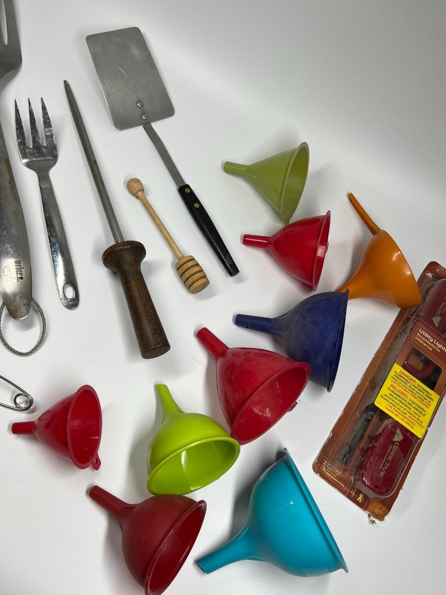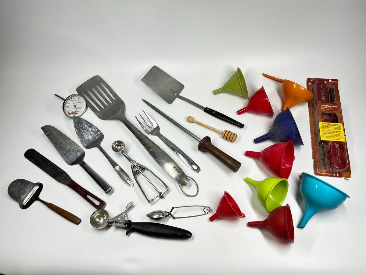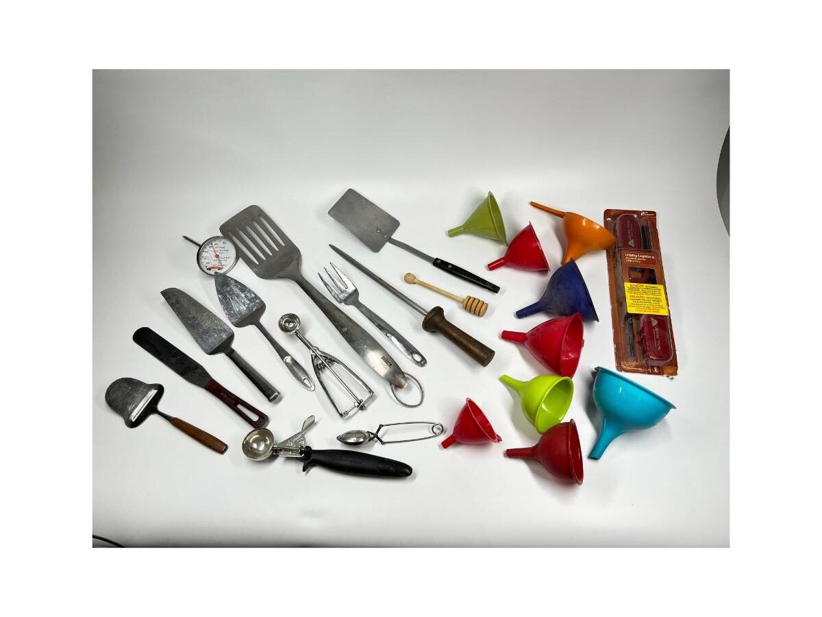 Lot of Kitchenware Utensils Spatulas, Funnels, Ice Cream Scoops & More