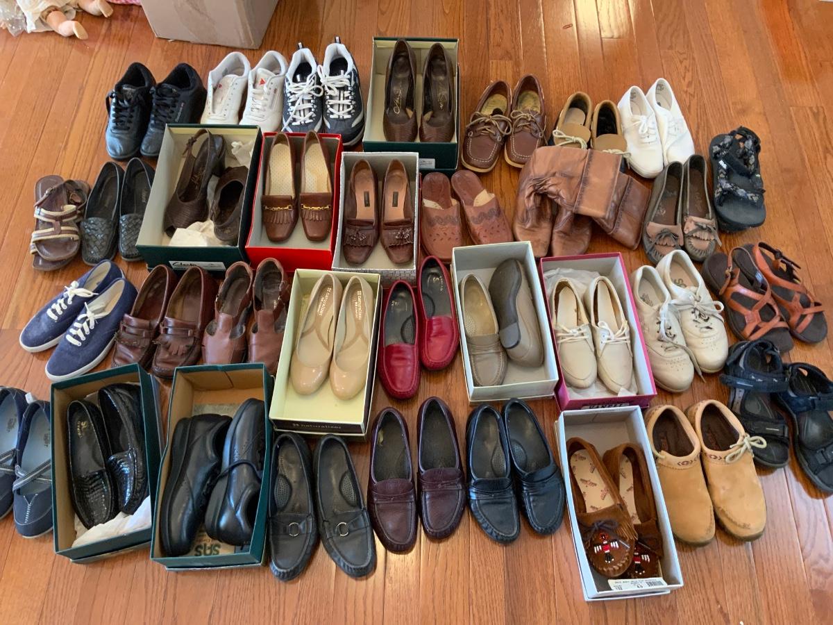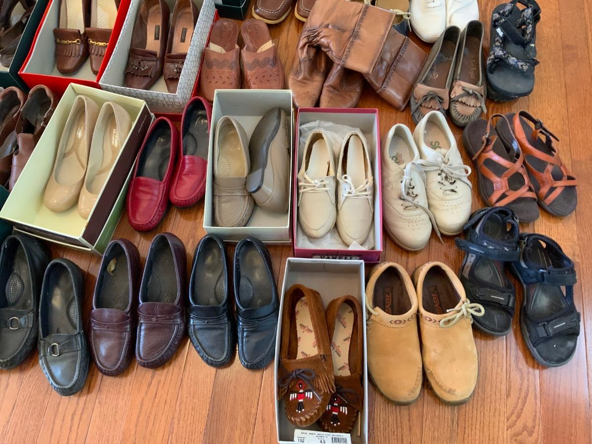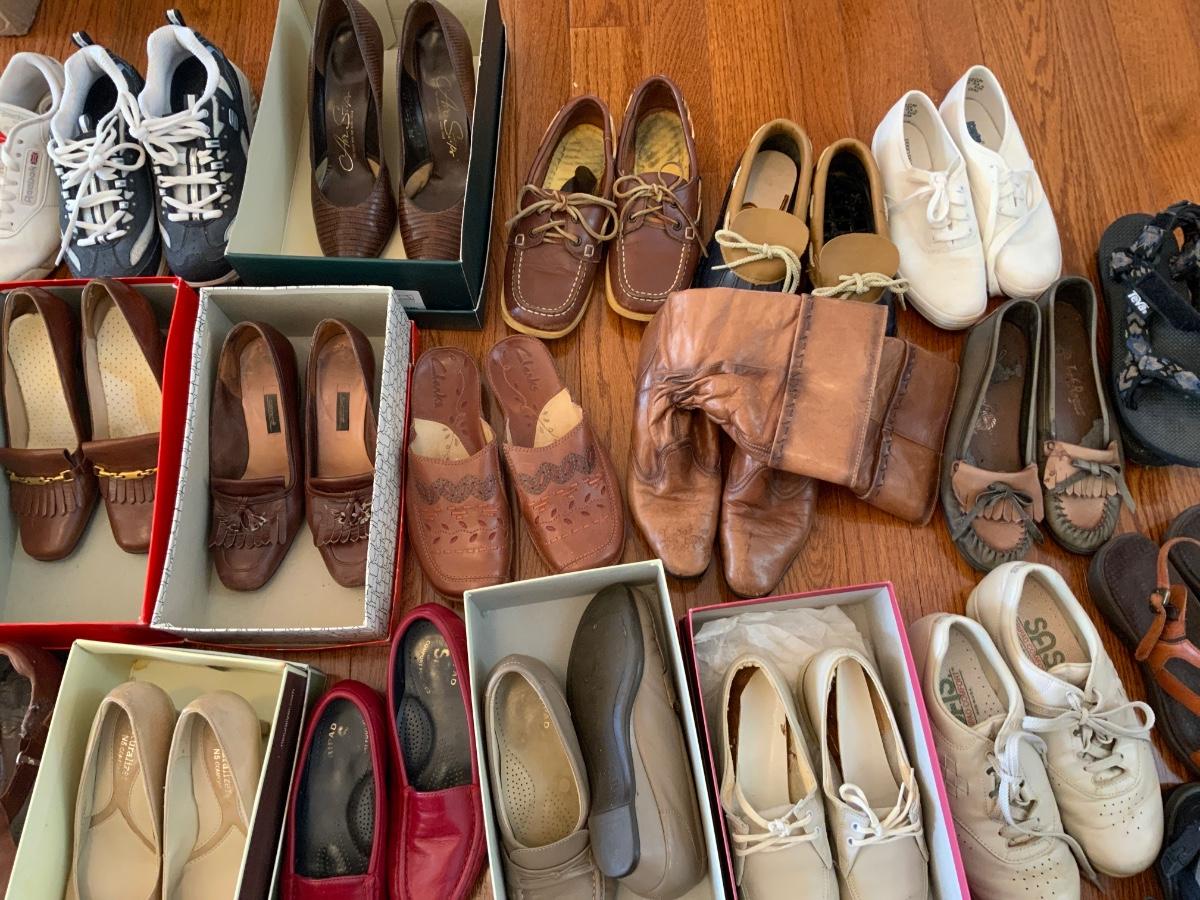 Large Lot of Ladies 4 1/2 shoes including Athletic, Sandals, Dress and Casual. (1 pair of heels a size 7 1/2.) Leather and Canvas. Brands like Naturalizer, Keds, Clarks and More