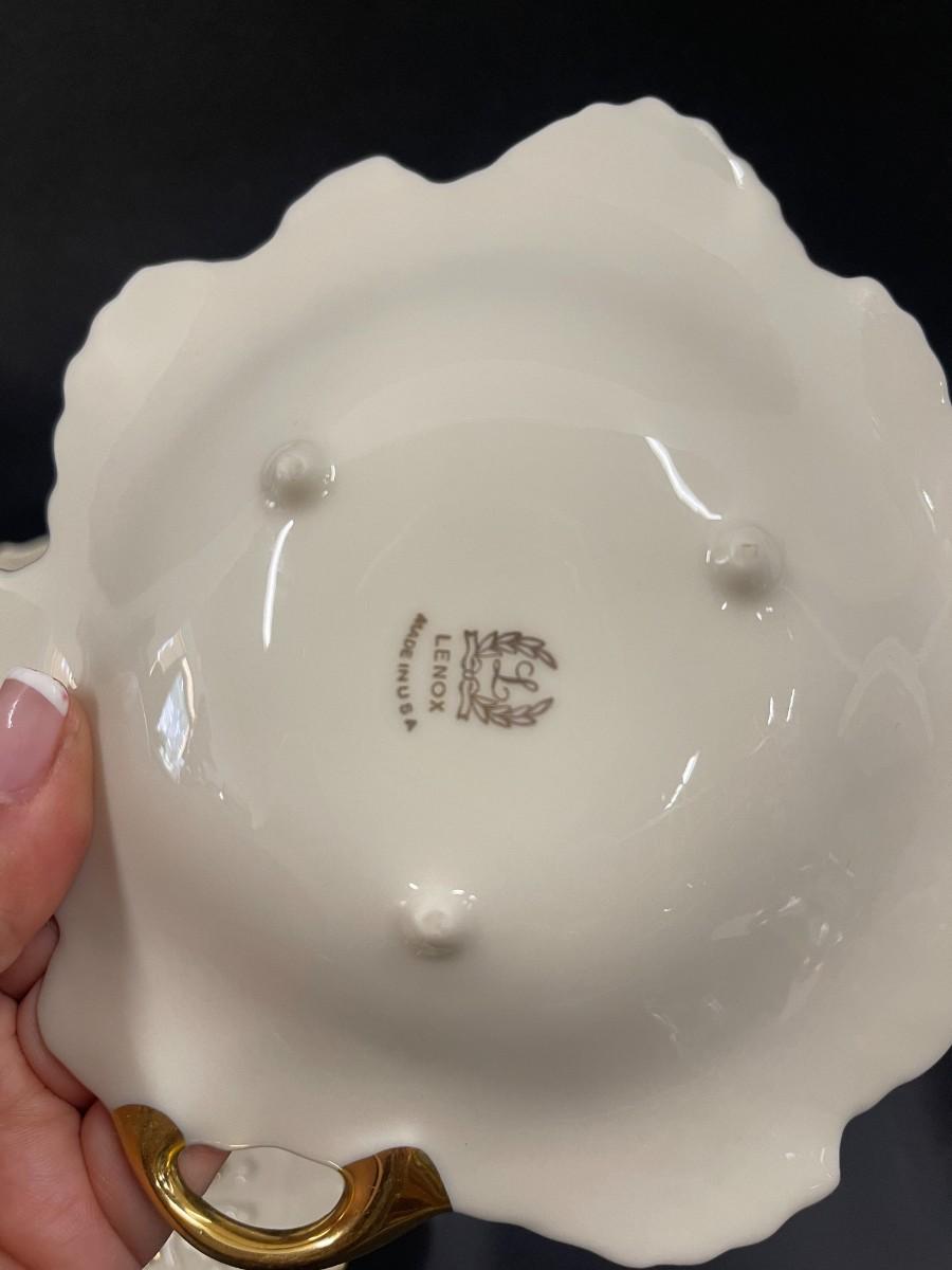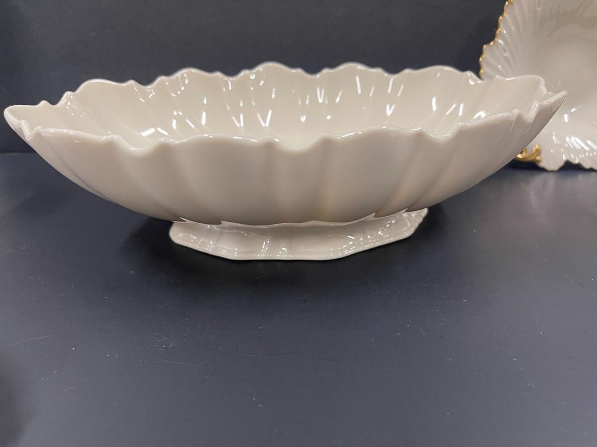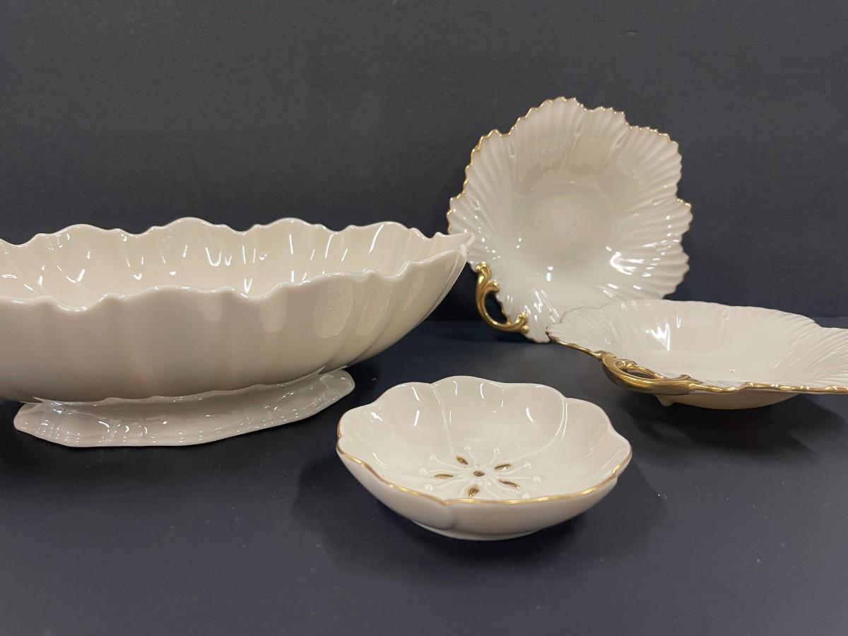Lot of Lenox pieces: 2 leaf shaped dishes with gold rims, one flower shaped trinket dish and one oblong footed bowl (11").
