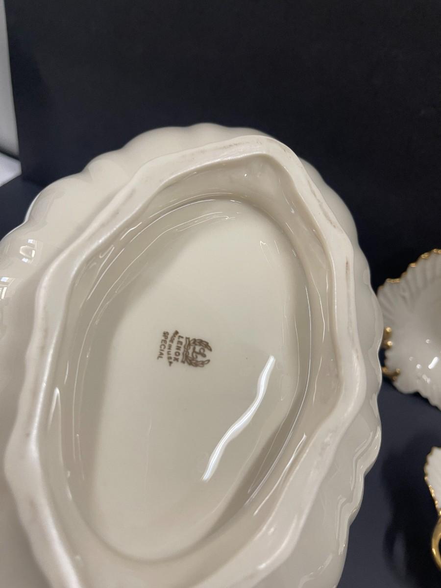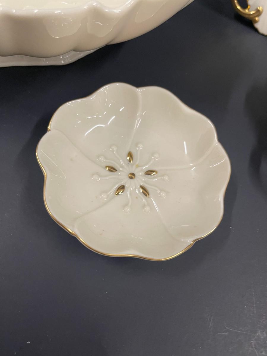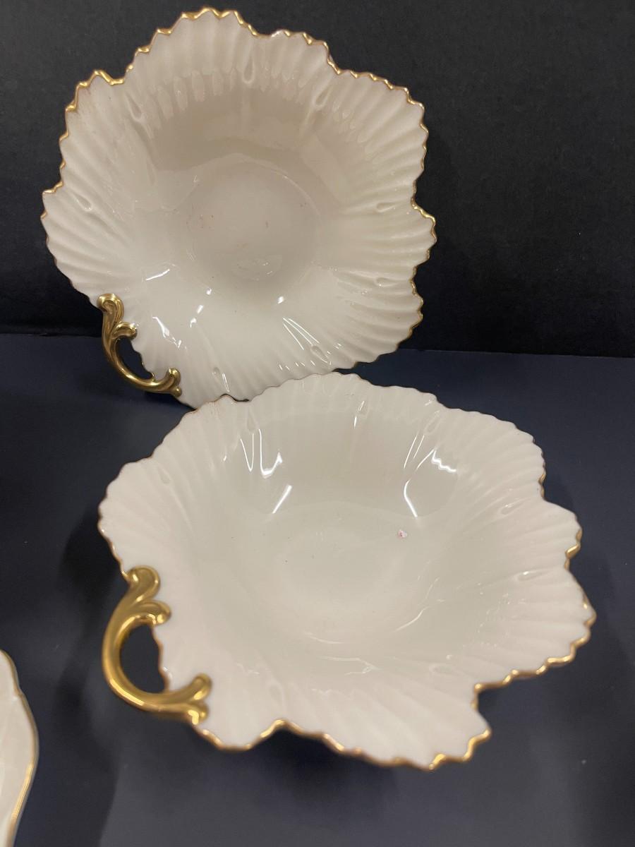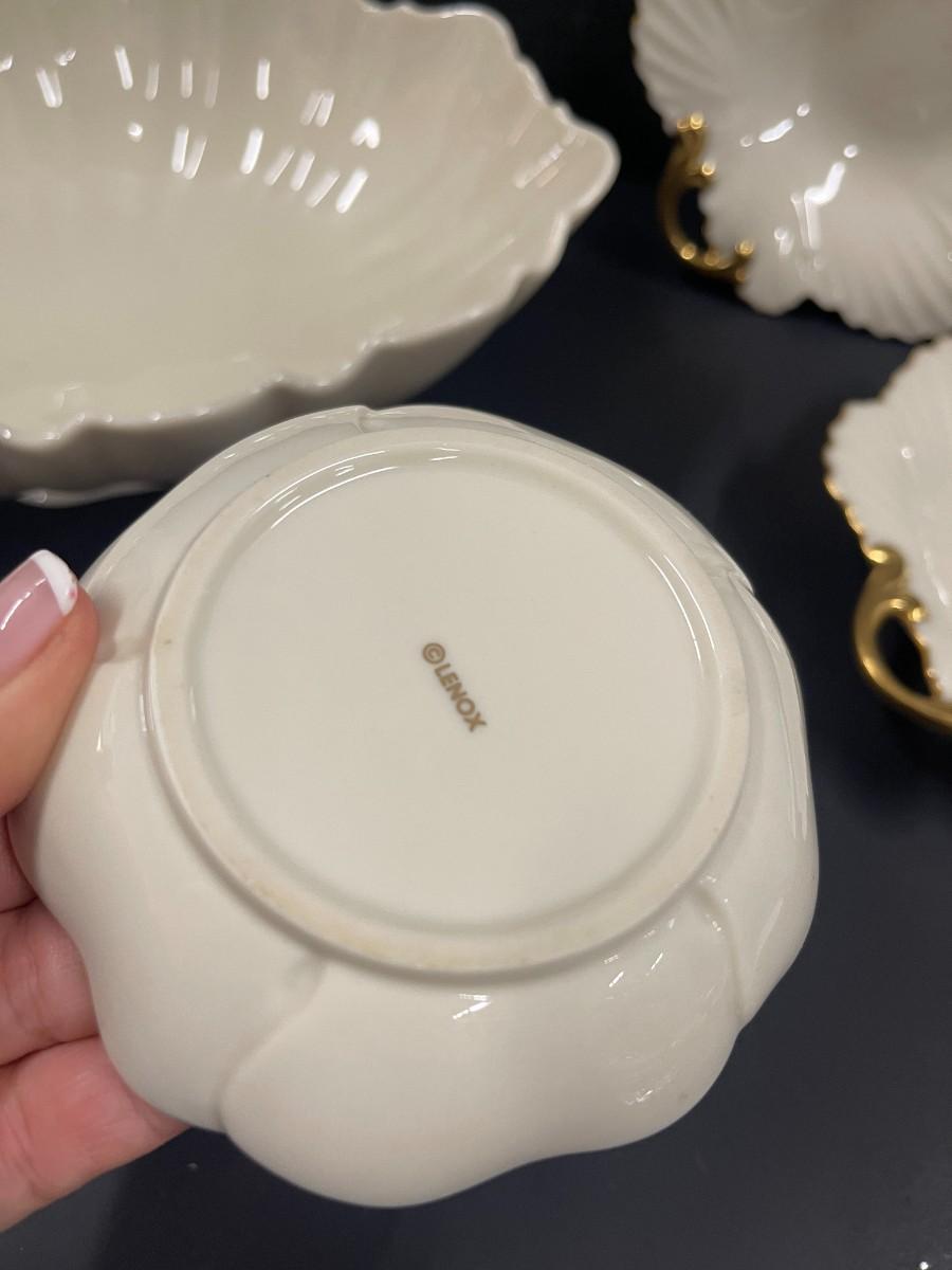 Lot of Lenox pieces: 2 leaf shaped dishes with gold rims, one flower shaped trinket dish and one oblong footed bowl (11").