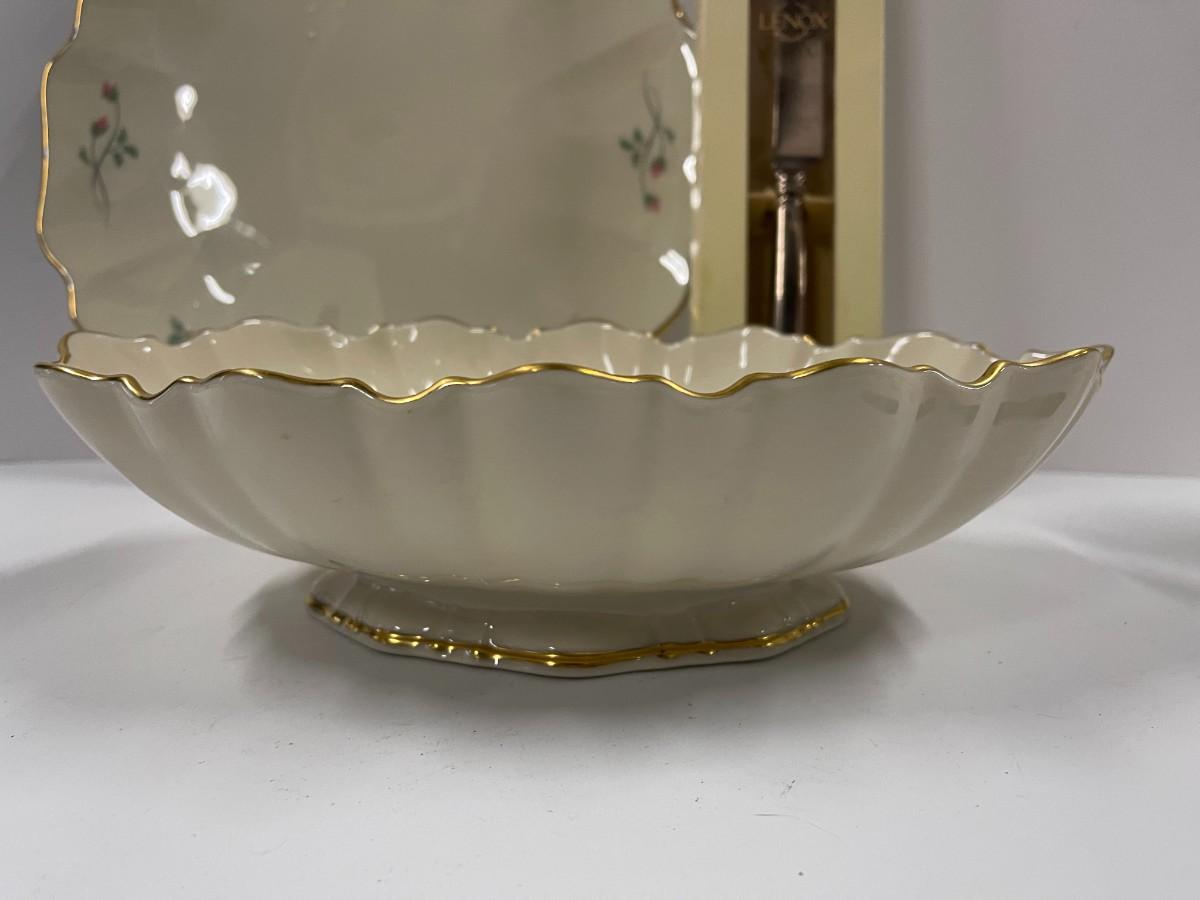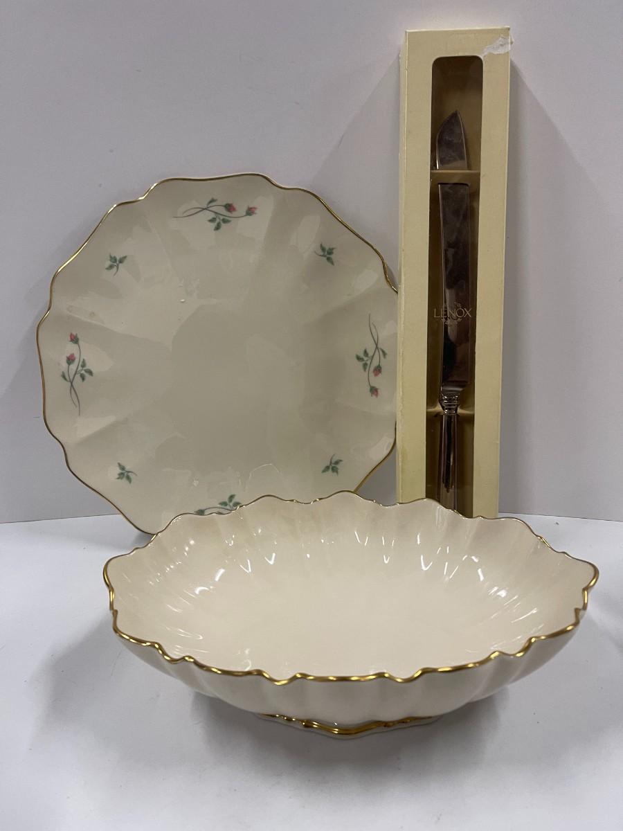 Lot of Lenox: Eternal Frosted Cake Knife, Rose Manor Cake Plate and Lenox Special Bowl.