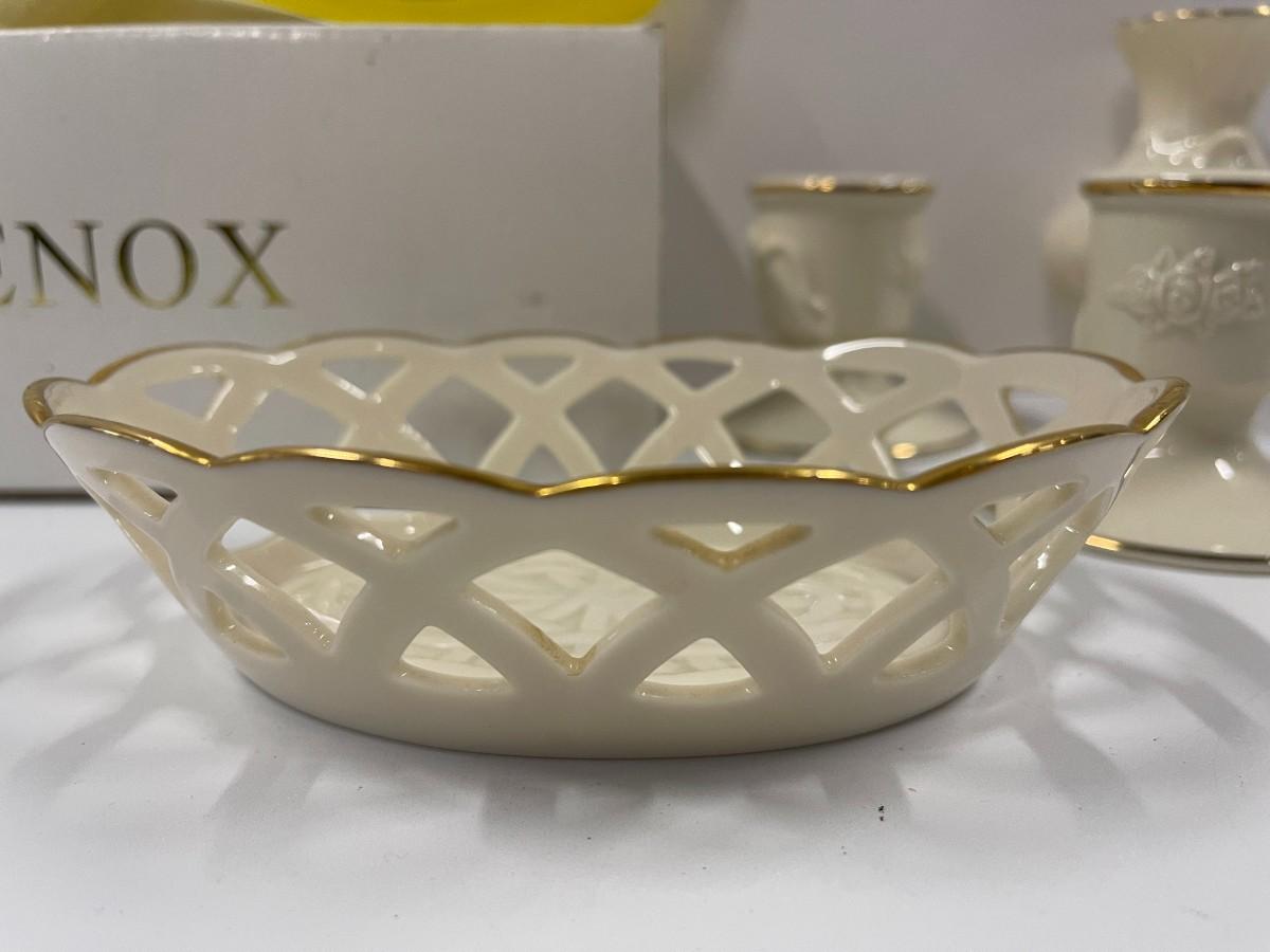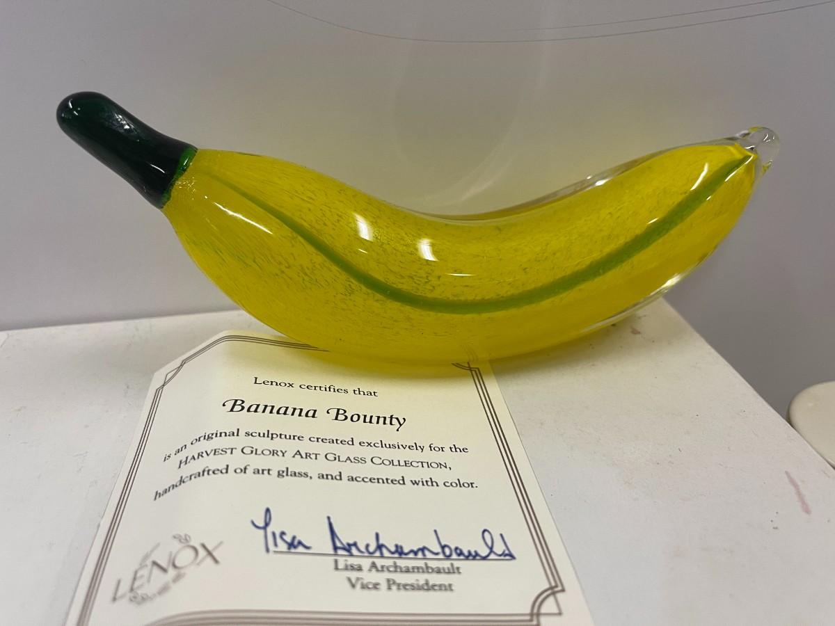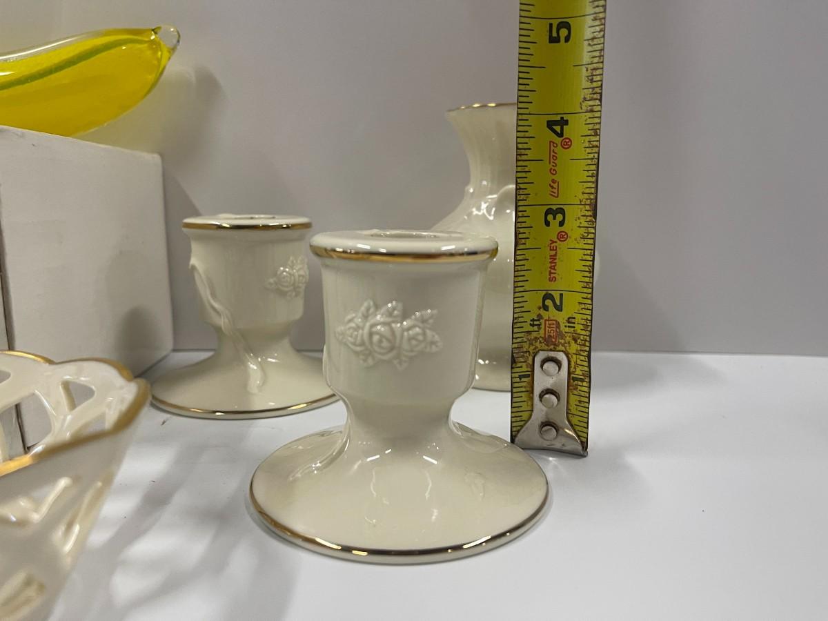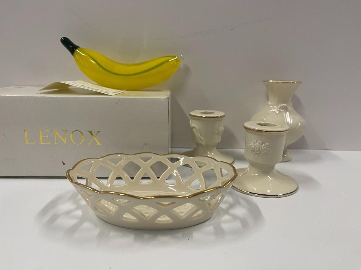Lot of Lenox includes: bud case, pierced edge bowl, pair of candle sticks and art glass banana. All in very good condition. Banana is in new condition in original box.