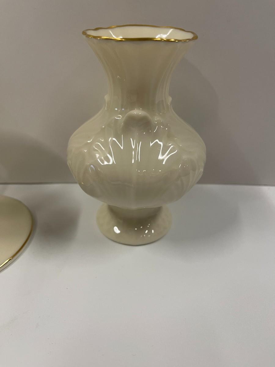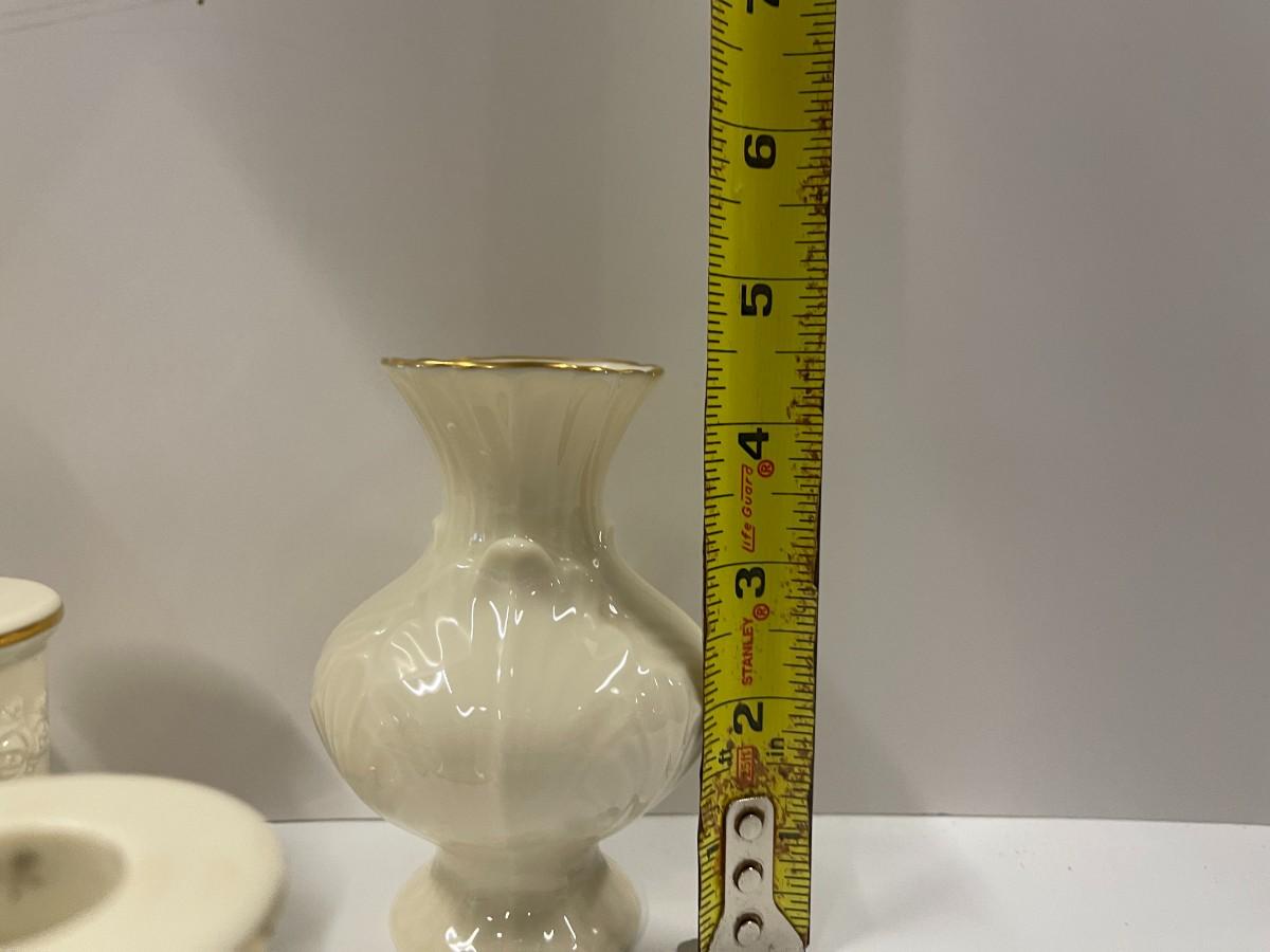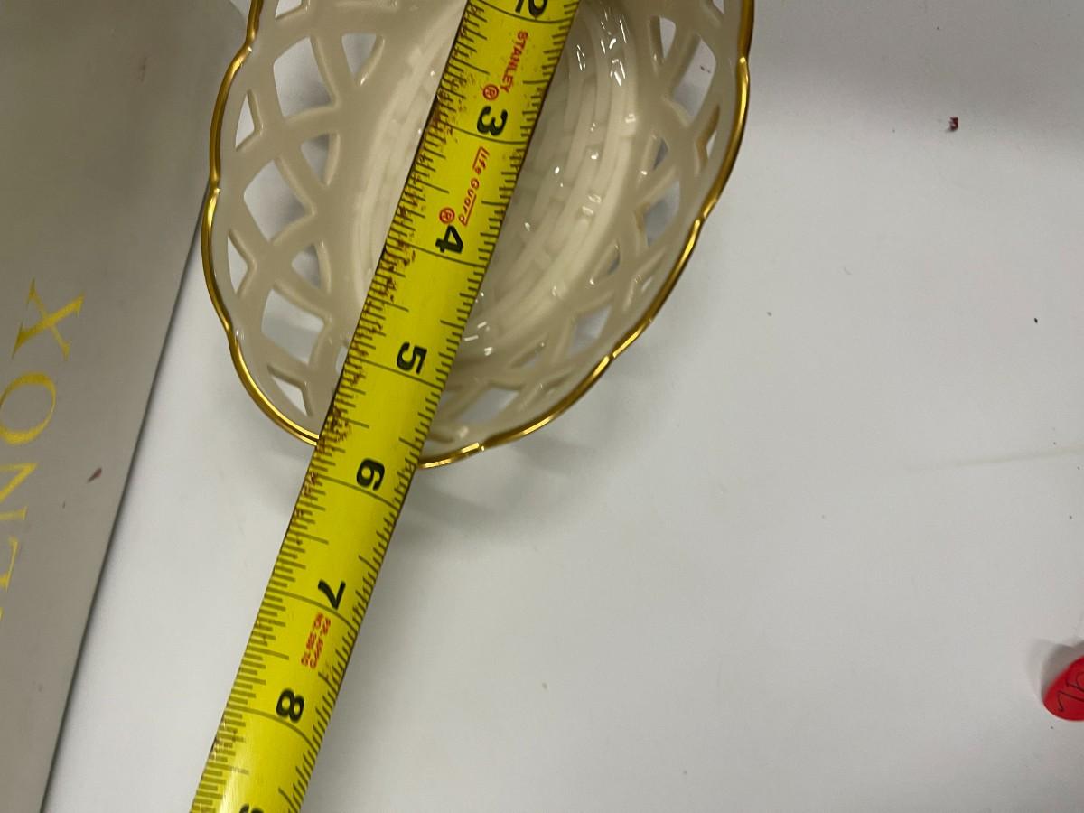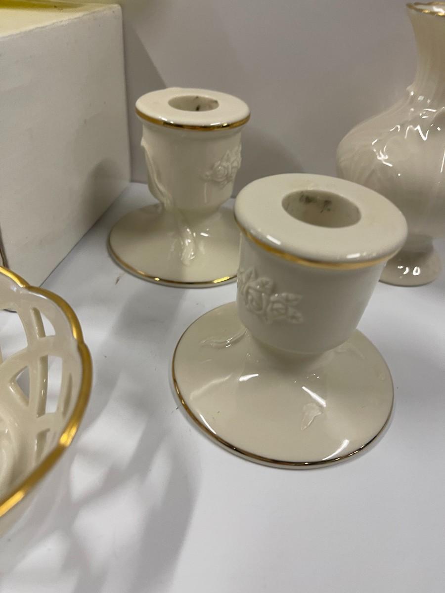 Lot of Lenox includes: bud case, pierced edge bowl, pair of candle sticks and art glass banana. All in very good condition. Banana is in new condition in original box.