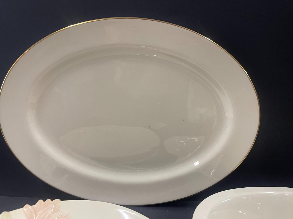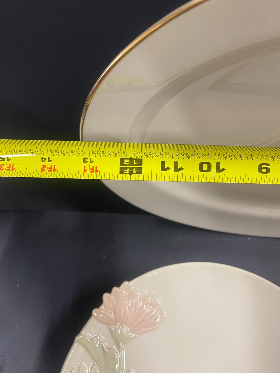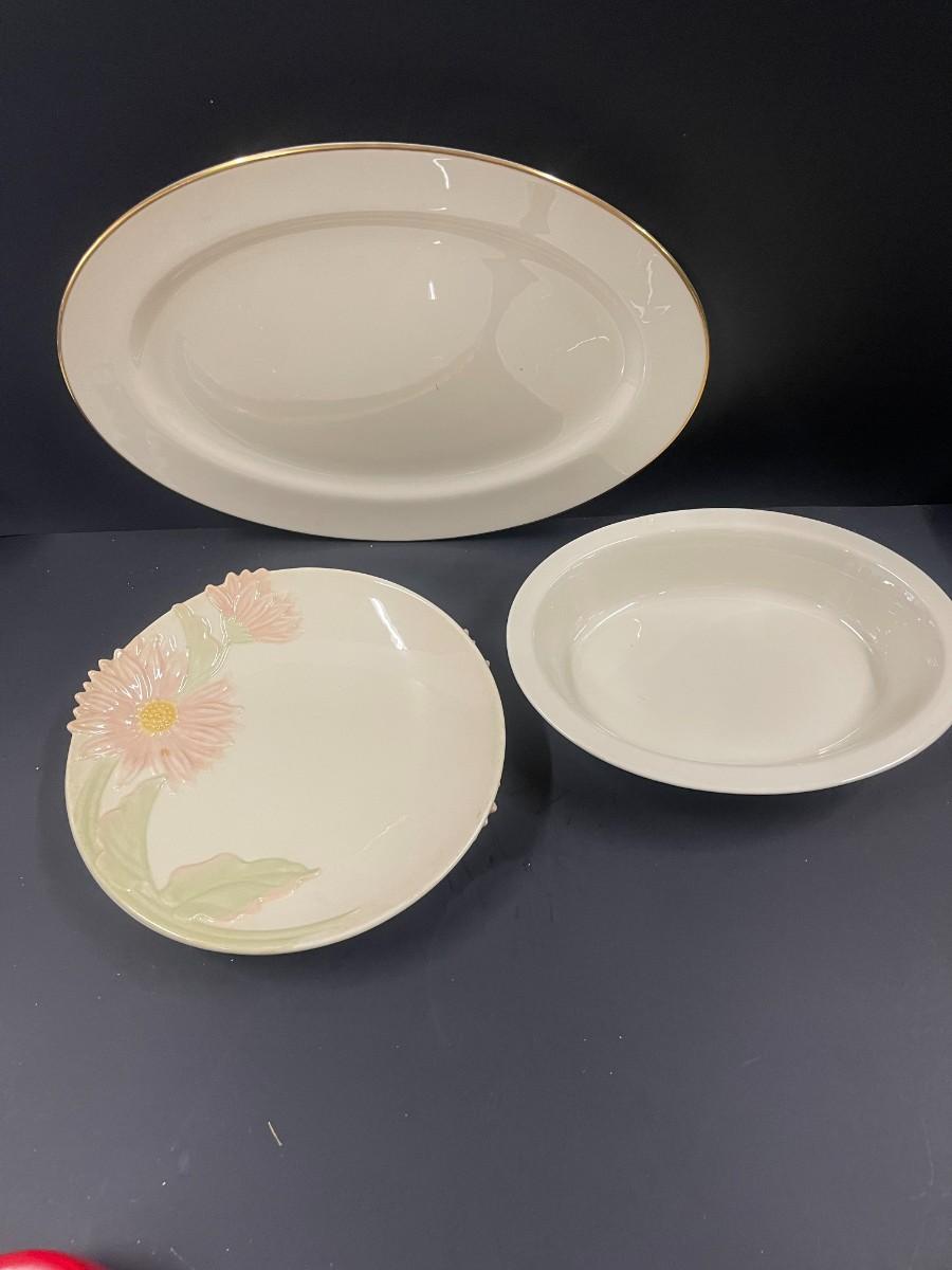 Lot of Lenox. Includes oval serving platter with gold rim, ivory china oval bowl & pair of Floral Blossoms Gerber Daisy dessert plates, new condition.