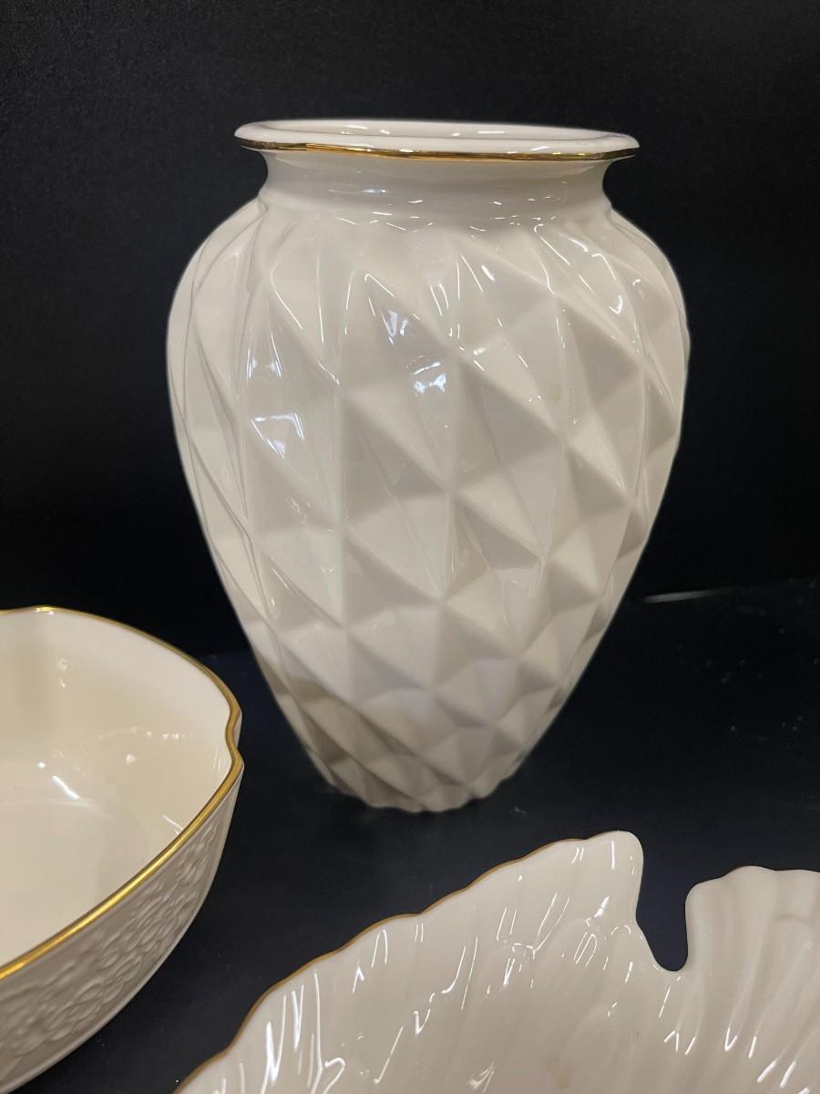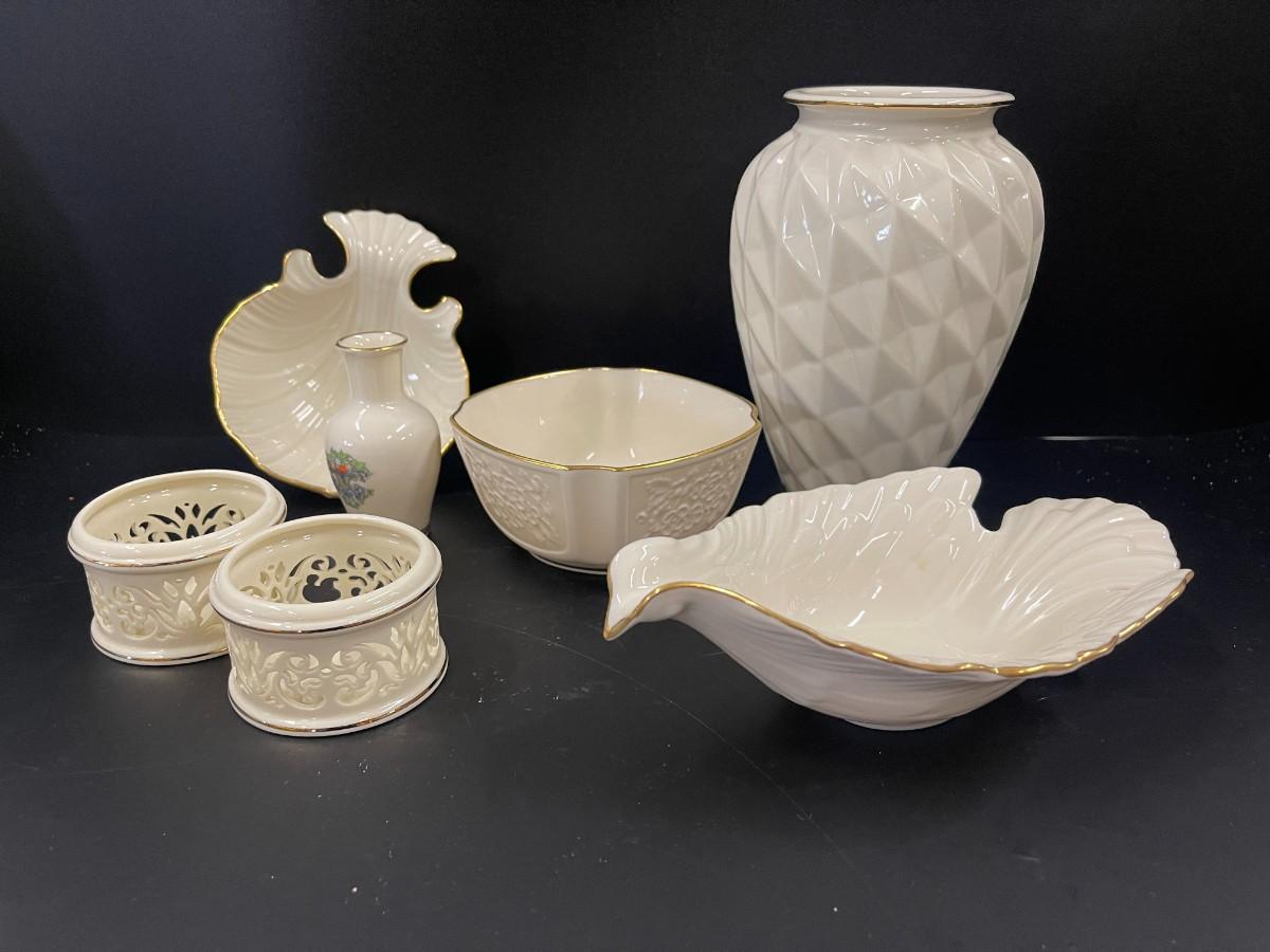 Lot of Lenox incudes gold rimmed, geometric vase, two matching tea light holders, mini vase, shell dish and gold rimmed bowl. All in excellent condition. # 1192