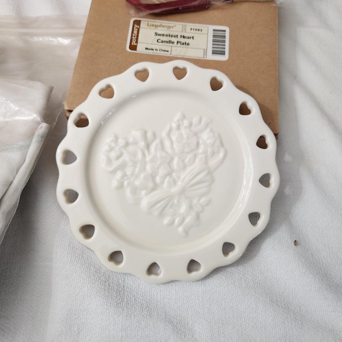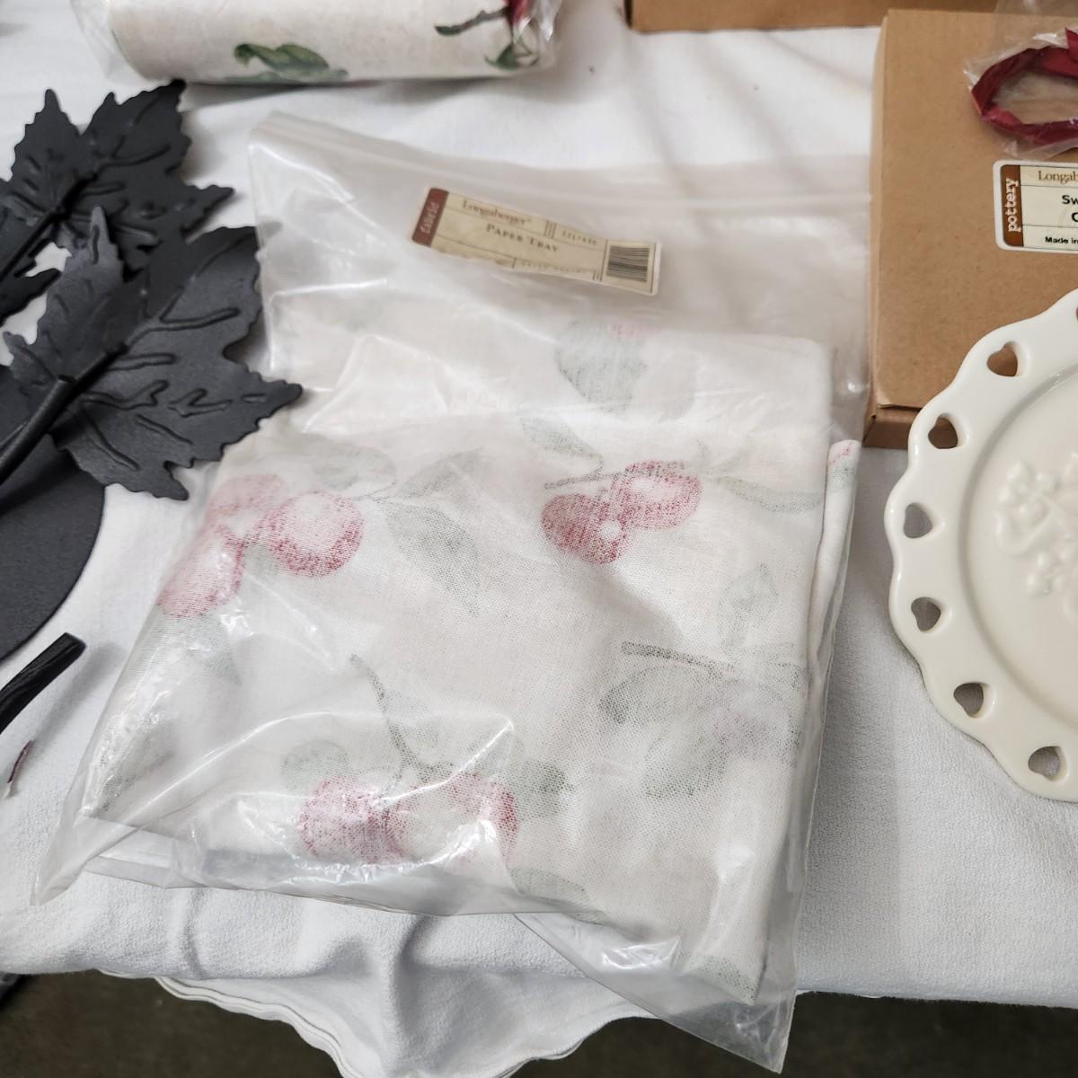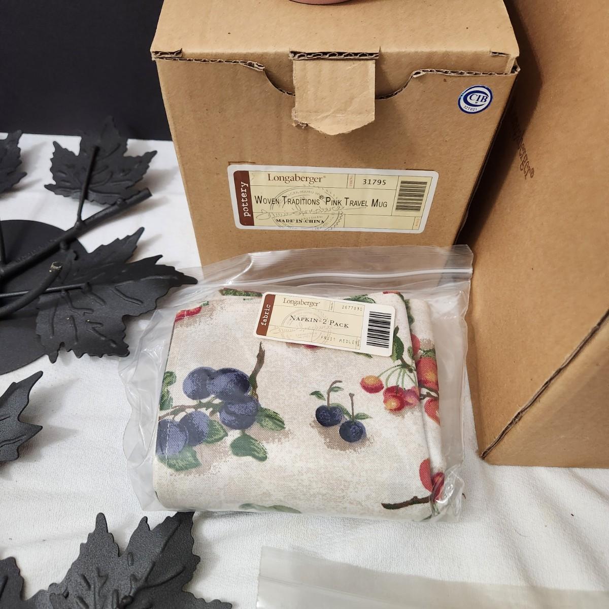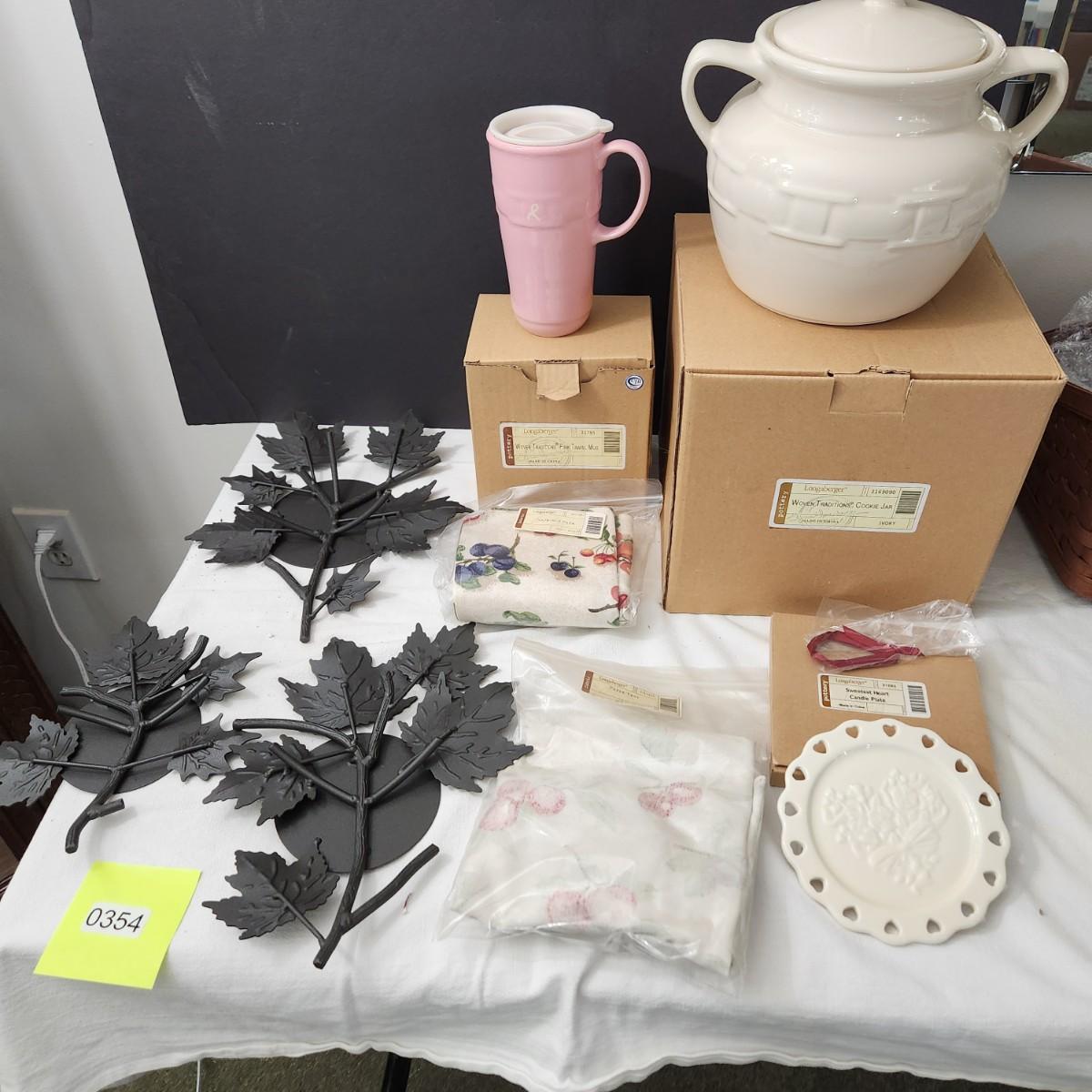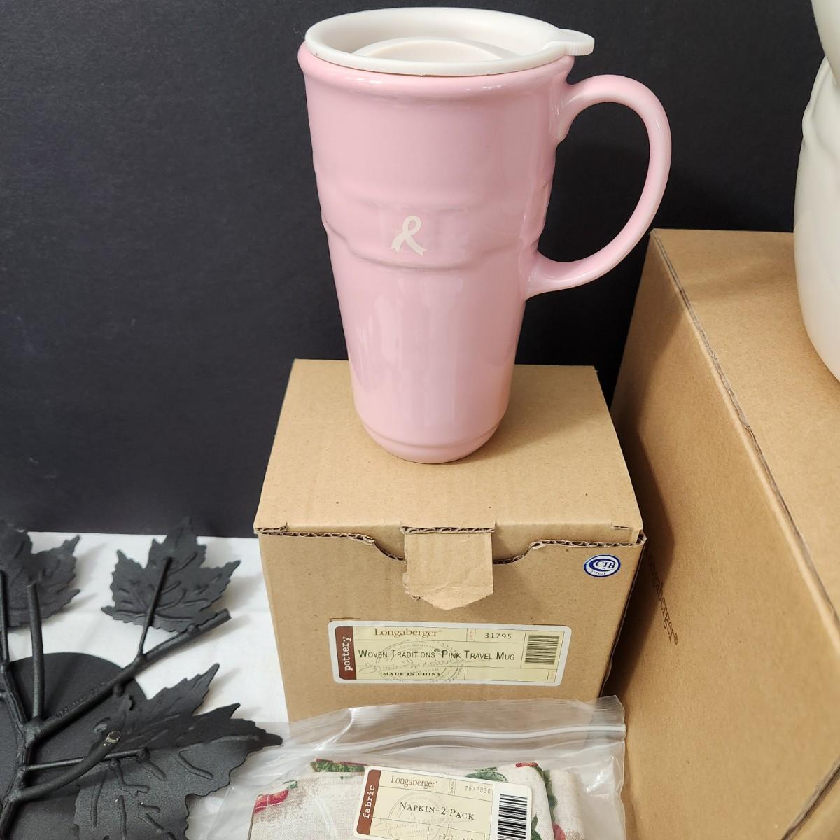 Lot of Longaberger Pottery Cookie Jar Pink Travel Mug Napkins Sweetest Heart Candle Plate Wrought Iron Centerpieces