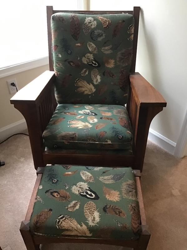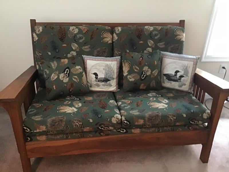 Beautiul Love seat with fabric cushions- mid green with feathers. 64” L and 29” deep. Chair and ottoman 38” tall chair and 21” deep. Ottoman is 22”x14”x15”H. Extra spool of fabric. Order Invoice included in pics. Originally purchased for 5800.