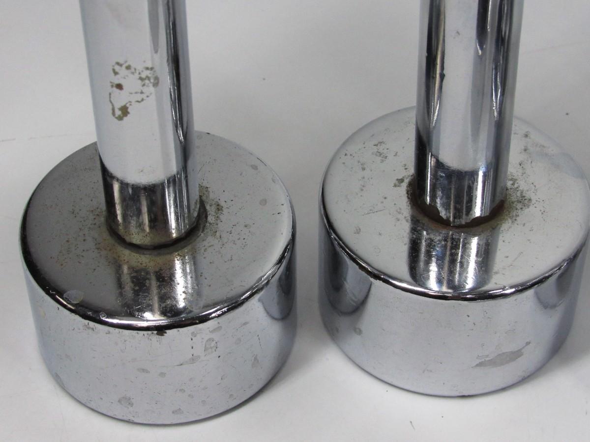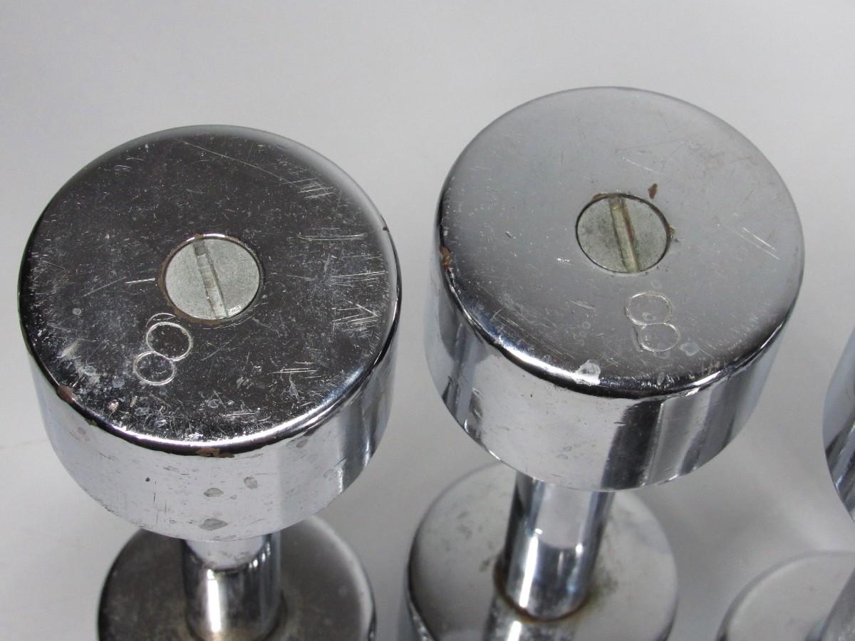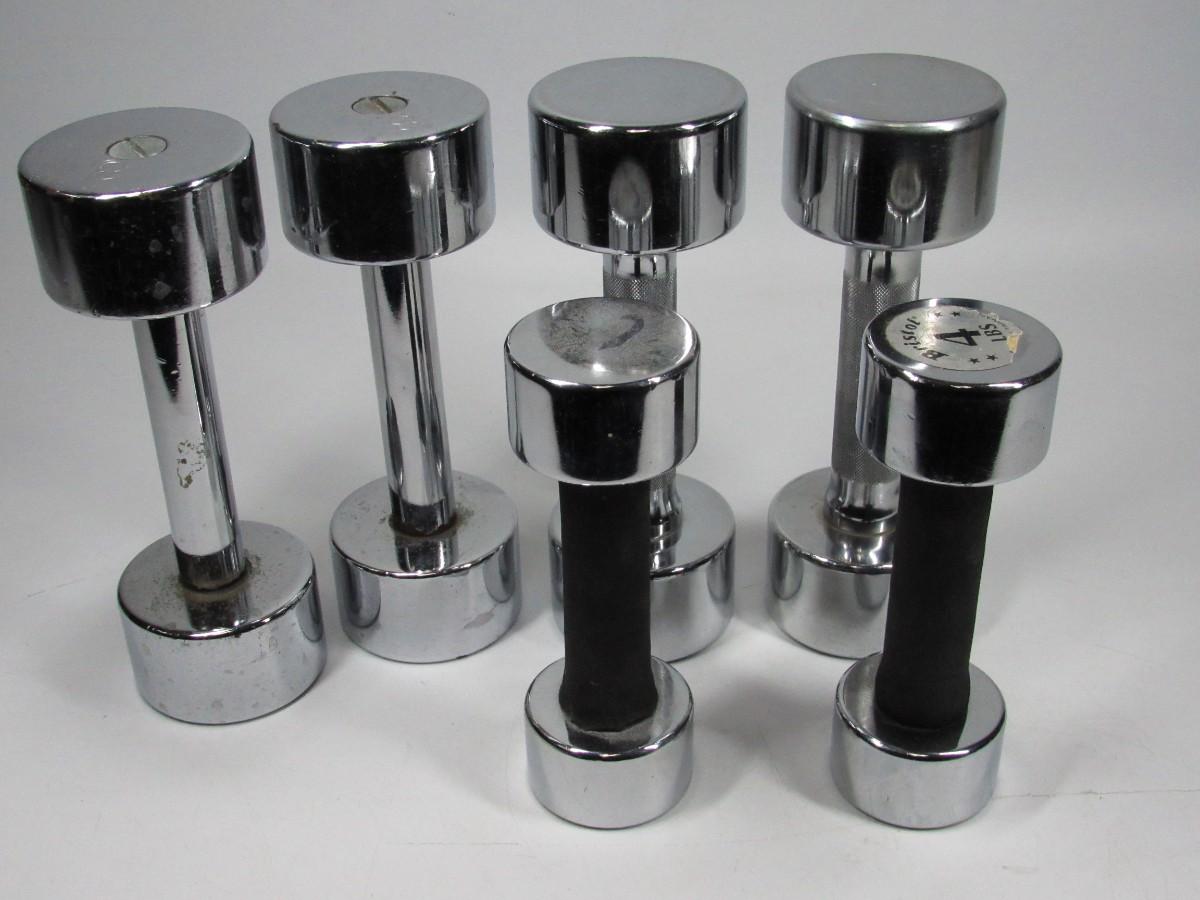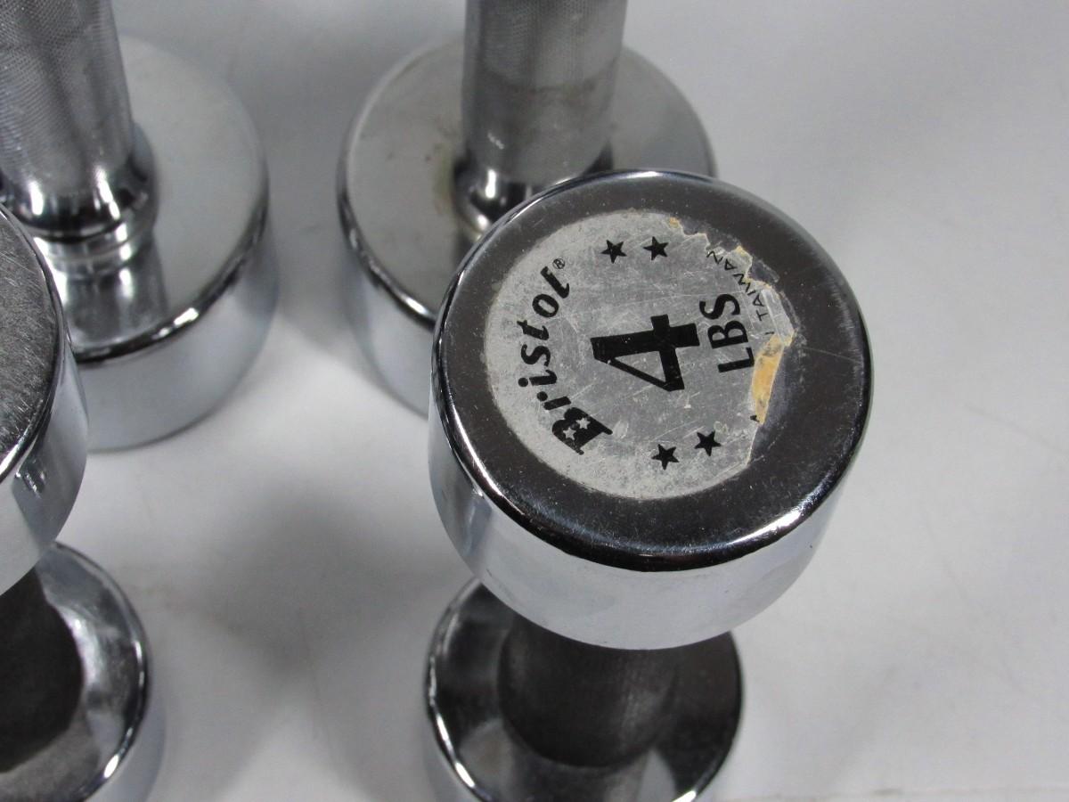 There are signs of use, but there is no significant damage and in good useable condition. Comes with four 8lb dumbbells and two 4lb dumbbells.