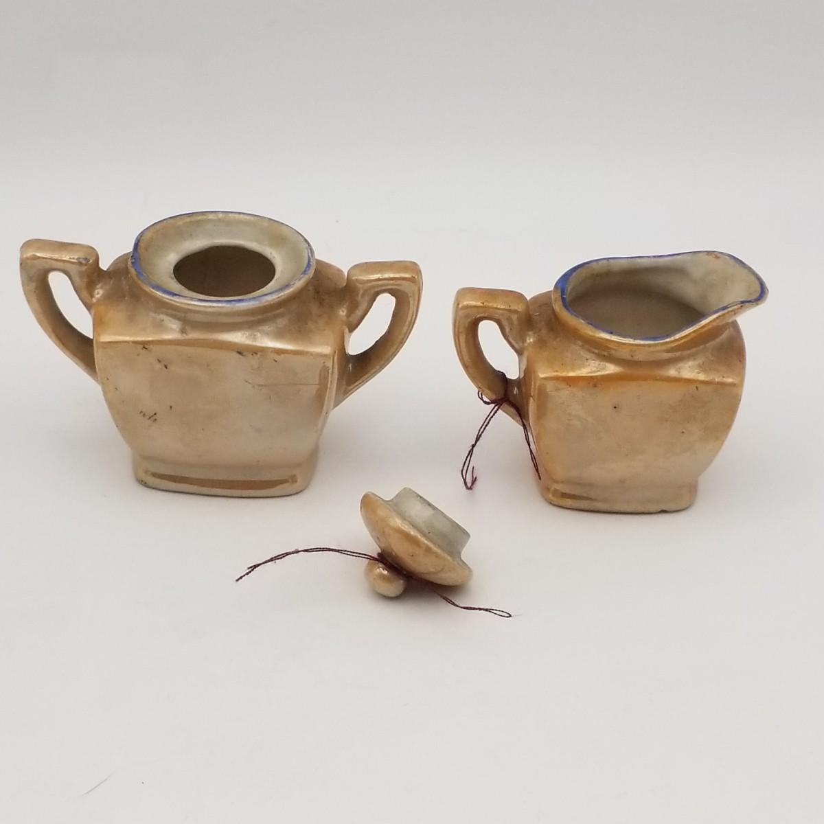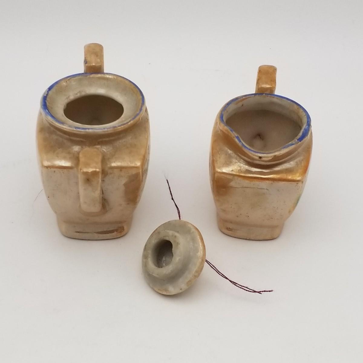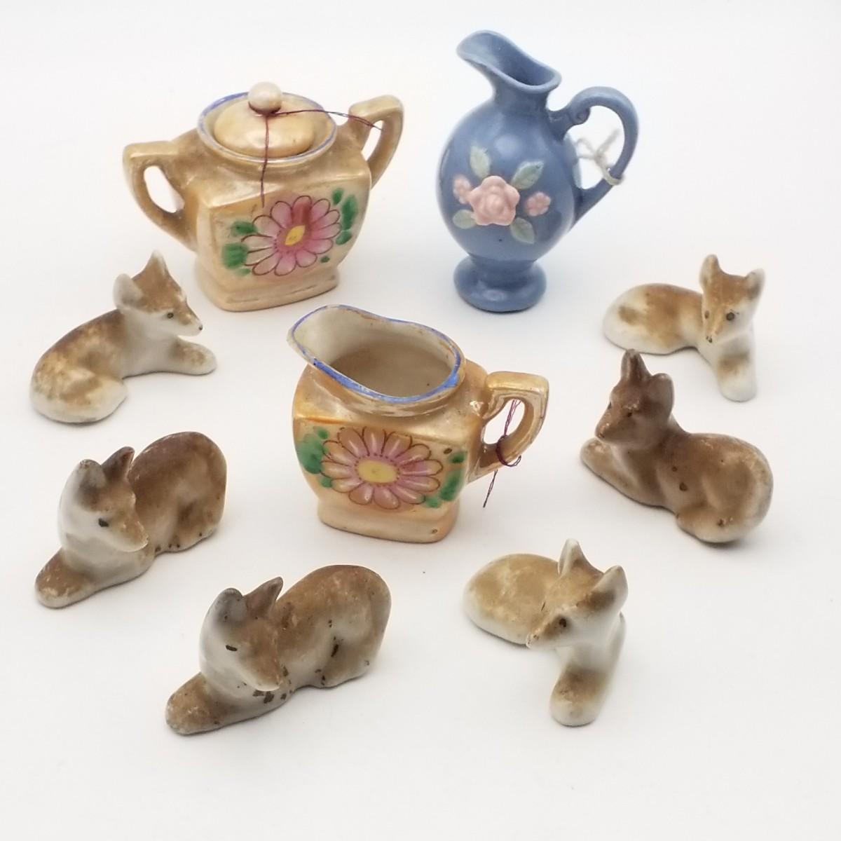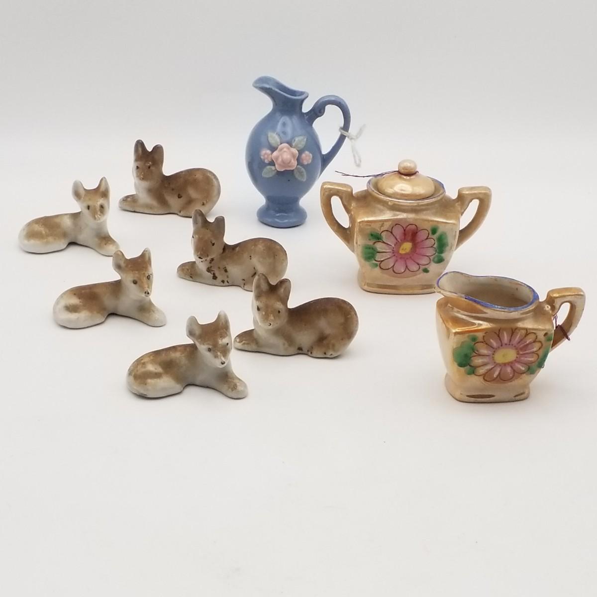 Lot of Made In Japan / Occupied Japan Miniatures Rose Pitcher Set of 6 Porcelain Dogs / Foxes, 3 Piece Peach Lusterware Bone China Children Toy Tea Set Creamer Sugar Bowl Lid NO CHIPS / CRACKS