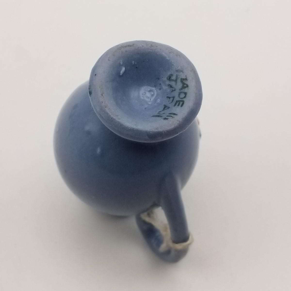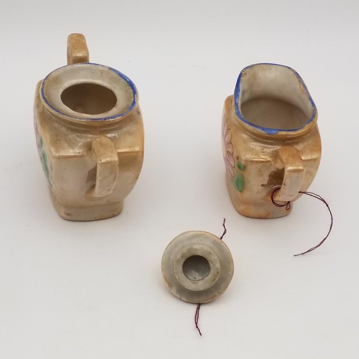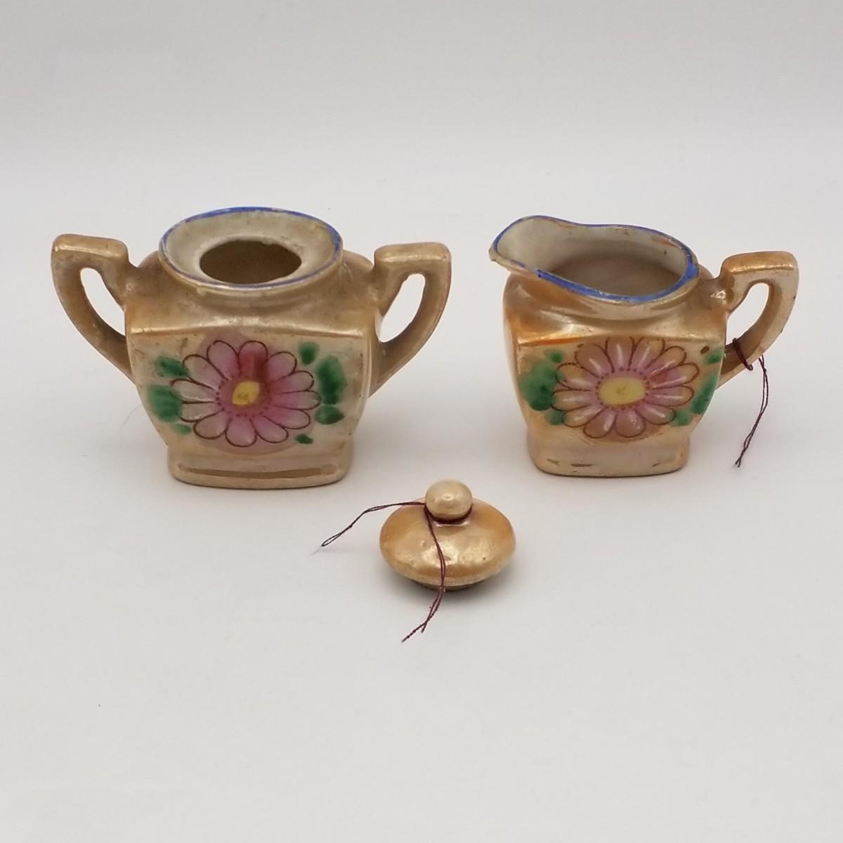 Lot of 10 Pieces Made In Japan / Made In Occupied Japan Miniatures: Flower Rose Pitcher (Blue, Green, Pink), Set of 6 Painted Porcelain Dogs or Foxes, 3 Pieces of Peach Lusterware Bone China Children Tea Set (Handpainted Floral Cherry Blossom or Chrysanthemum?) Creamer Sugar bowl With Lid