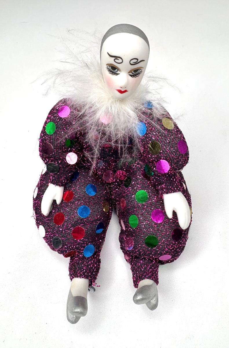 Tall doll is 8-1/2” tall x 10-1/2” deep x 7” wide. Doll on pillow is 11-1/4” tall x 7-1/2” deep x 7” wide. Blue and purple doll is 6-1/2” tall x 7” wide. Purple bald doll is 4” tall x 3-1/2” deep x 4” wide. Pink doll head is 4” tall x 6” diameter. Doll head with gold face paint is 3-3/4” wide x 3-1/2” tall. Doll head with blue face paint is 4” wide x 3-3/4” tall. Broach with full mask is 2-1/2” tall x 1-3/8” wide. Eye mask broach is 1-7/8” tall x 2” wide.