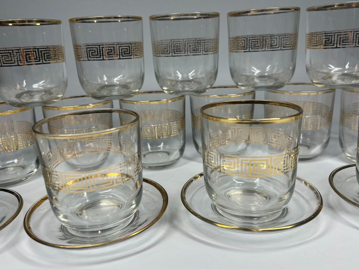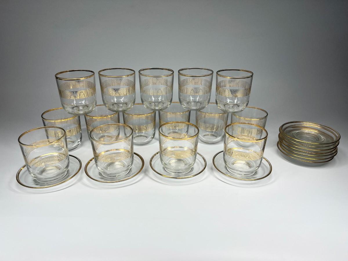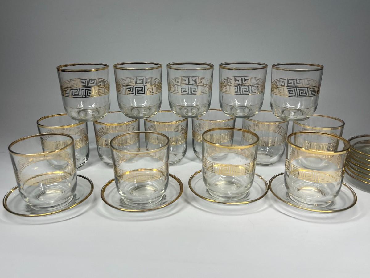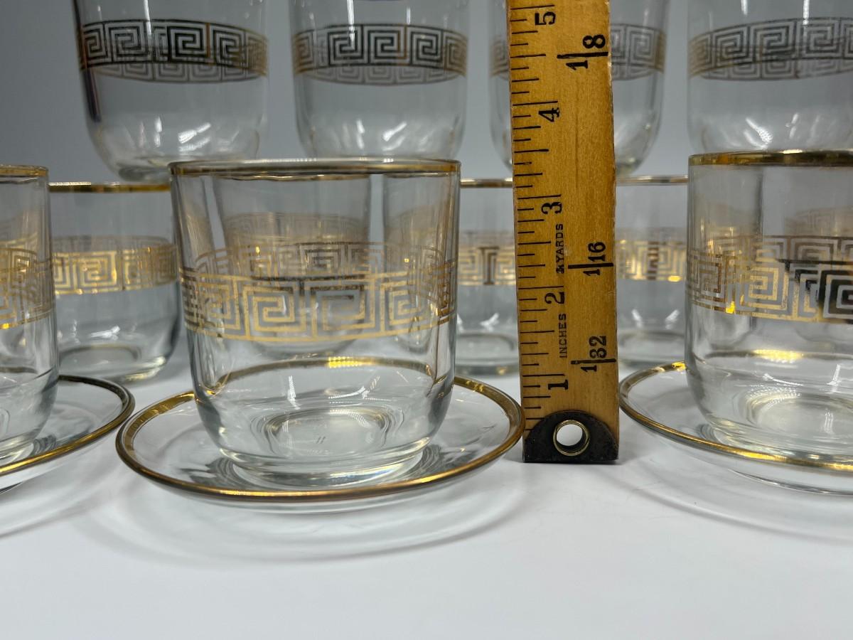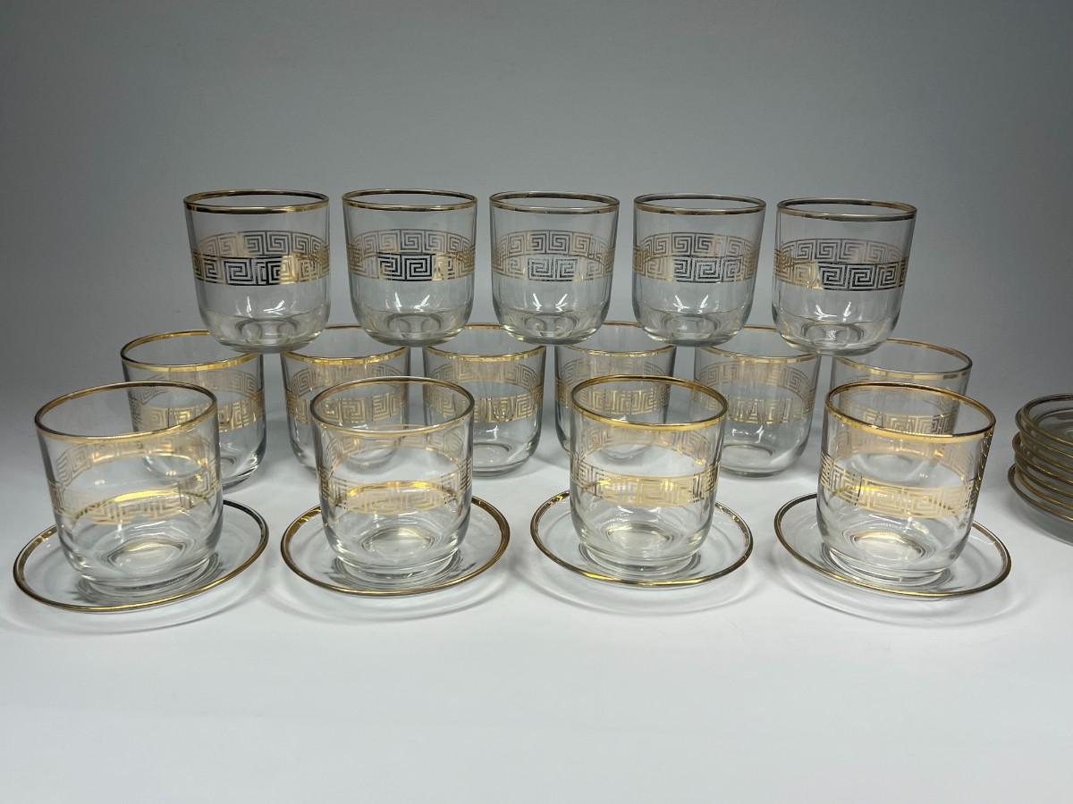 Lot of MCM Gold Key Greek Design Gold Trim Drinking Cups with Clear Glass Saucers