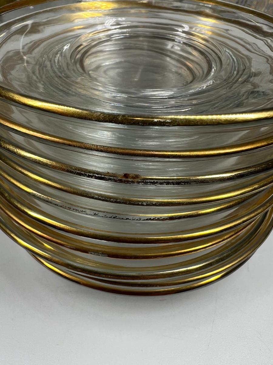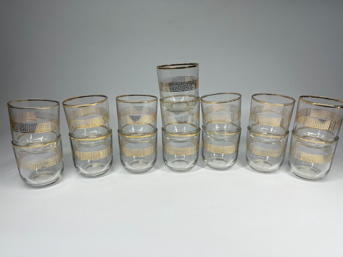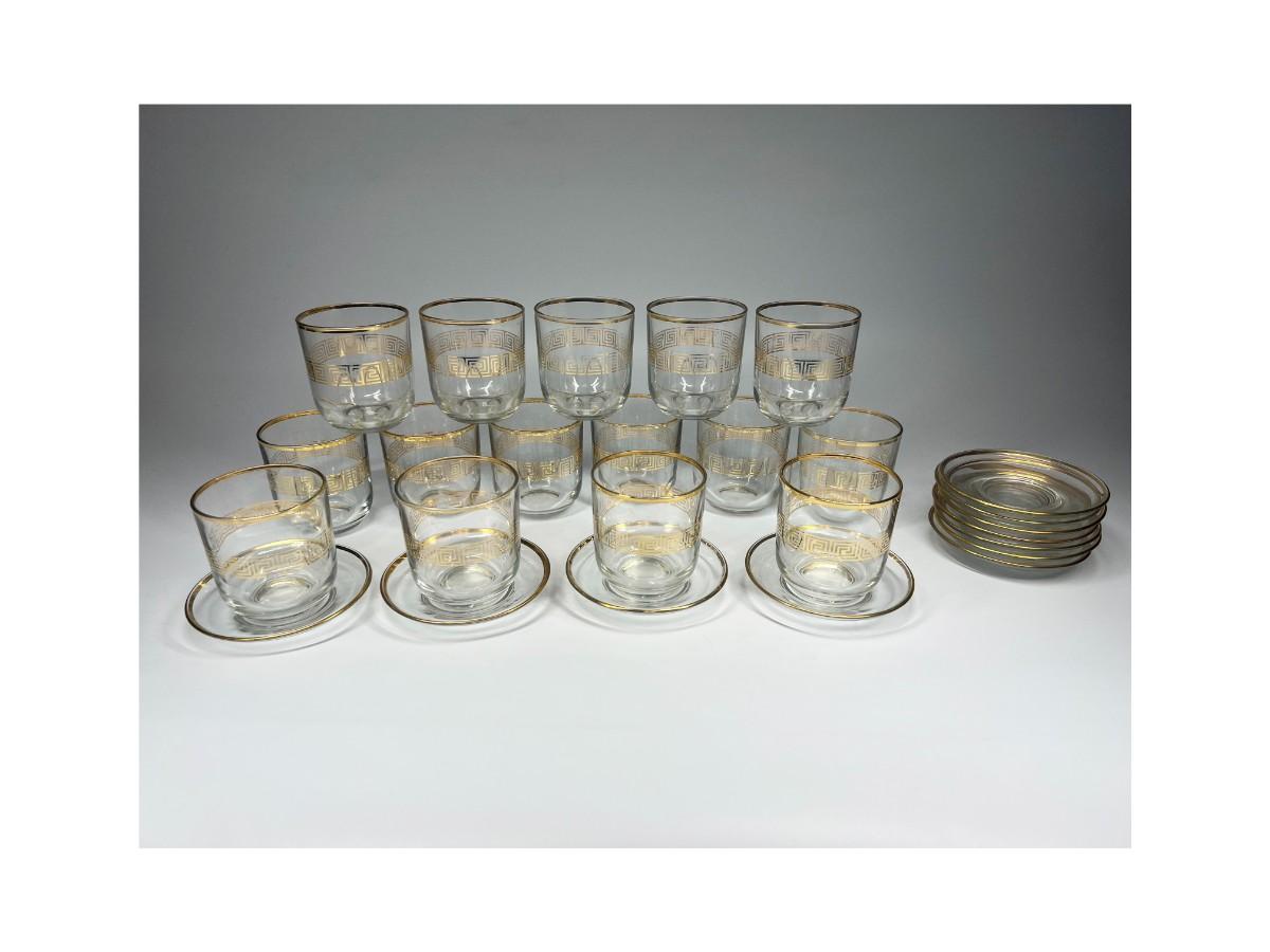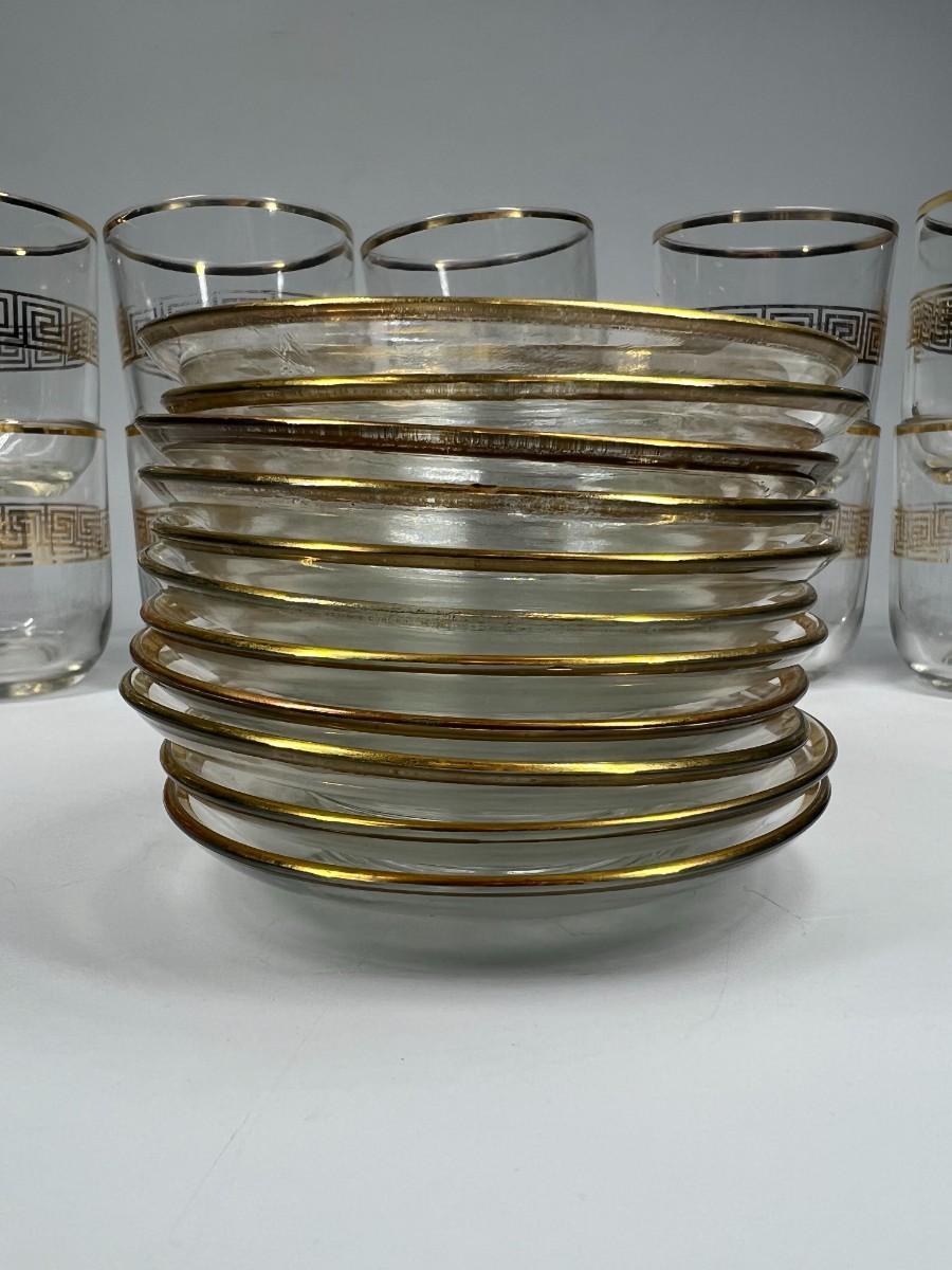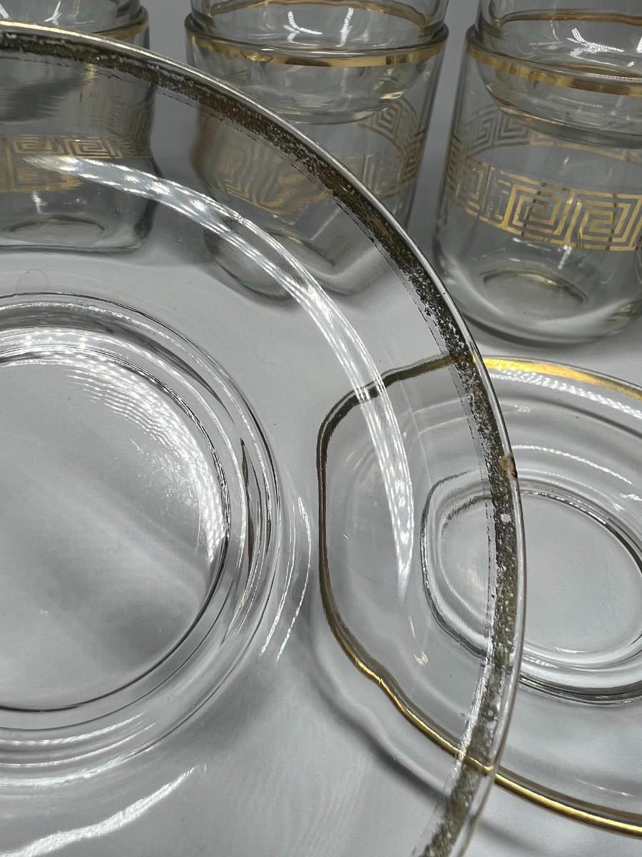 Lot of MCM Gold Key Greek Design Gold Trim Drinking Cups with Clear Glass Saucers