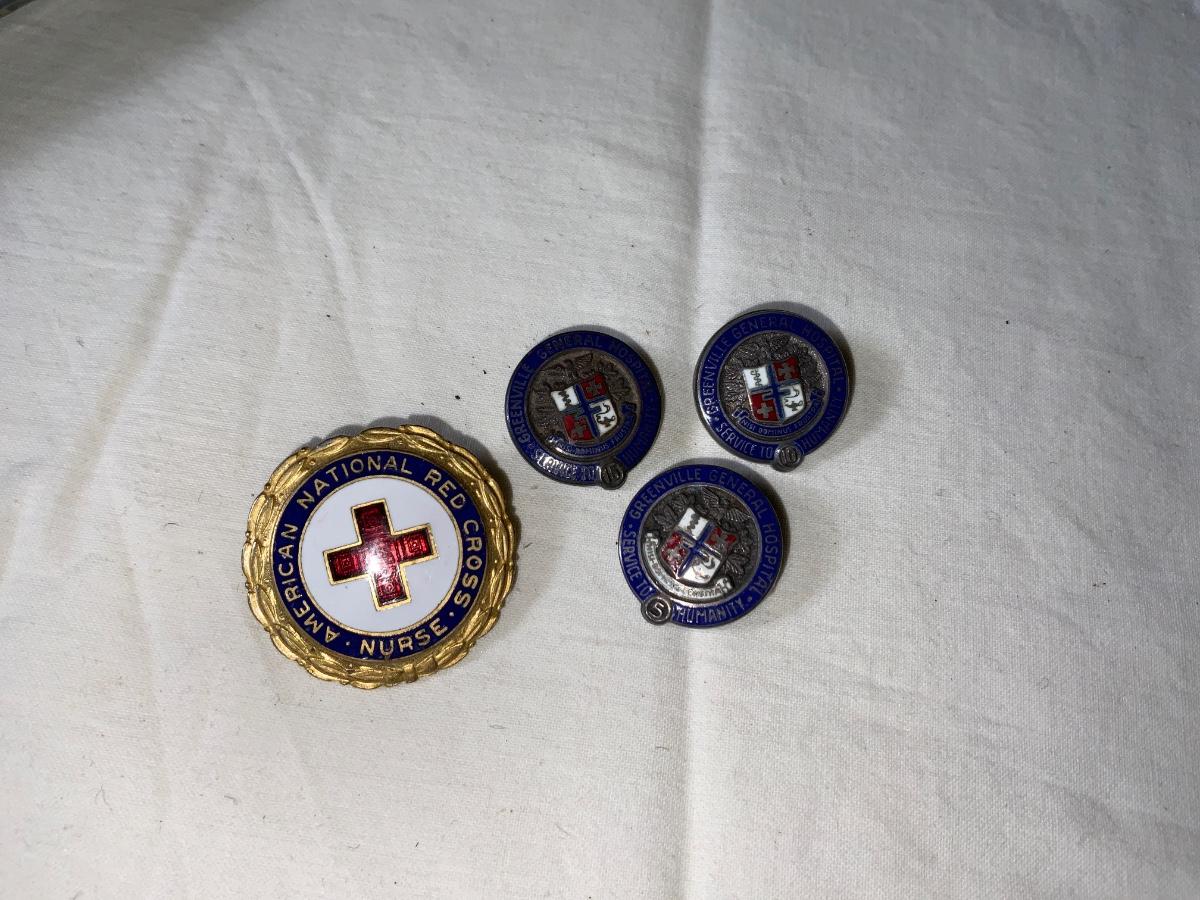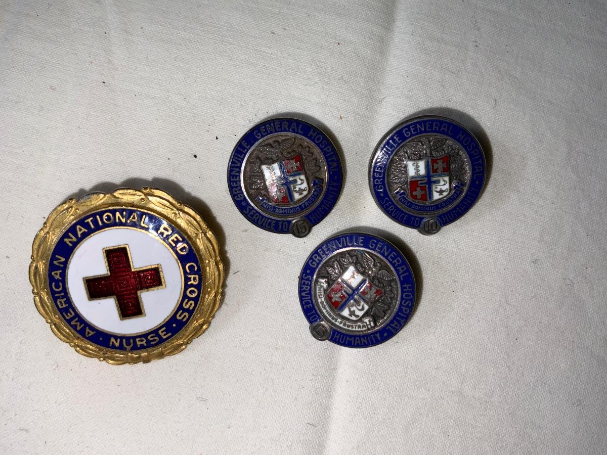 Lot of Medical related Pins. Gold toned is American National Red Cross Nurse. The other 3 ay Greenville General Hospital Service to Humanity. 2 are marked Sterling on back.