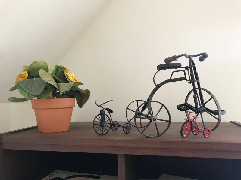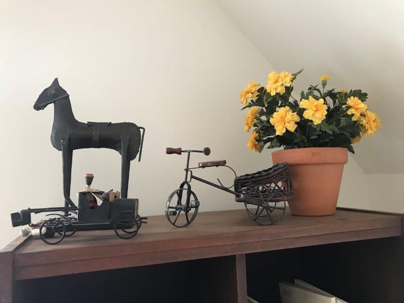 Includes metal horse, bicycles, cars, tricycles, and terra cotta flowerpots with silk flowers.