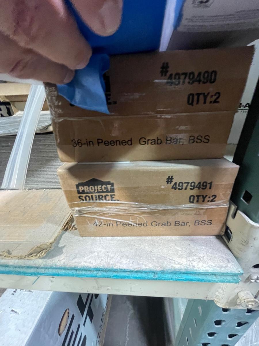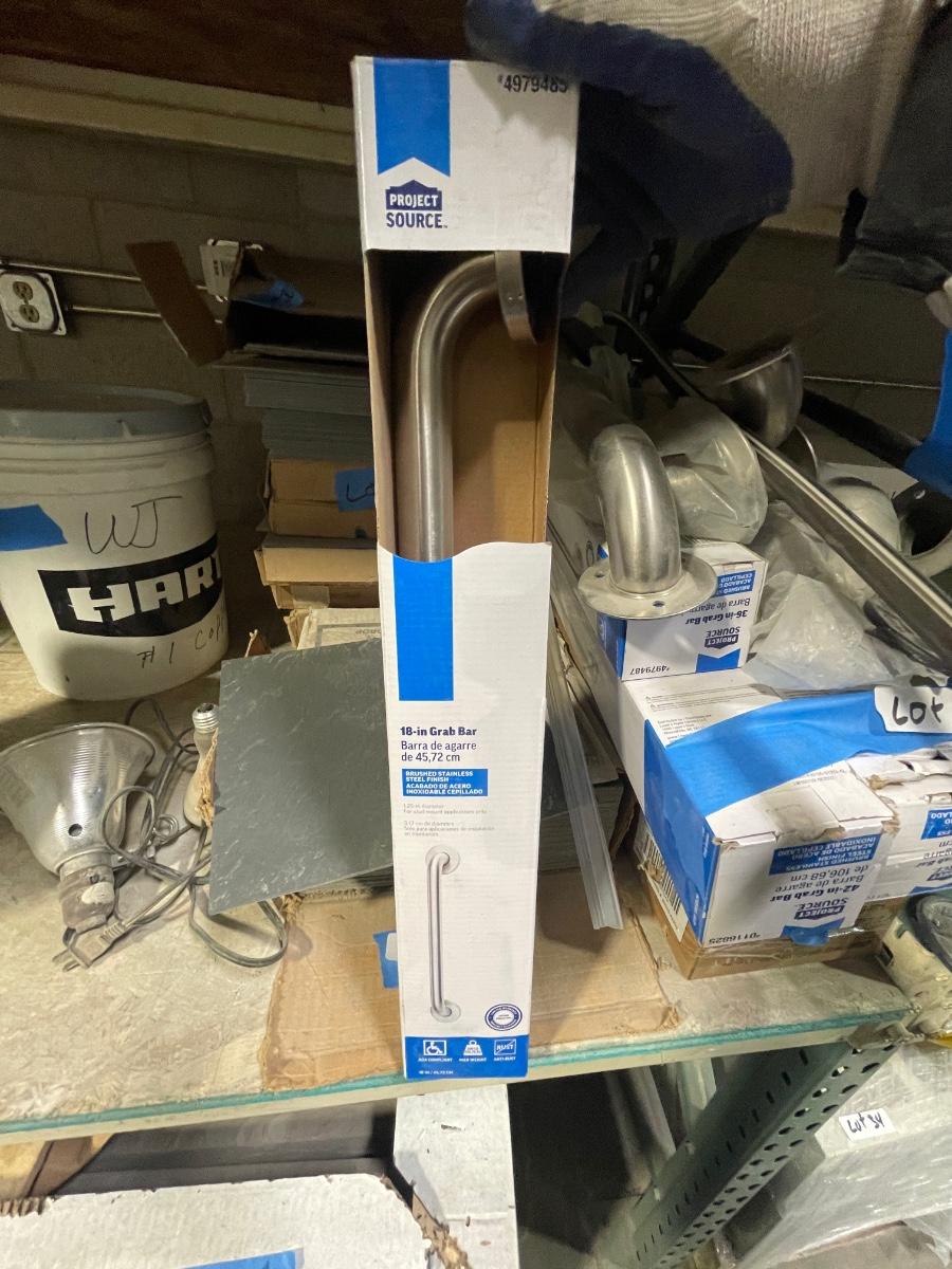 various grab bars some that are new in box - lots of various sizes included 2 Project Source 36" and 2 Project Source 42" bars and 18", 36" & 42" & another new Project Source bar as well as maybe 6 or more other loose bars