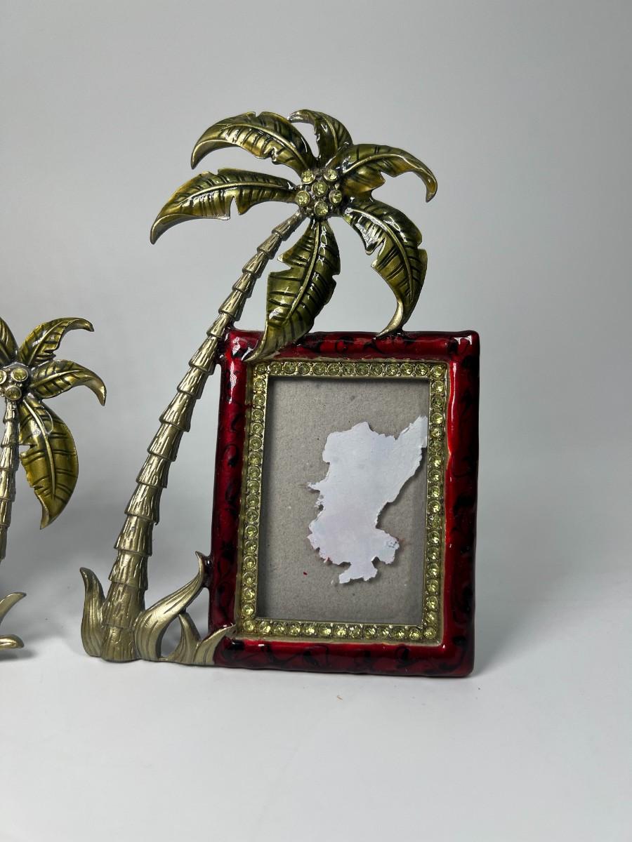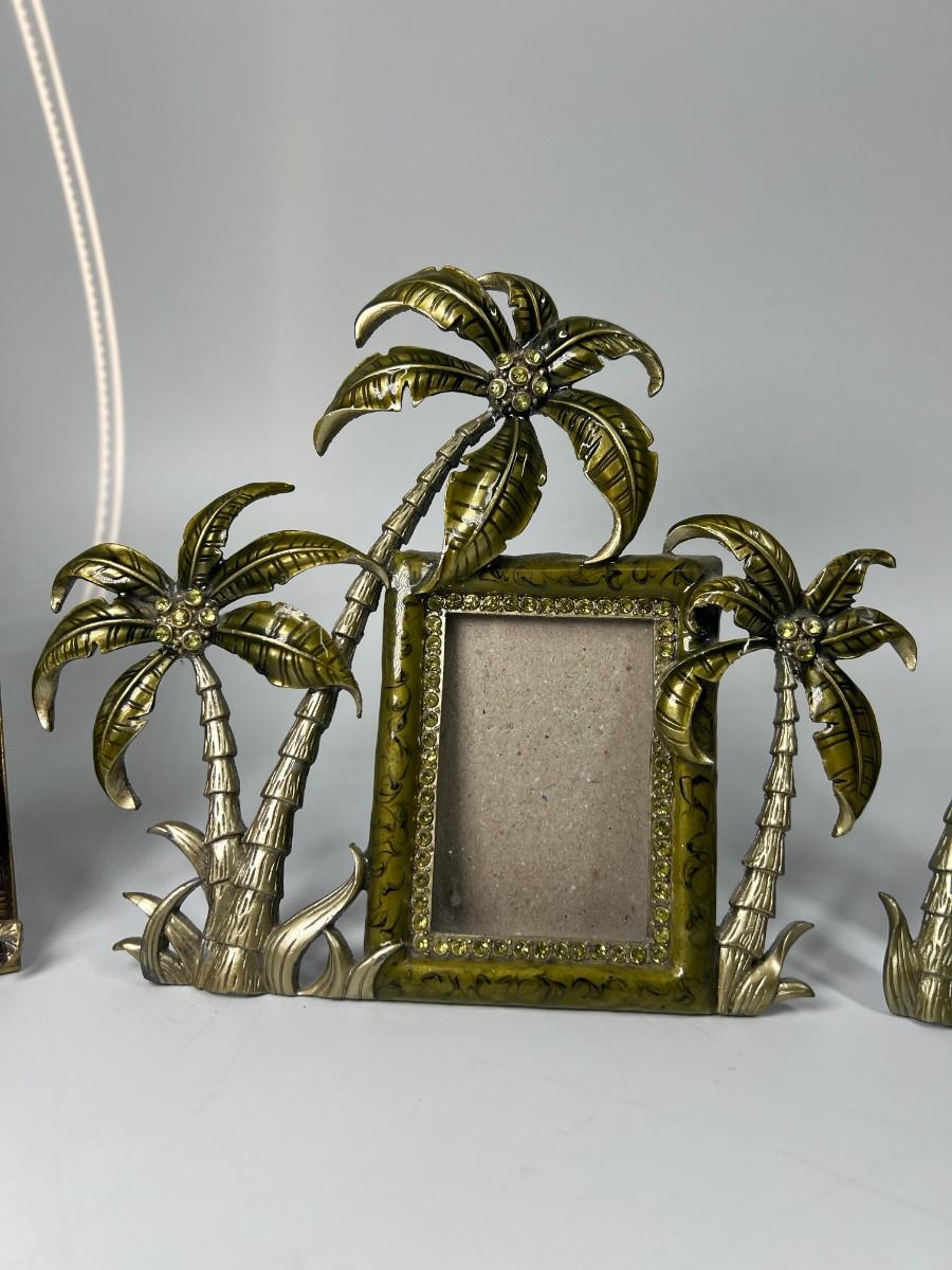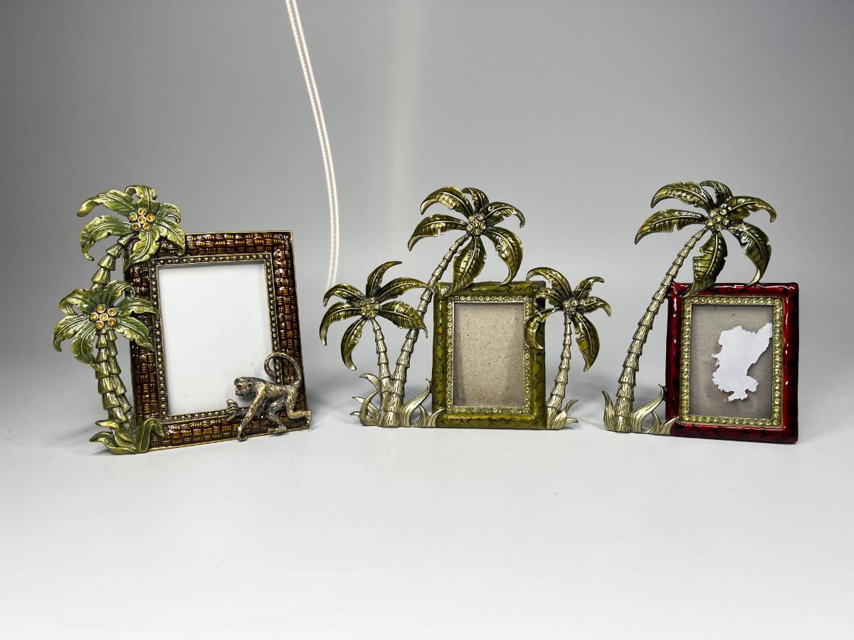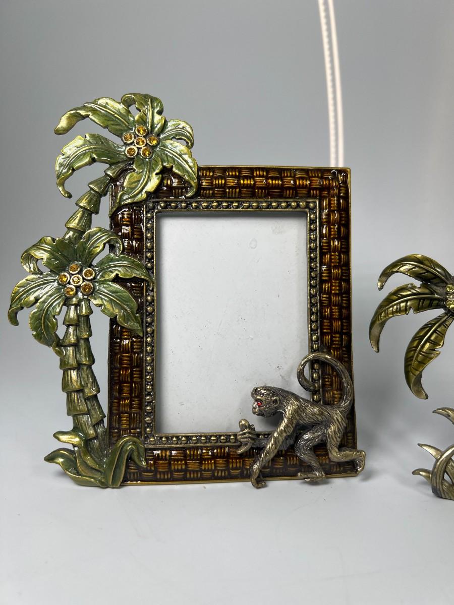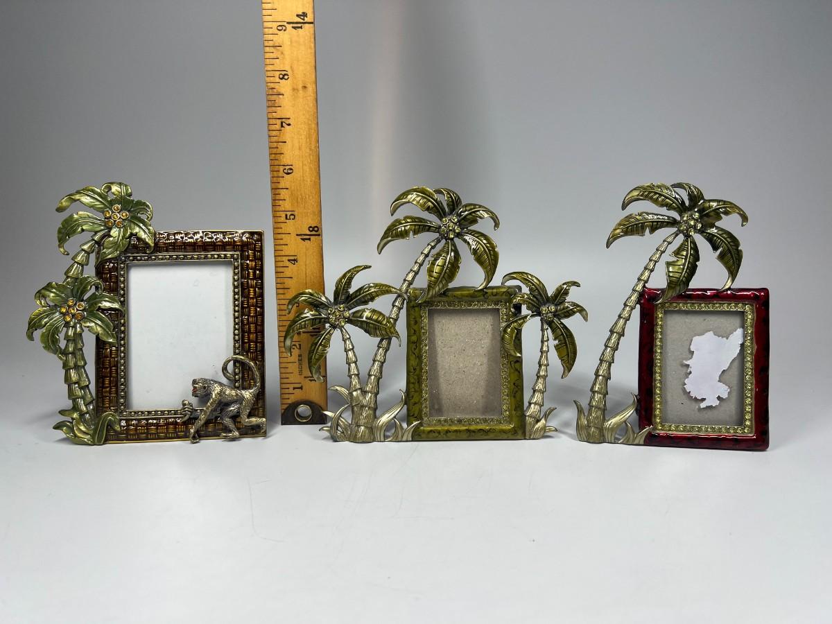 Lot of Metal Rhinestone Monkey Tropical Palm Trees Photo Frames, there is no significant damage to the metal frames and is in good displayable condition. Check pictures for more details and for sizing.