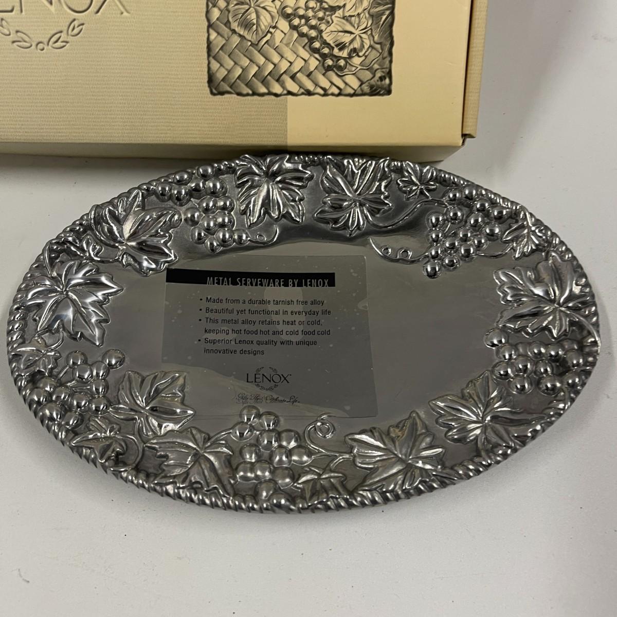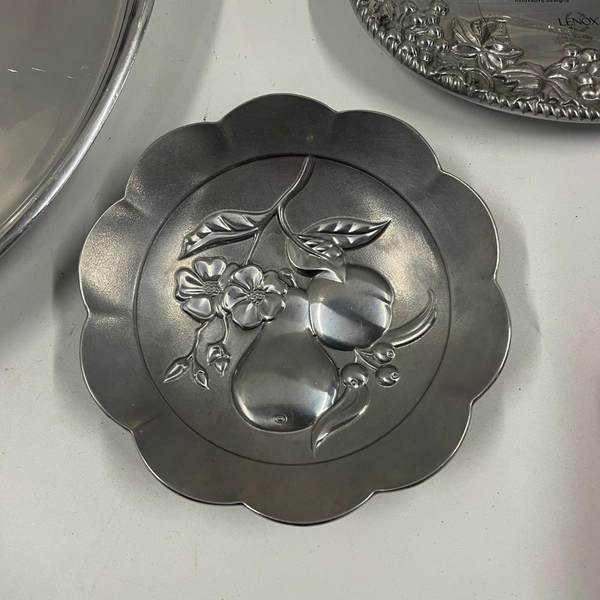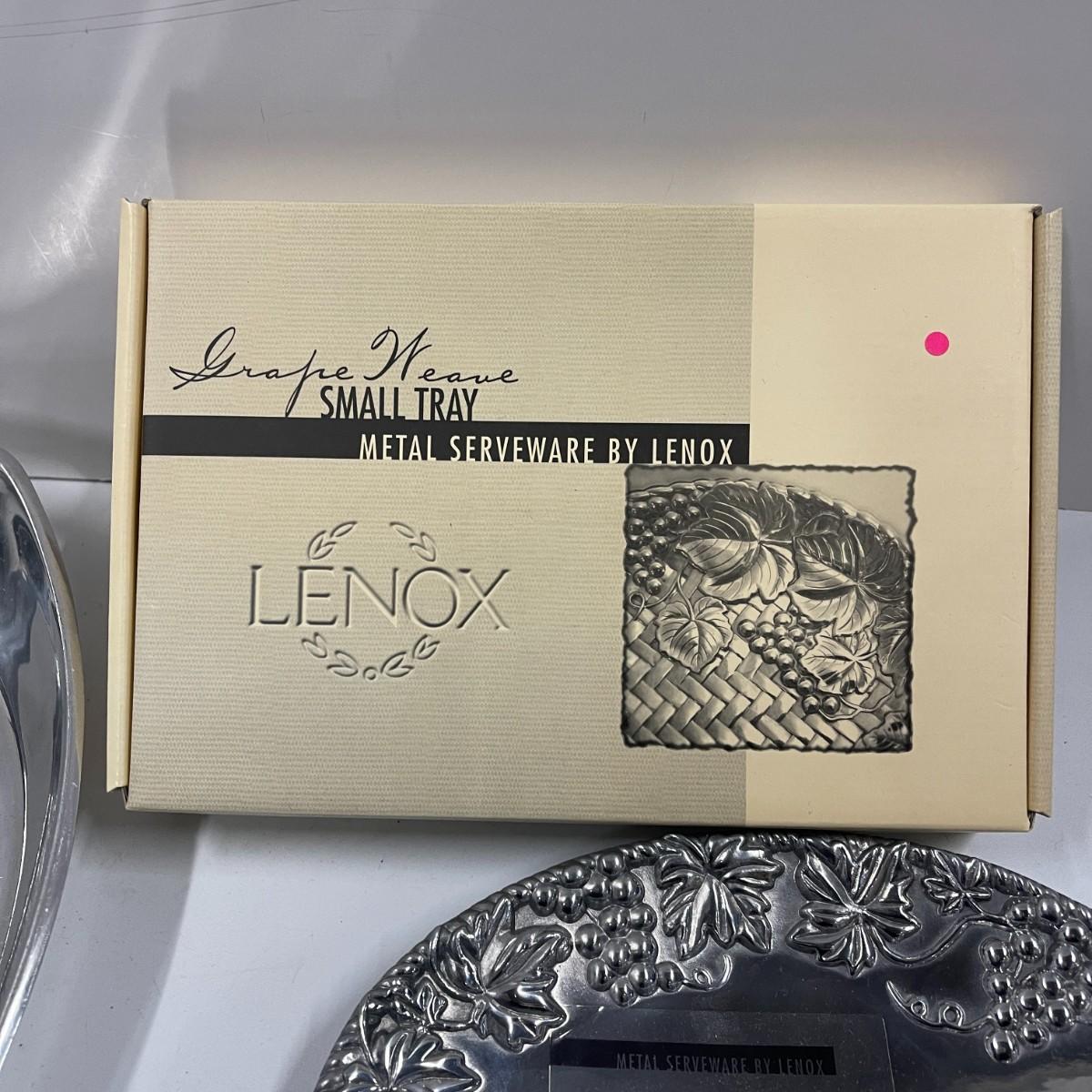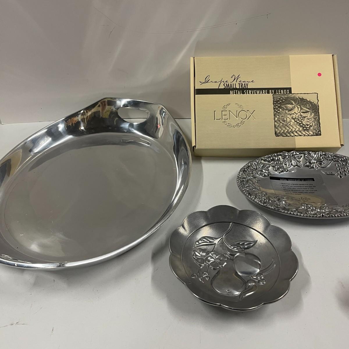 Lot of Metal Serveware by Lenox & Dansk. Includes Lenox Grape Weave small tray in new condition and in original box, Lenox Orchards in Bloom scalloped metal dish and danks Classic Fjord Chip & Dip (missing the dip)