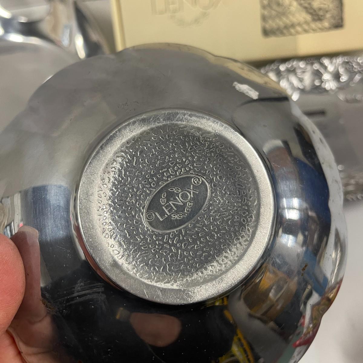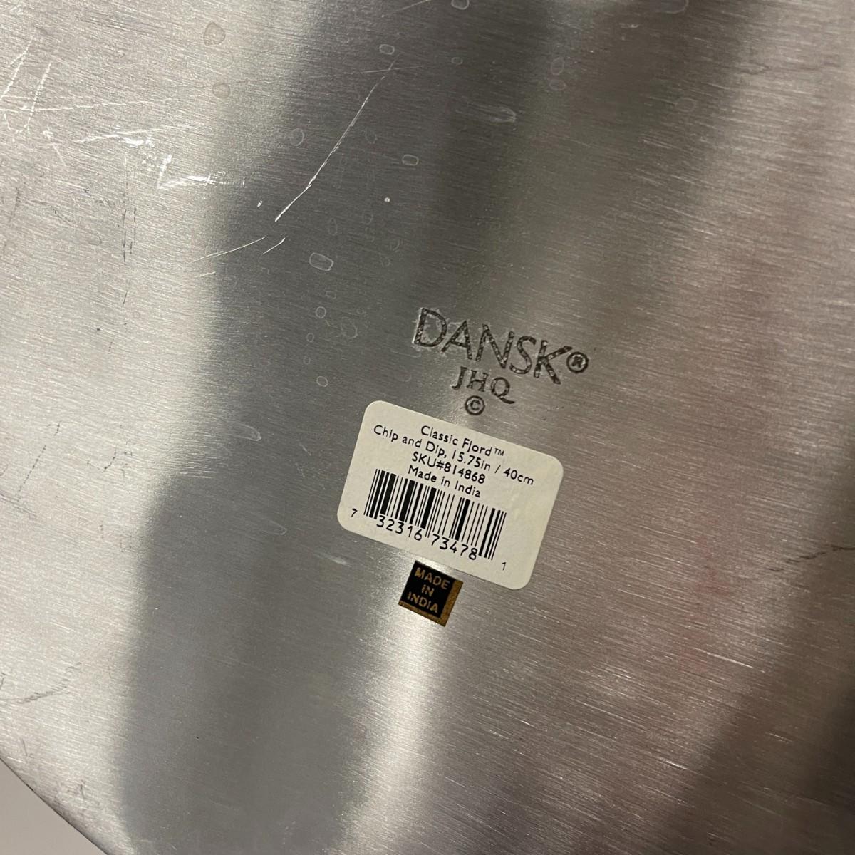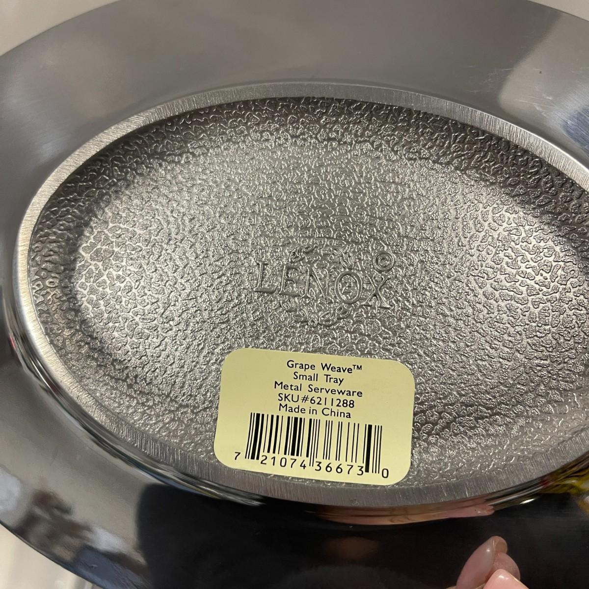 Lot of Metal Serveware by Lenox & Dansk. Includes Lenox Grape Weave small tray in new condition and in original box, Lenox Orchards in Bloom scalloped metal dish and danks Classic Fjord Chip & Dip (missing the dip)